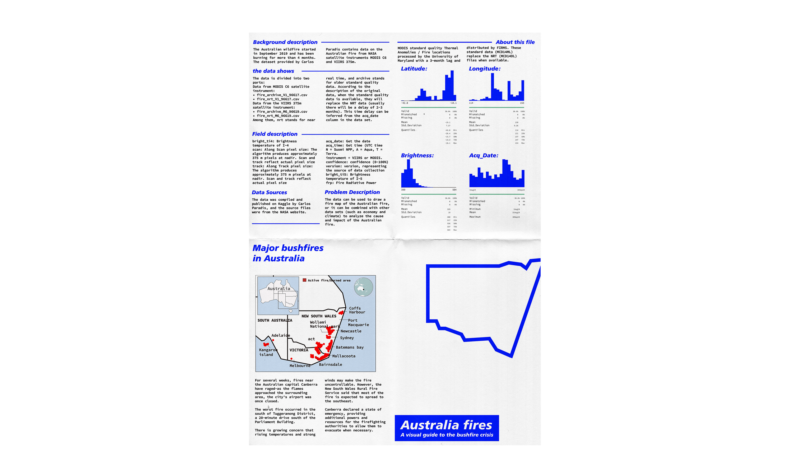 The Australian wildfire started in September 2019 and has been burning for more than 4 months. The front of this manual uses a planar approach to show the distribution of some cities in Australia where wildfires are more serious; the back includes the Australian fire data from NASA satellite instruments MODIS C6 and VIIRS 375m through this data set provided by Carlos Paradis. And perform a simple data analysis on this.