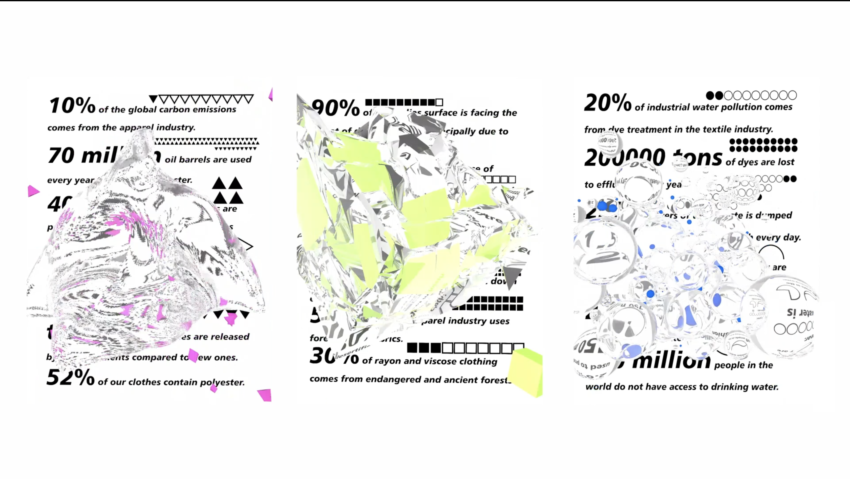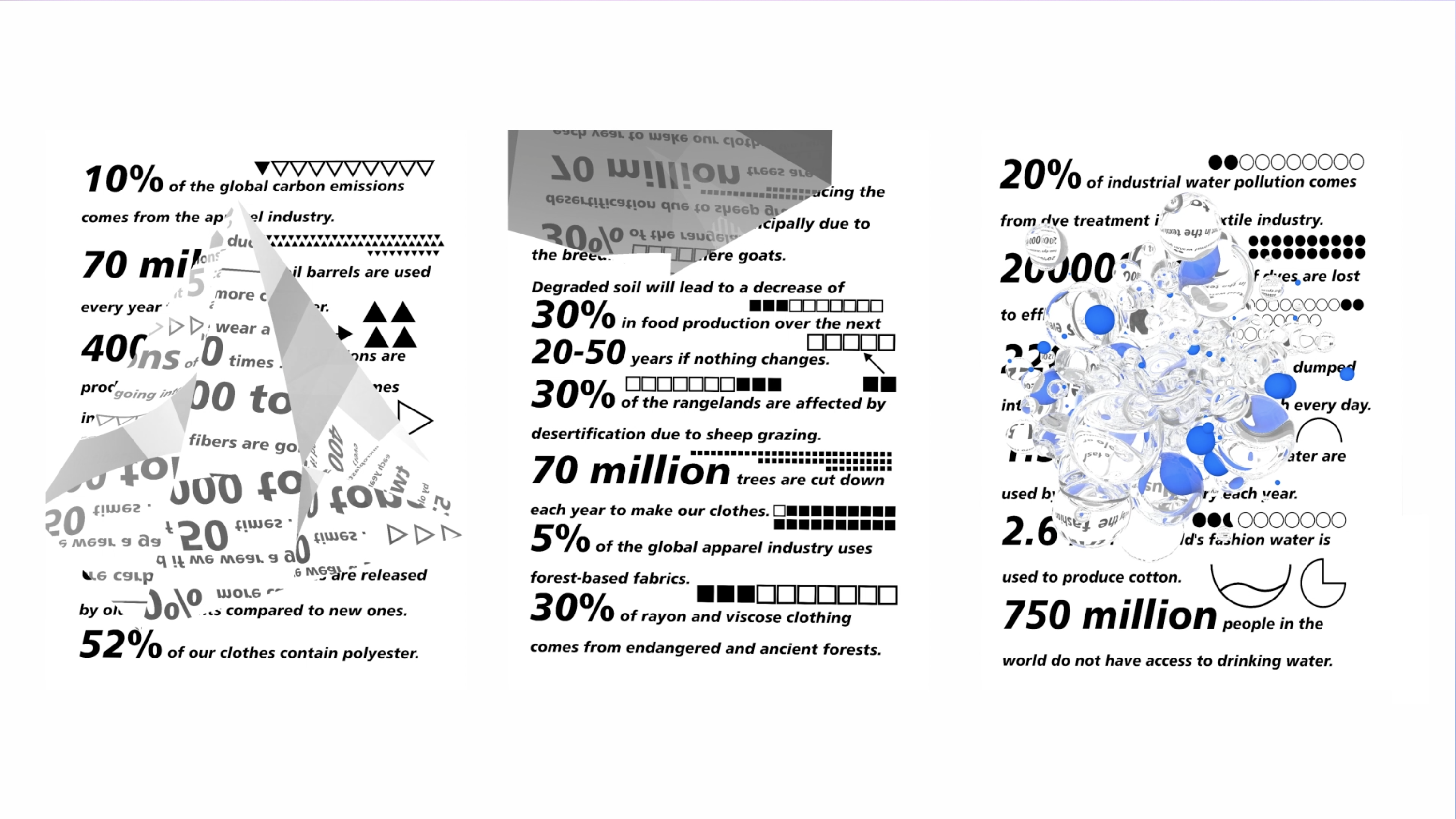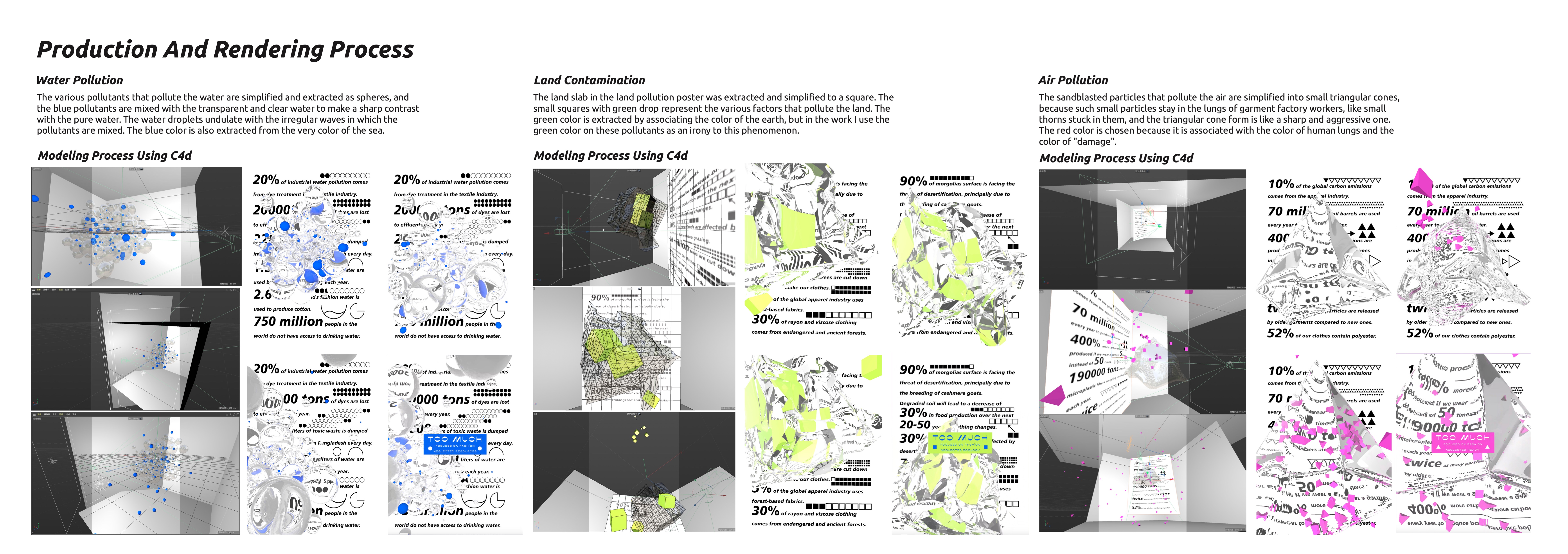 Air Pollution The sandblasted particles that pollute the air are simplified into small triangular cones, because such small particles stay in the lungs of garment factory workers, like small thorns stuck in them, and the triangular cone form is like a sharp and aggressive one. The red color is chosen because it is associated with the color of human lungs and the color of "damage".