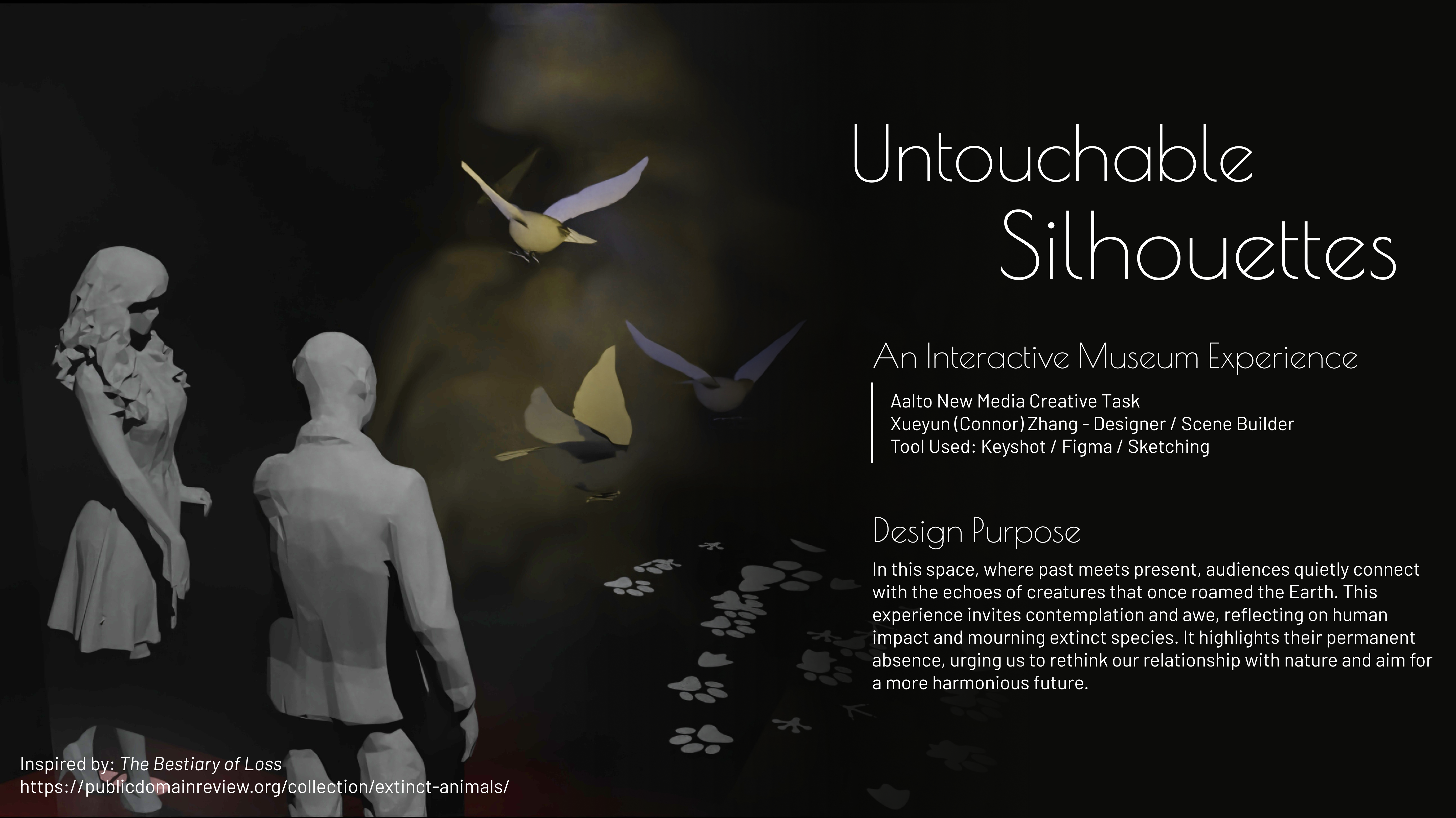 In this space, where past meets present, audiences quietly connect with the echoes of creatures that once roamed the Earth. This experience invites contemplation and awe, reflecting on human impact and mourning extinct species. It highlights their permanent absence, urging us to rethink our relationship with nature and aim for a more harmonious future. https://www.connorzhanggamedesign.com/untouchable-silhouette