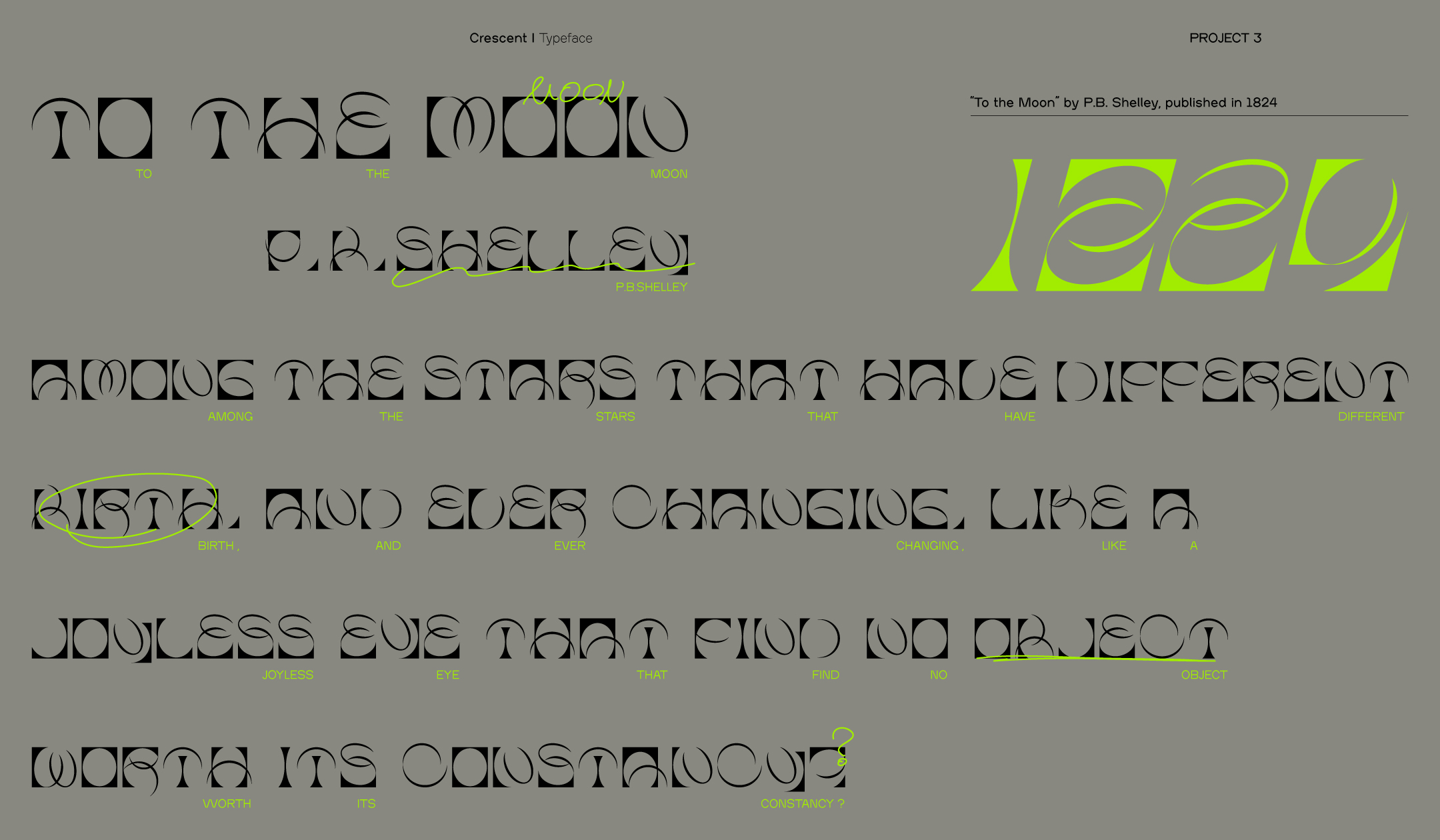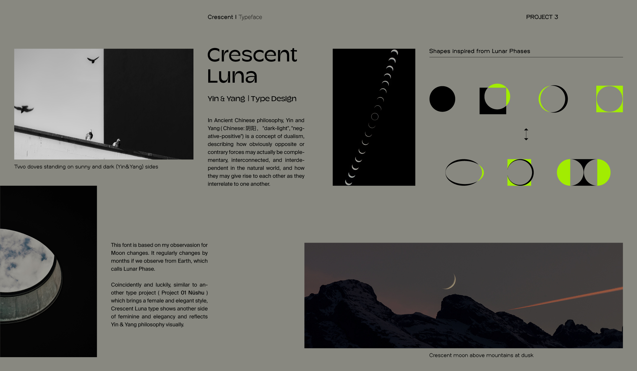This font is based on my observasion for Moon changes. It regularly changes by months if we observe from Earth, which calls Lunar Phase. Coincidently and luckily, similar to another type project ( Project Nüshu ) which brings a female and elegant style, Crescent Luna type shows another side of feminine and elegancy and reflects Yin & Yang philosophy visually.