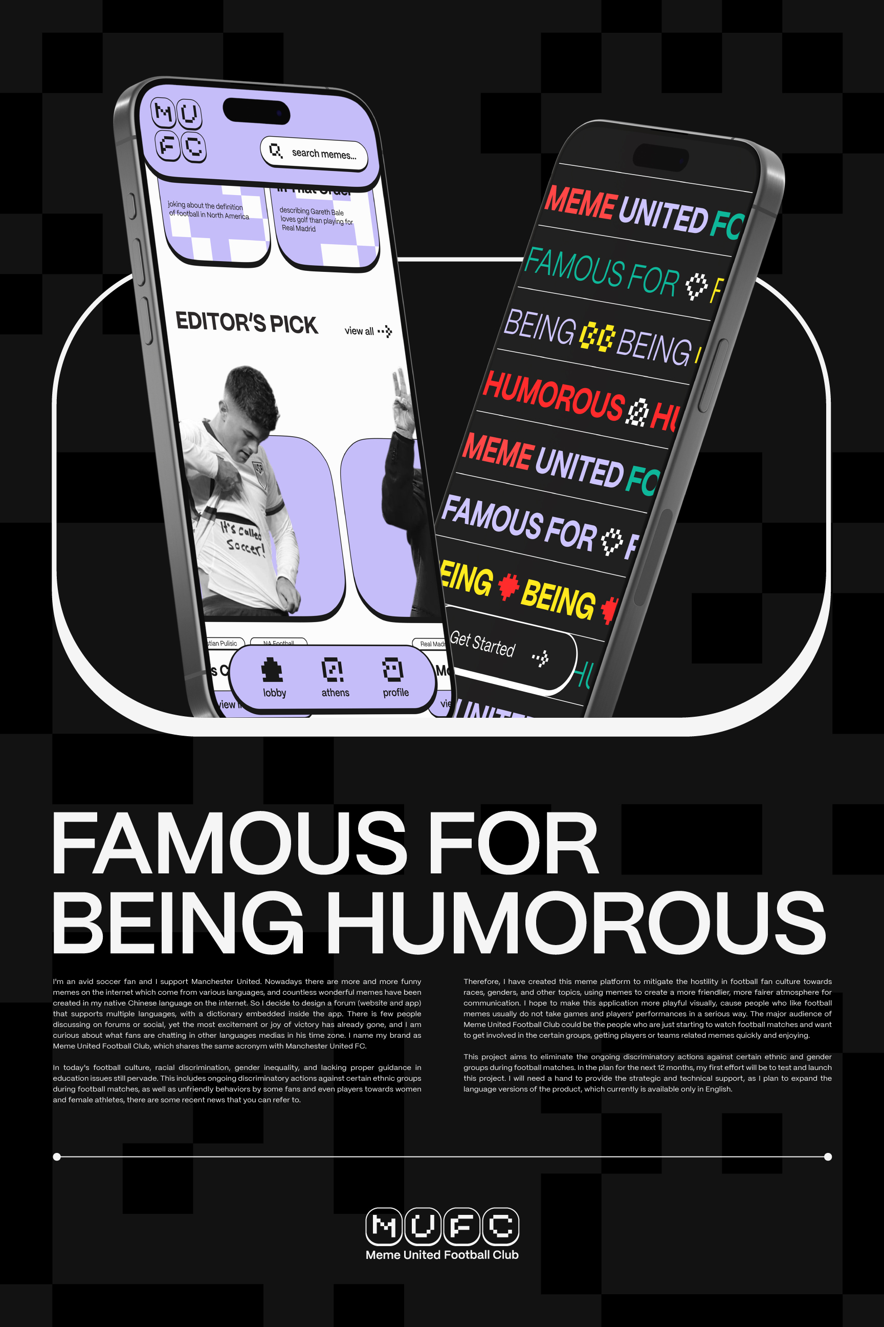This project shows one of my life long passion. Which is football(soccer), I'm a soccer fan and I like to read all kinds of interesting posts online after the matches, no matter win or lose, all very funny! Now there are numerous funny memes on the internet coming from various languages. So I decided to design a forum (website and app) that supports memes in multiple languages, named after meme united football club which shares the same acronym with the soccer team that I support.