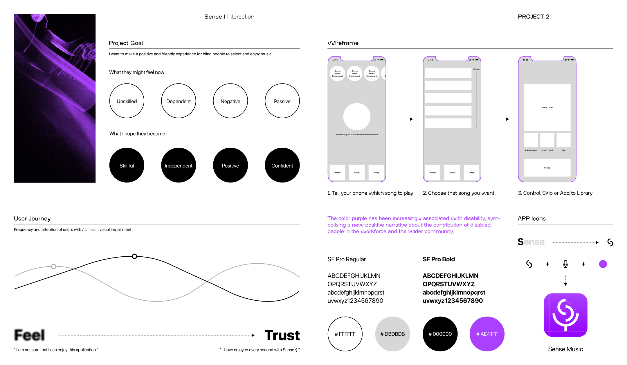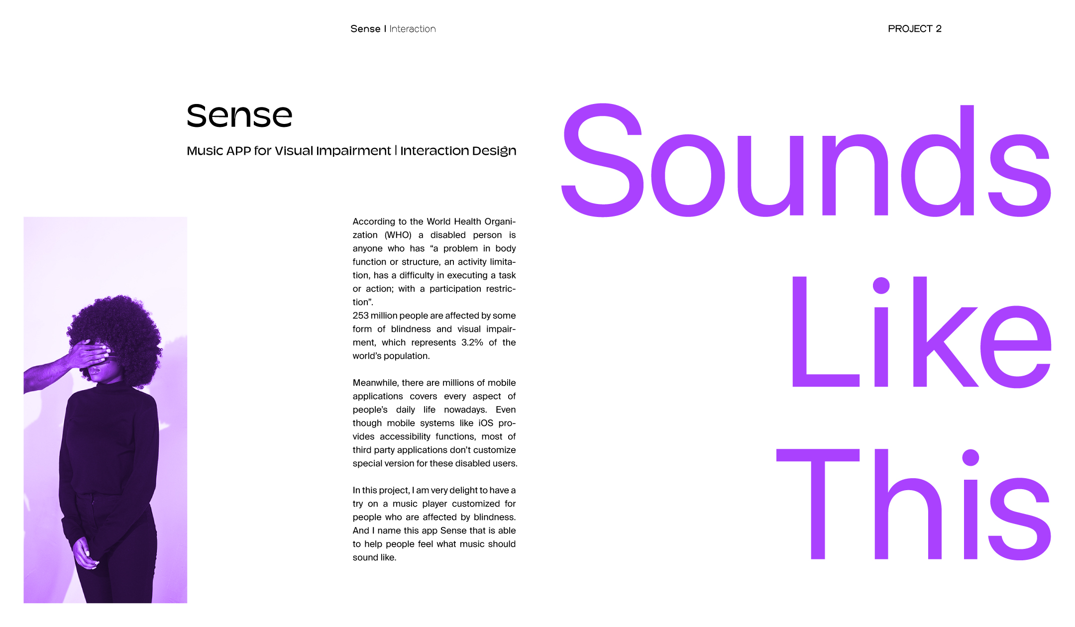 In this project, I am very delight to have a try on a music player customized for people who are affected by blindness. And I name this app Sense that is able to help people feel what music should sound like.