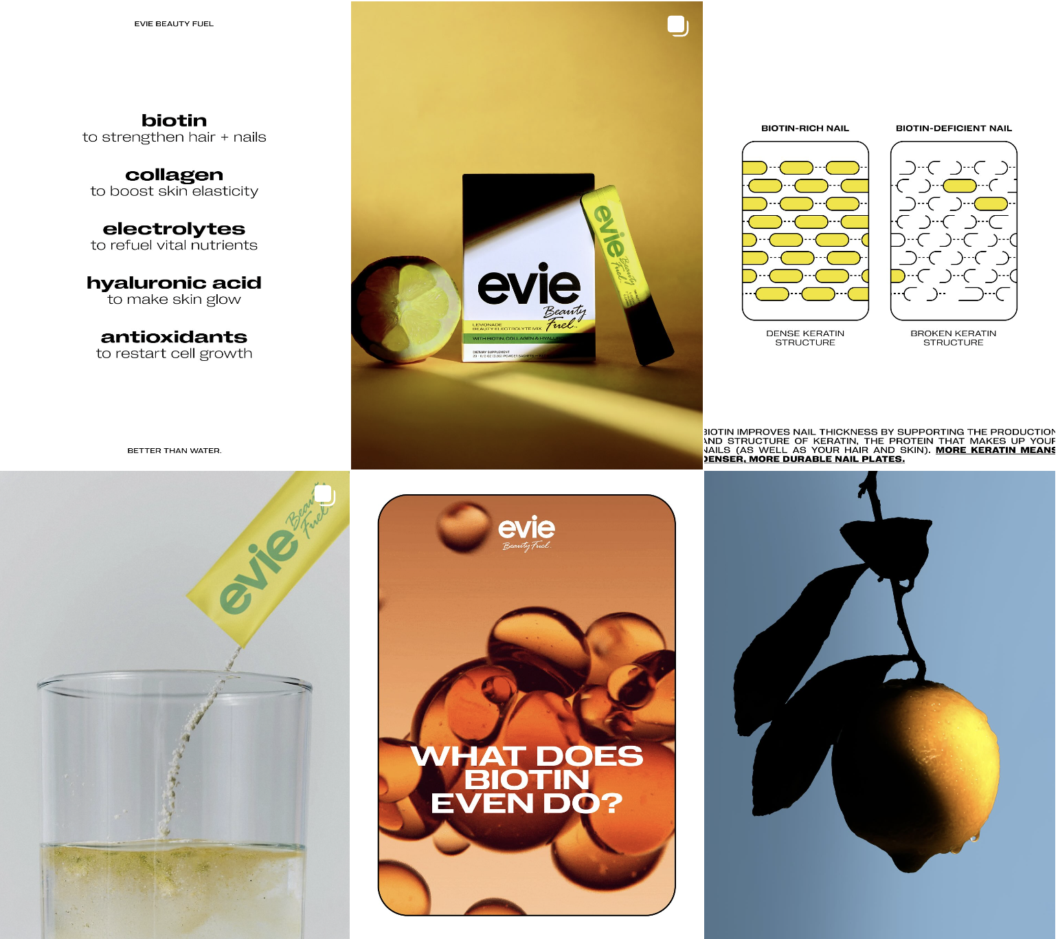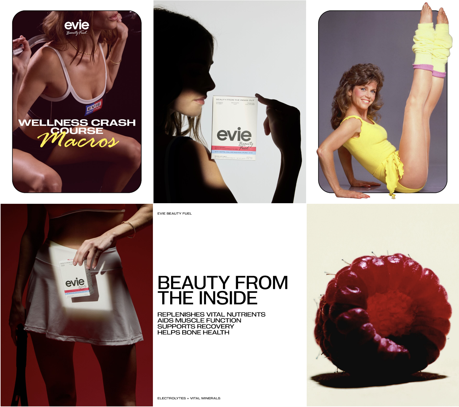 In a world of health products, Evie takes a new approach by optimizing vitamins and vibes over hard-body hyper-athleticism. Rather than making Evie's fitness fans feel like they need to be Olympian-level athletes, the brand leans in to aura maximizing and the glow-up we are all capable of.