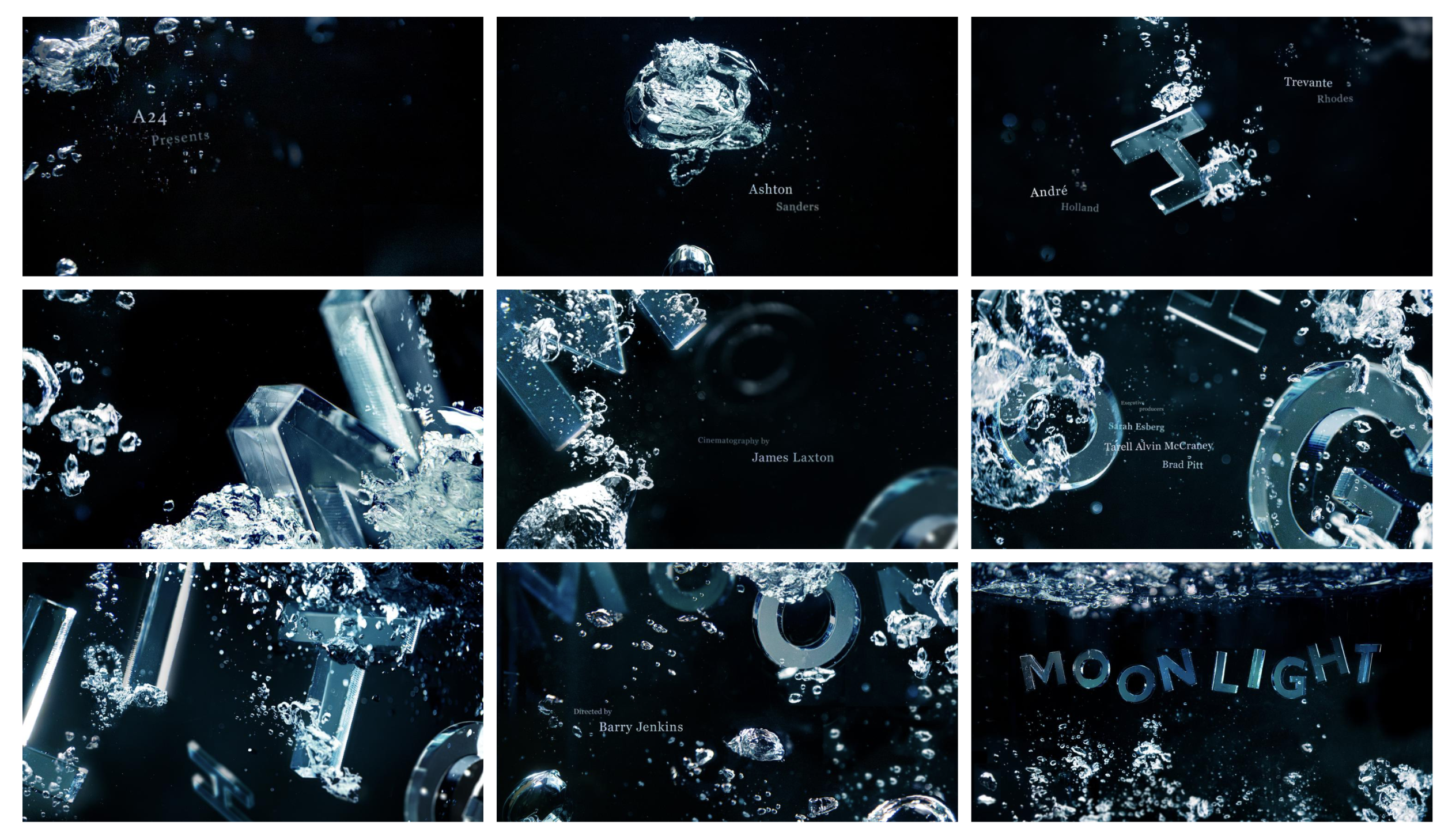 I used acrylic type forms for the letters and attached them to strings to float in the water. Then, using a rubber hose, bubbles were blown to give the type a feeling of movement and to show that they were floating up. Afterwards, color grading and photocomping was done to erase the strings and change the environment that it was orginally shot in. The result was a dark and immersive sequence showing the rise of the type to represent Chiron’s acceptance for who he is.