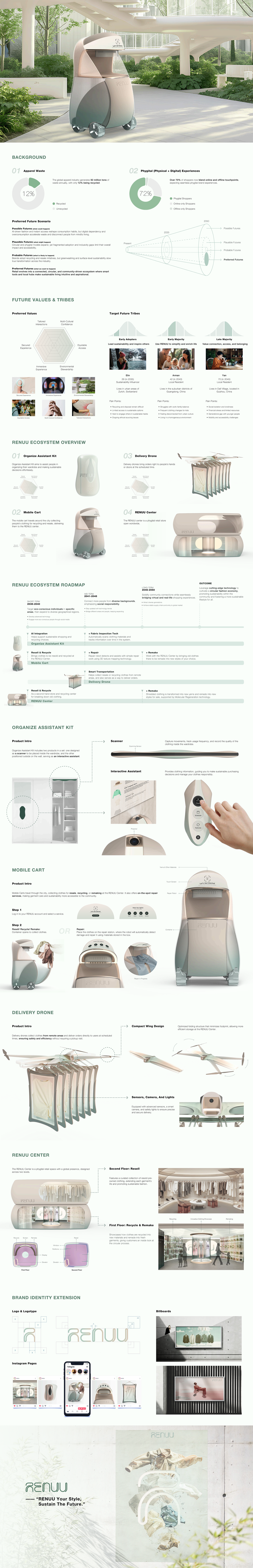 RENUU is a circular retail ecosystem that closes the loop of repairing, recycling, remaking, and reselling clothing. By combining smart tools, mobile services, and immersive centers, it makes sustainable living effortless, inclusive, and aspirational for future communities.