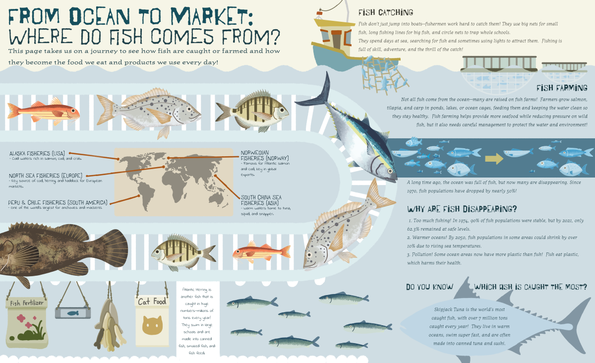 This project is a non-fiction educational picture book that introduces children to the journey of fish from the ocean to the market, and how they become part of our everyday lives.