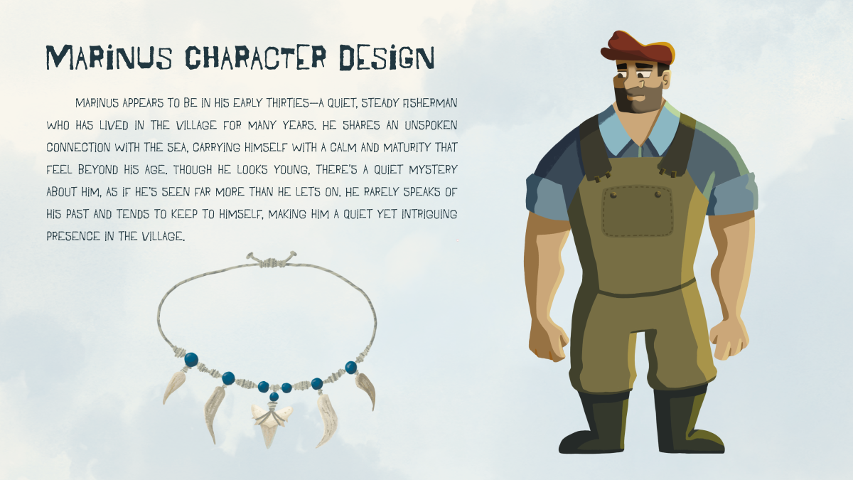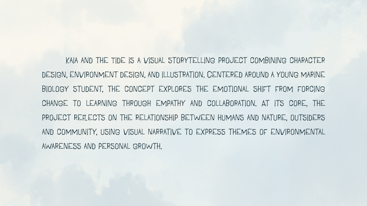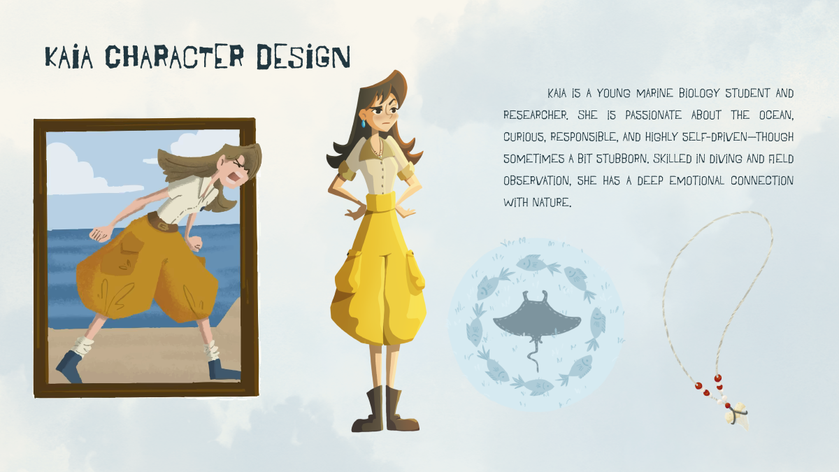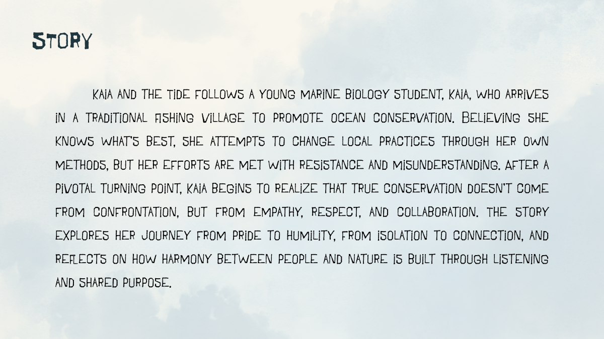 Kaia and the Tide" is a visual development project about a young marine biology student who arrives in a quiet fishing village—and unintentionally stirs up tension between science, tradition, and the sea. The story explores environmental responsibility, empathy, and the clash between progress and preservation.