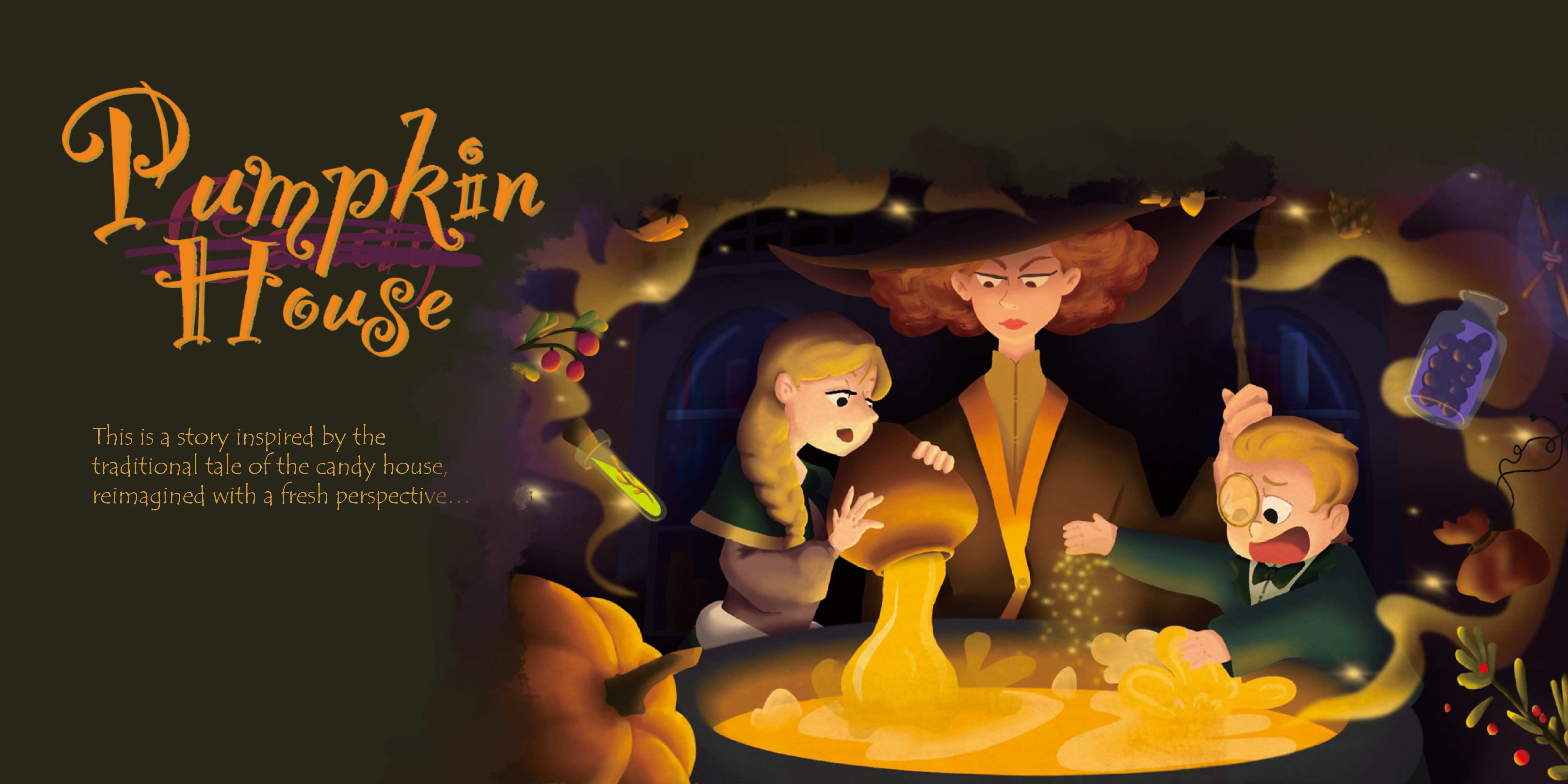 Pumpkin House” is a personal visual development project that reimagines Hansel and Gretel.Instead of a villain and misbehaving children, the story explores isolation, quiet empathy, and misunderstood kindness. At its center is a magical walking pumpkin house—both whimsical and melancholic. Through character, environment, and interior design, the project reflects my love for emotional world-building and how I view connection: often hidden, but deeply warm.
