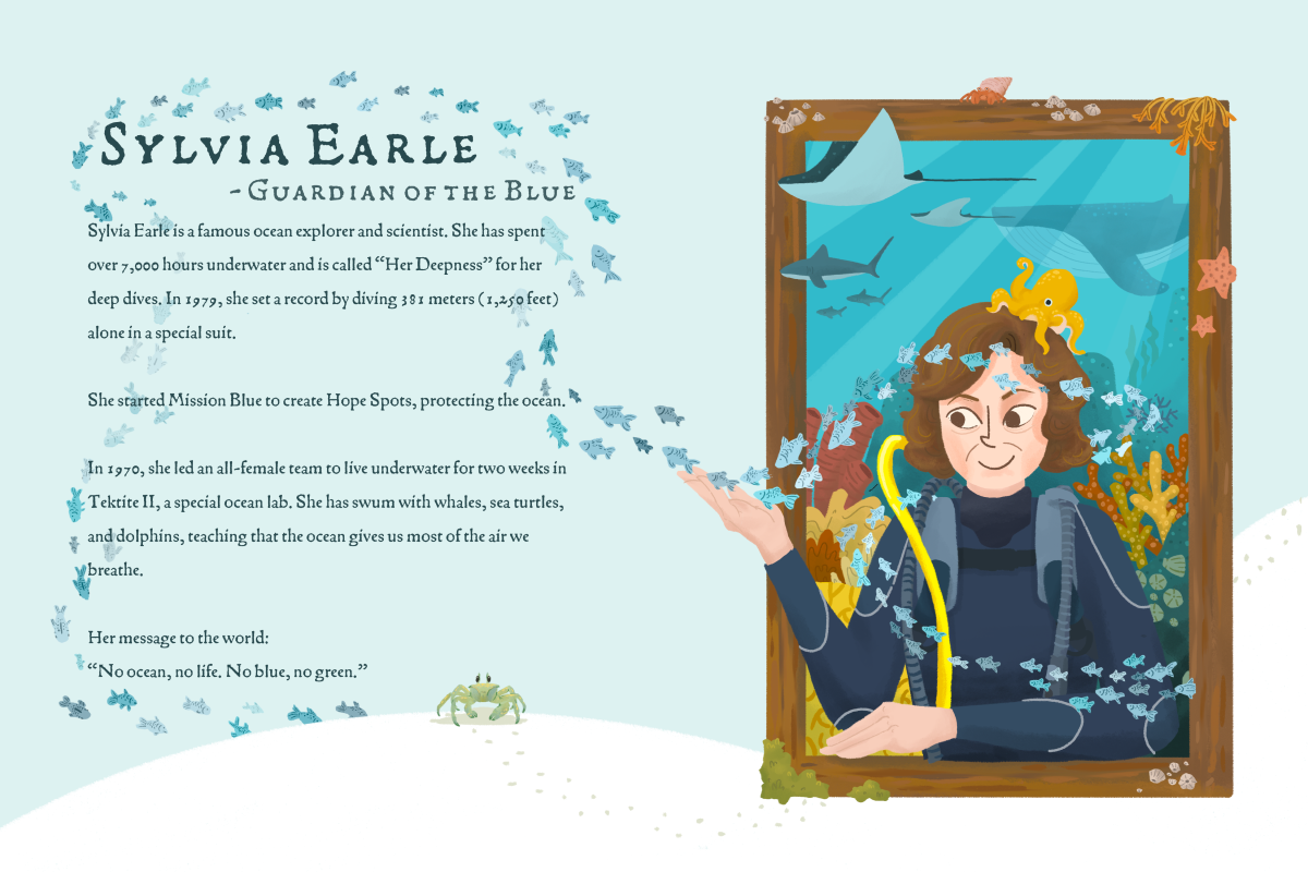 A portrait of Sylvia Earle, created as part of a children's book project that introduces important historical figures through approachable language and engaging illustrations. The goal is to spark curiosity and inspire young readers to learn more about the people who shaped our world.
