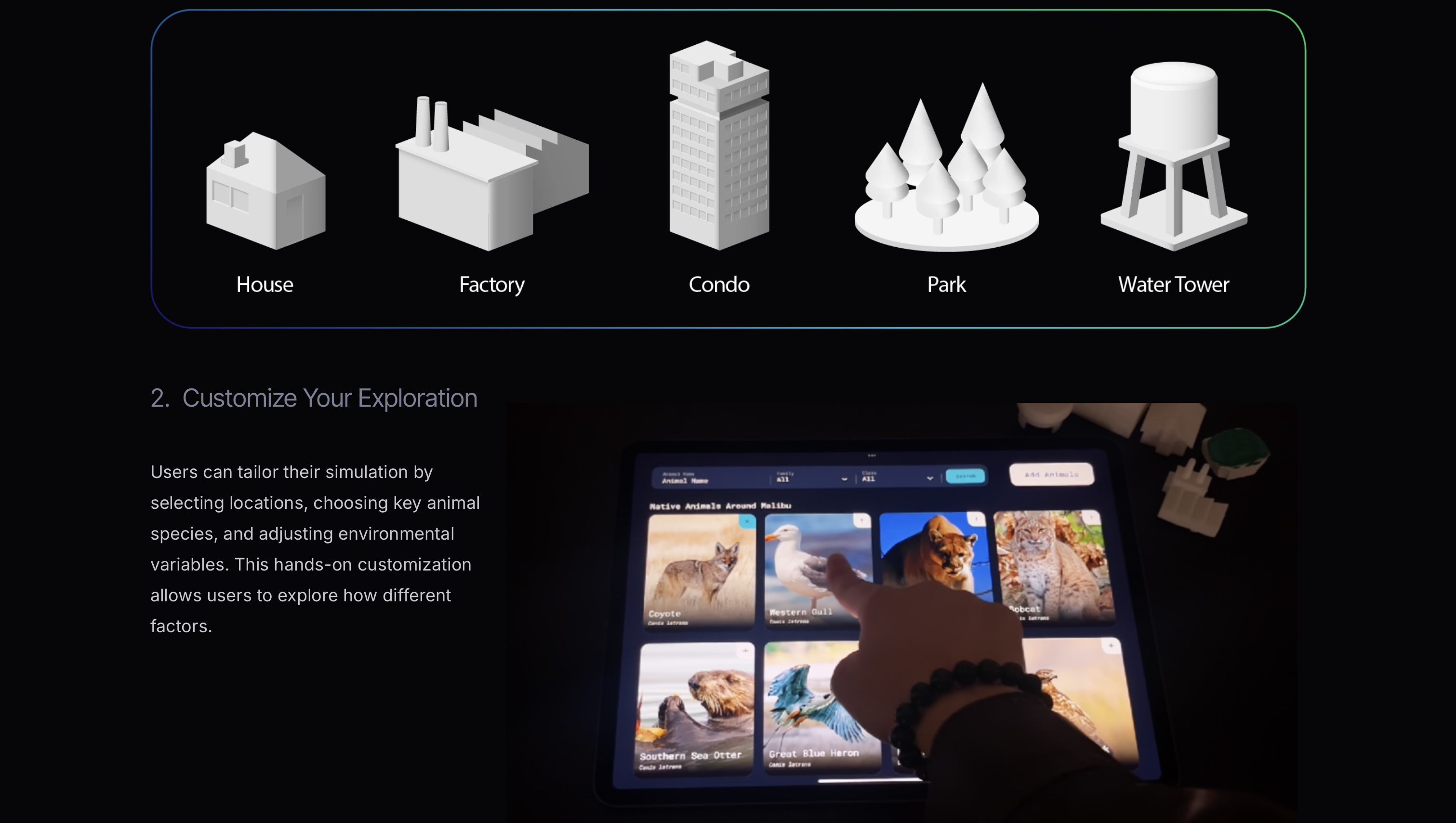 EcoConstruct is an interactive simulation that visualizes the ecological impact of urban development. By placing 3D objects on a tablet, users can explore how building, restoring, and planning choices affect wildlife habitats in real time.
