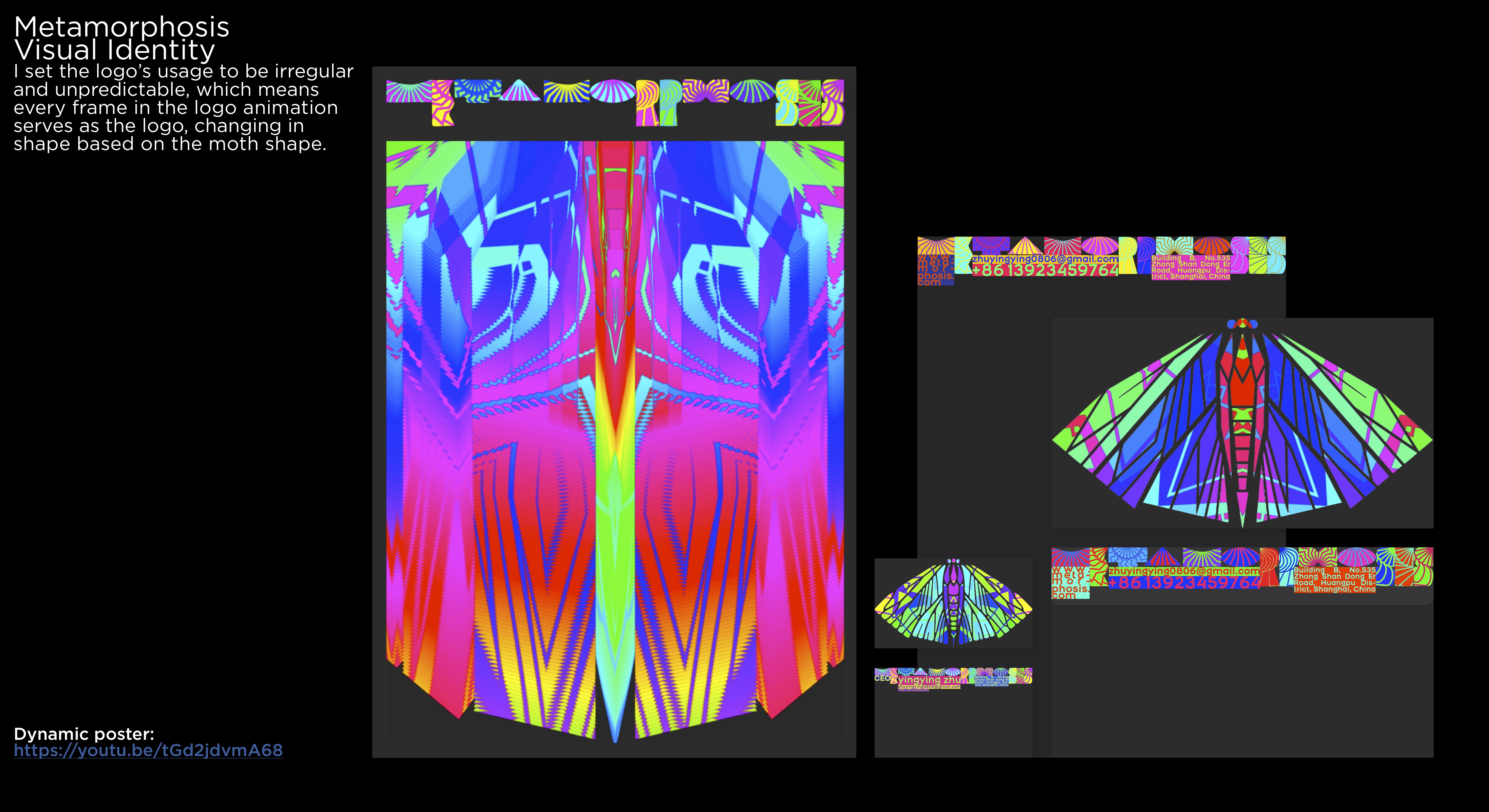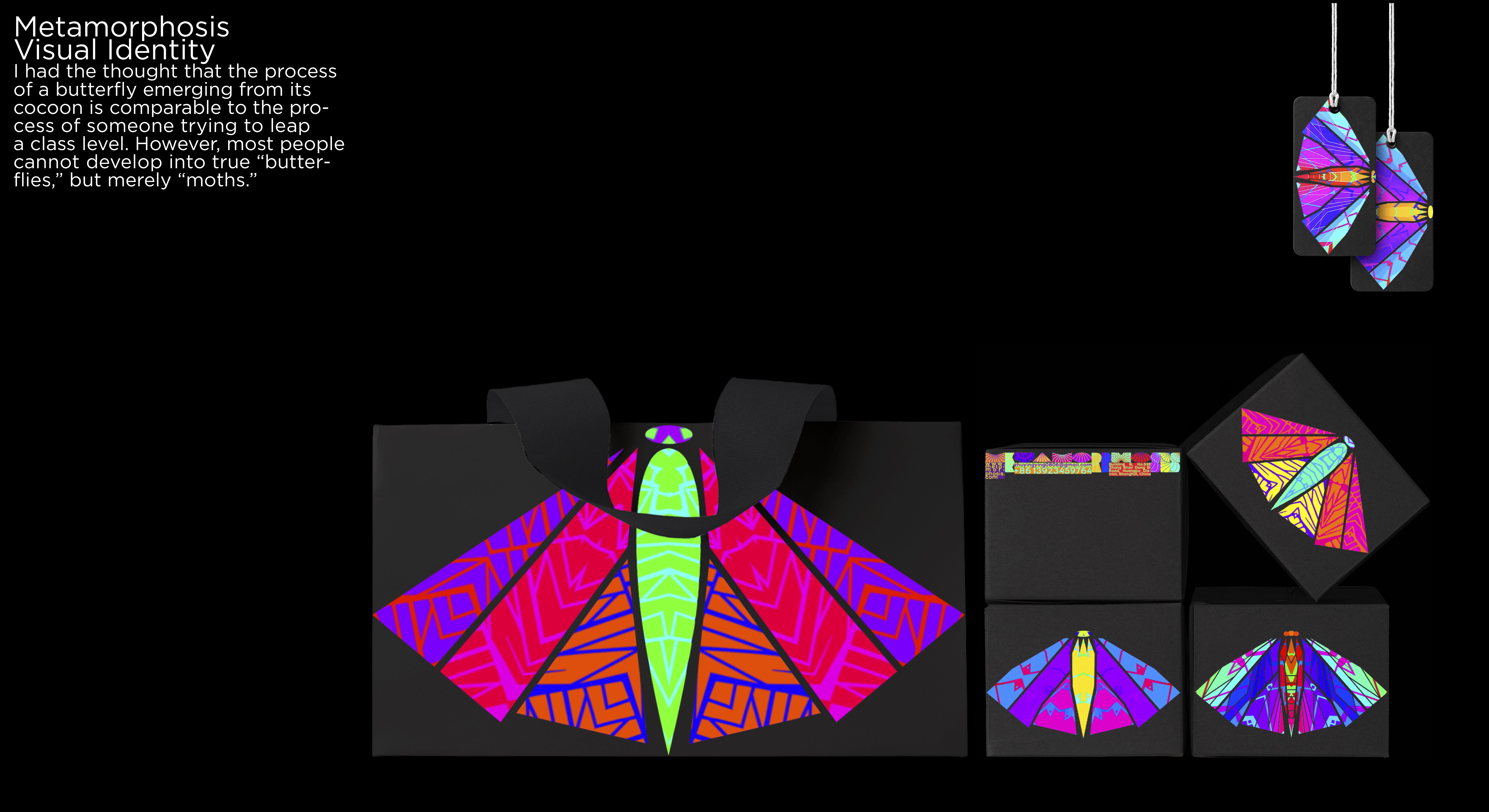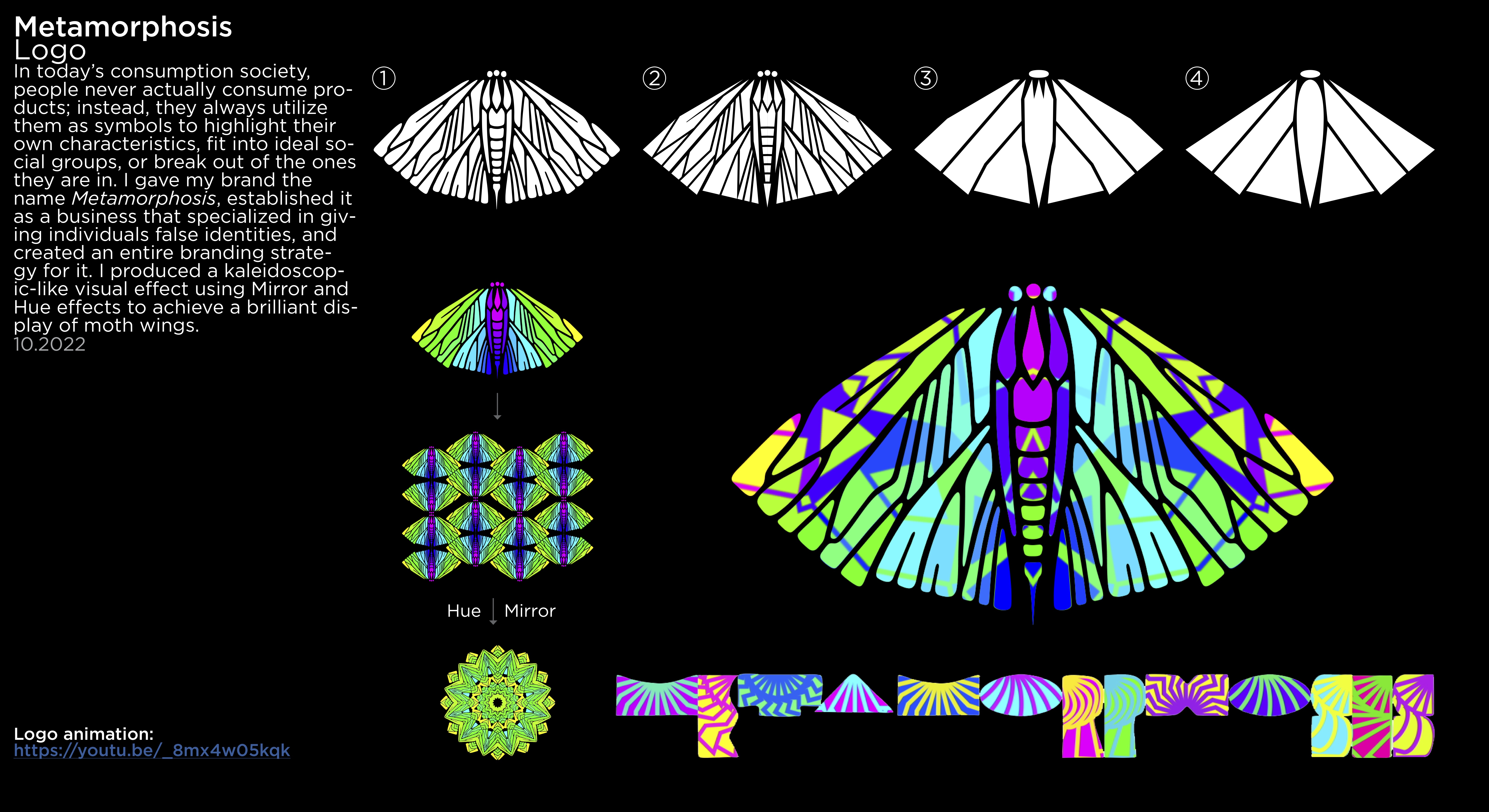 Drawing from Baudrillard's 'Consumer Society' and Kafka's 'Metamorphosis,' 'Metamorphosis,' my brand, explores the societal influence of appearance. We create fake identities to address the pursuit of social ascent through external packaging. Our dynamic logo reflects transformation, evident in our website and book design. Just as moths aspire to be butterflies, people aim to shift social class through appearance, yet true transformation eludes them.