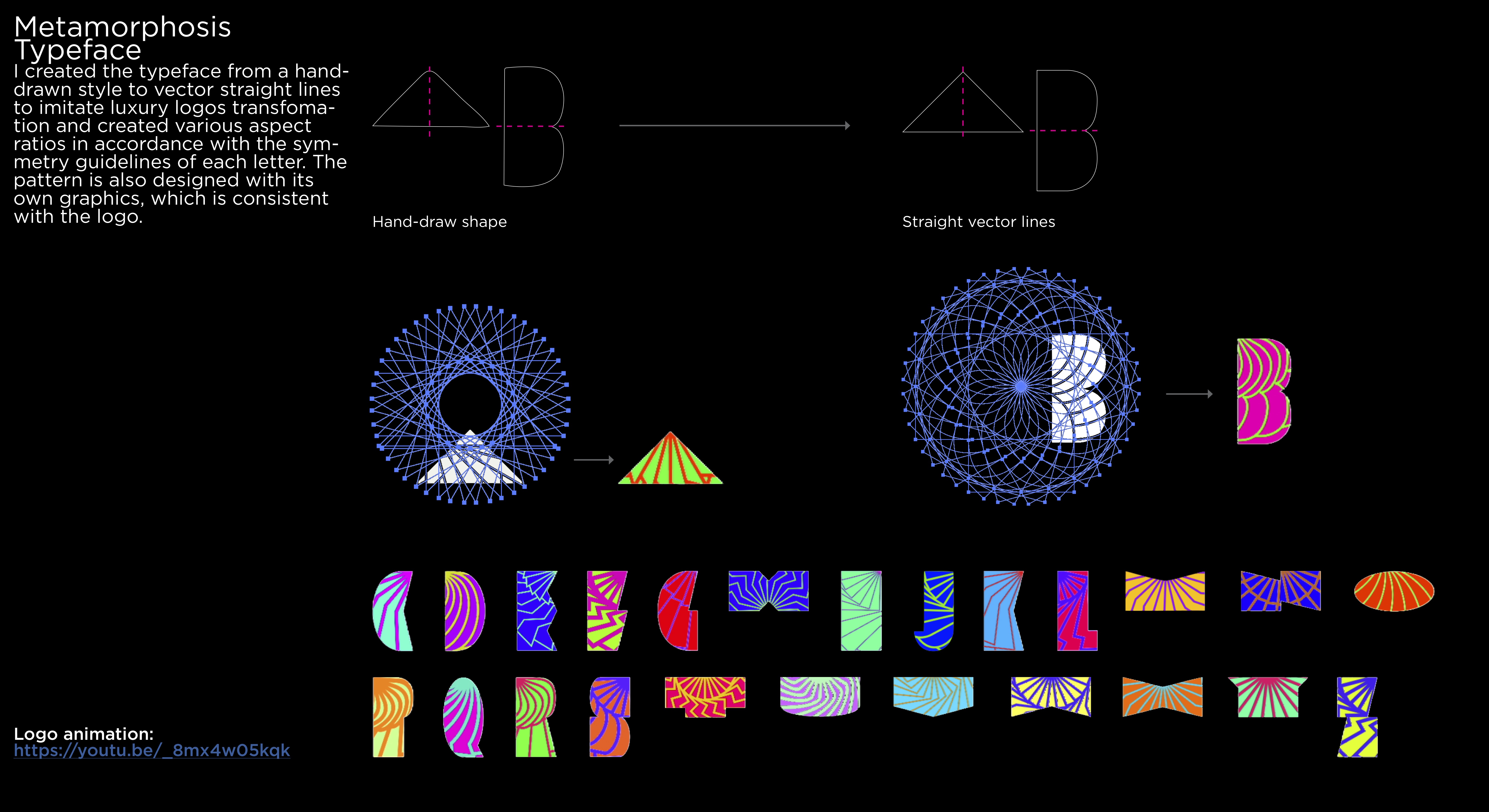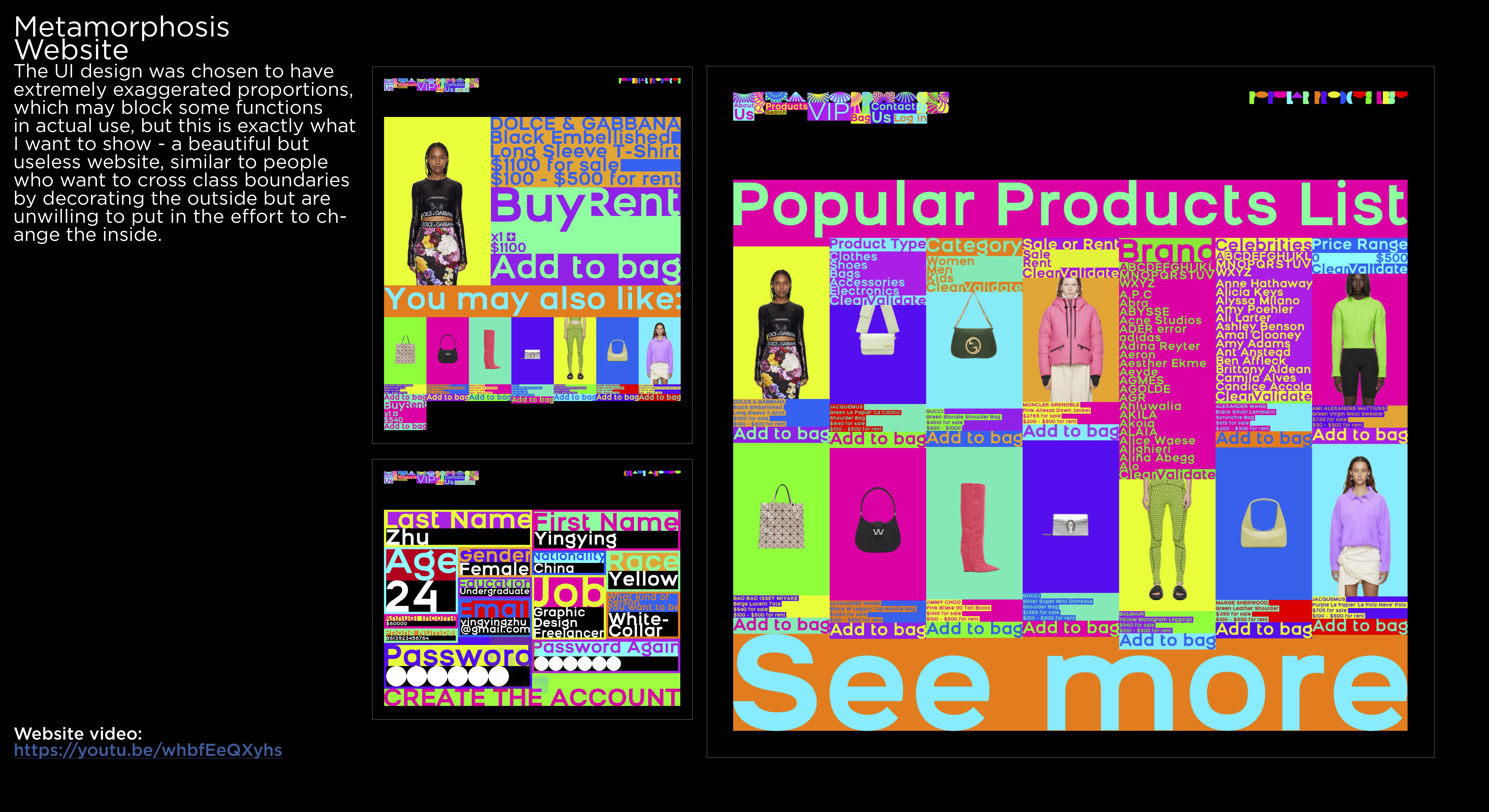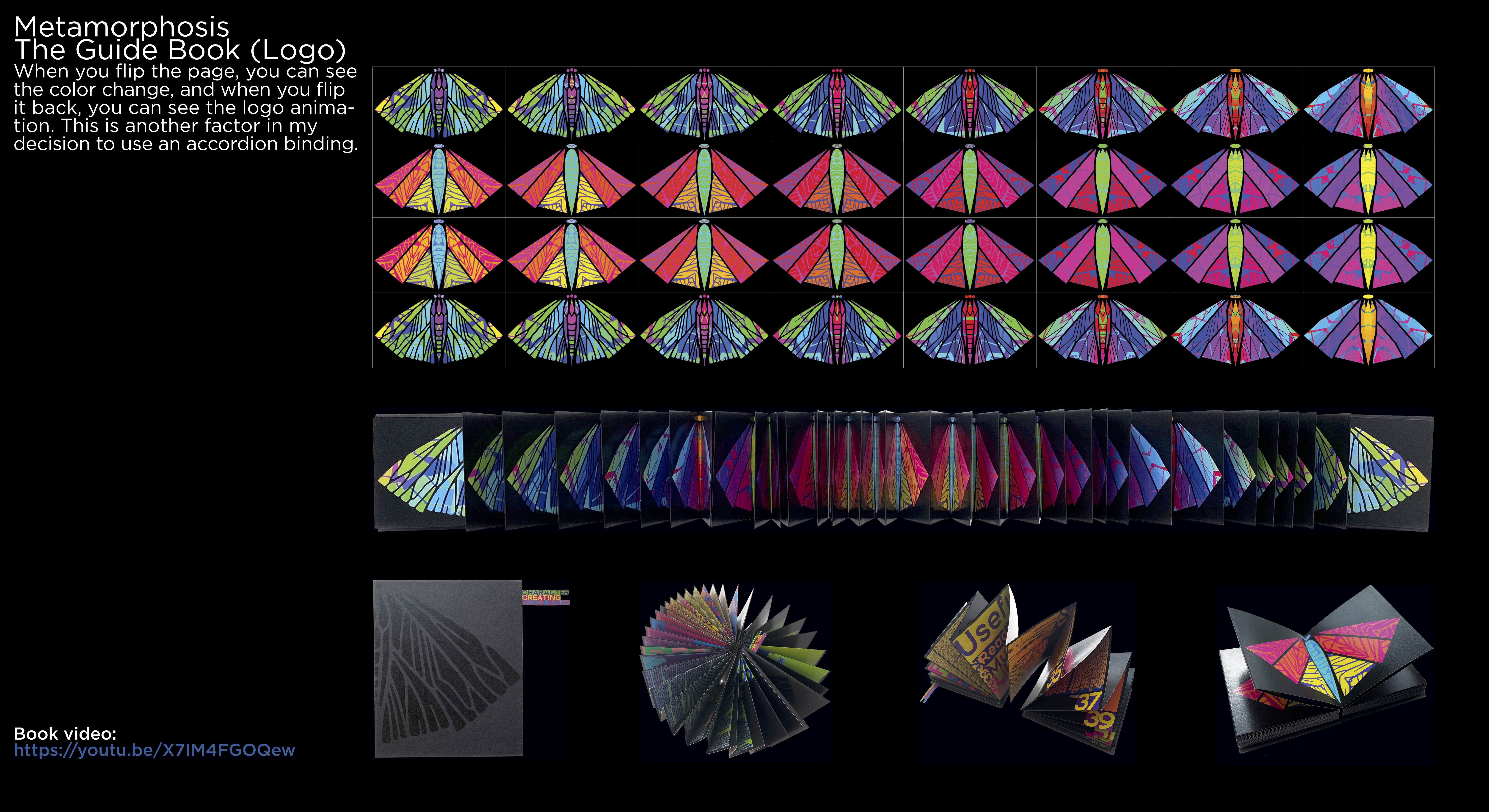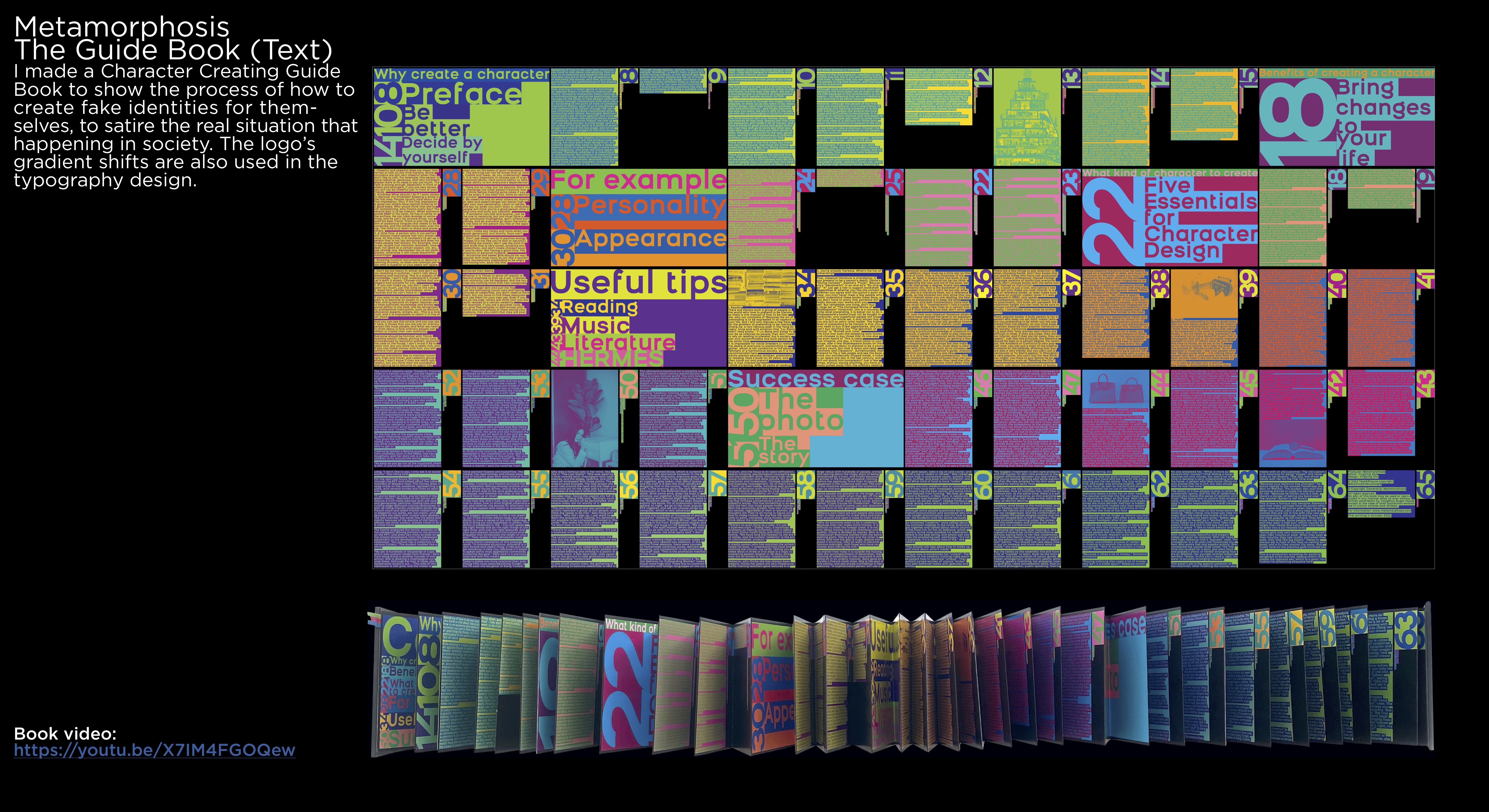 Drawing from Baudrillard's 'Consumer Society' and Kafka's 'Metamorphosis,' 'Metamorphosis,' my brand, explores the societal influence of appearance. We create fake identities to address the pursuit of social ascent through external packaging. Our dynamic logo reflects transformation, evident in our website and book design. Just as moths aspire to be butterflies, people aim to shift social class through appearance, yet true transformation eludes them.