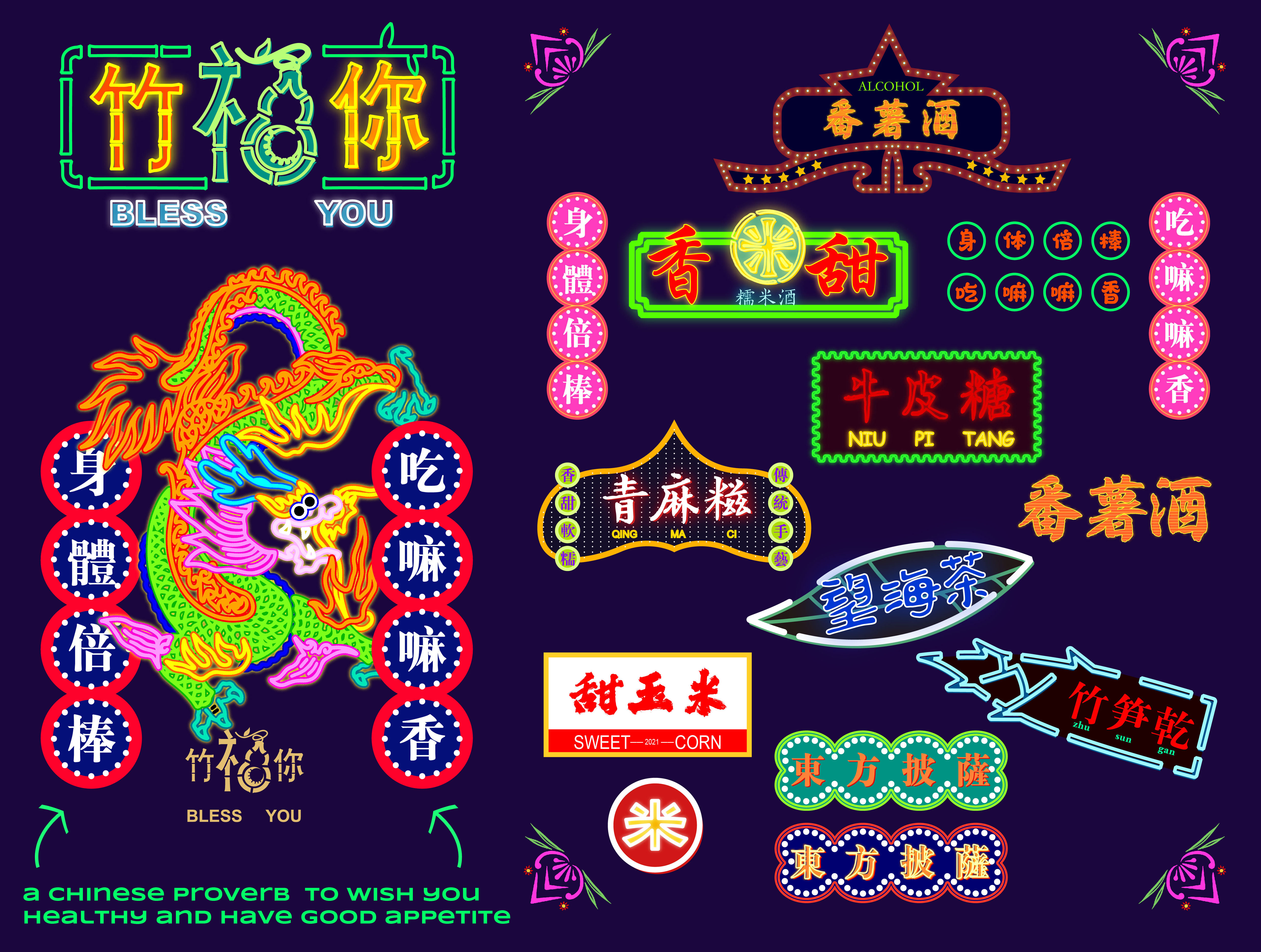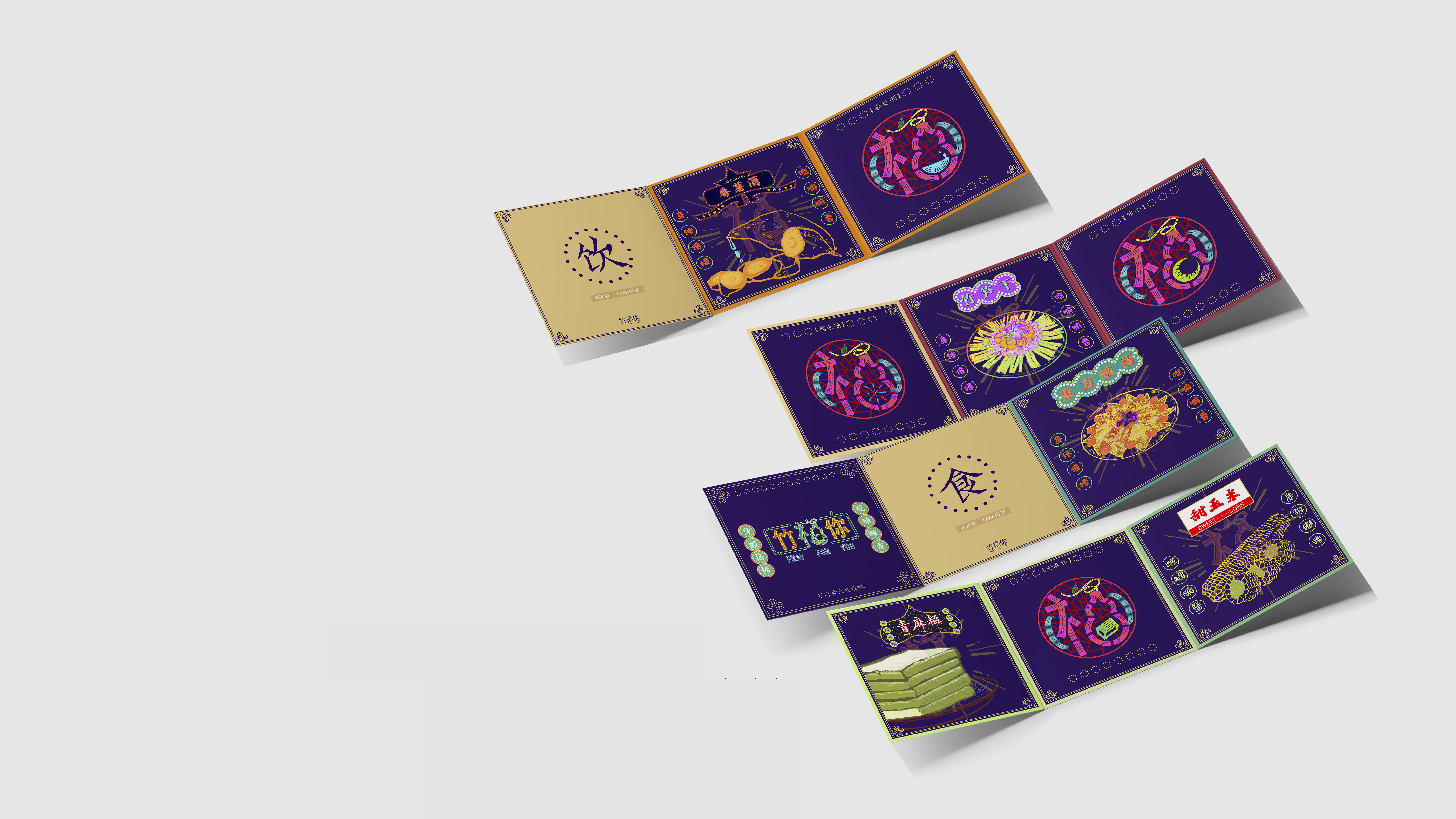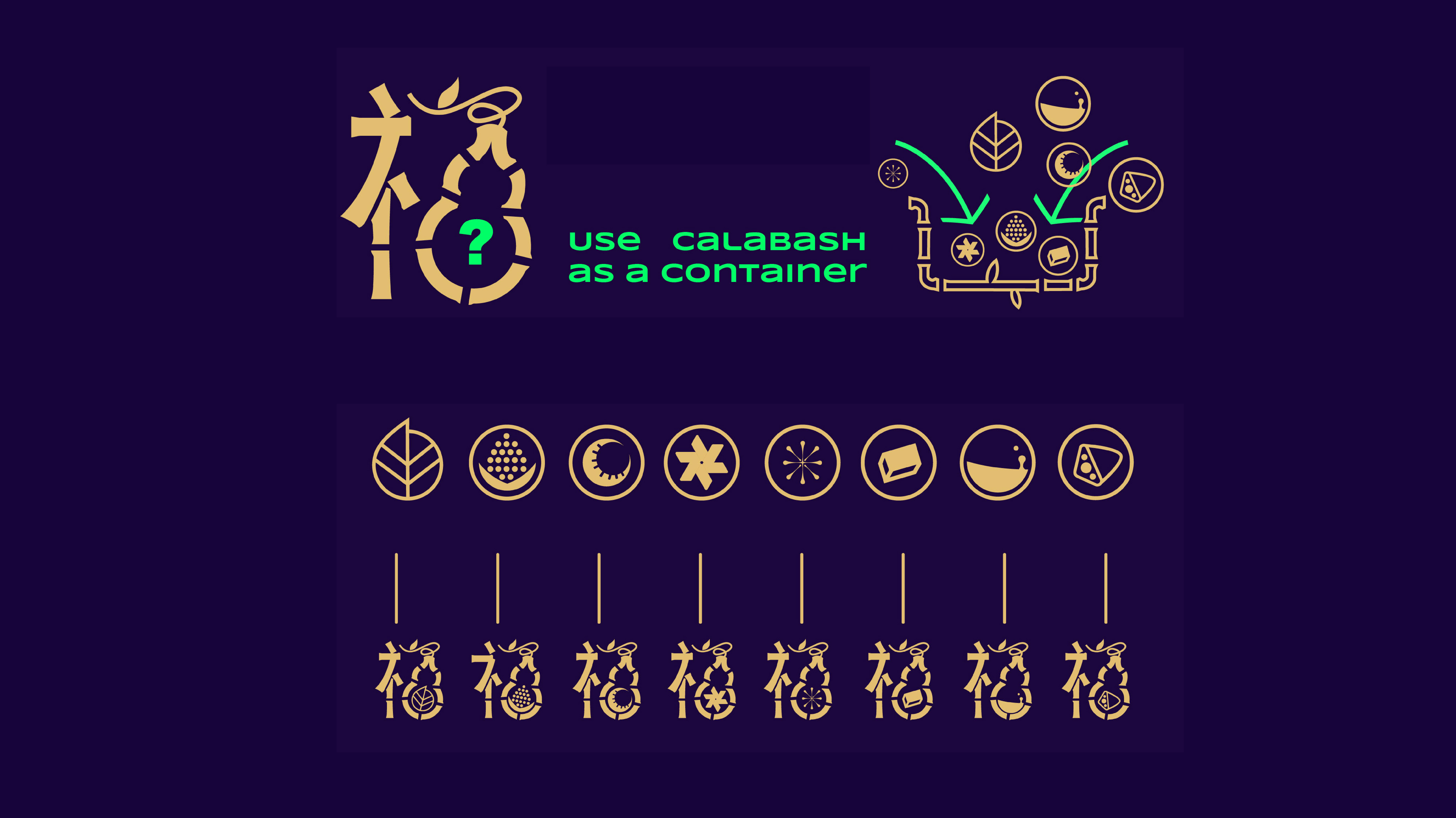Logo system / I changed the right side of "Fu" into a gourd shape according to the proverb. You can see calabash as a carrier. I also designed 8 signs corresponding to 8 special snacks of ShiMen Village. This ensures that each food brand can be within a framework and have its own characteristics.