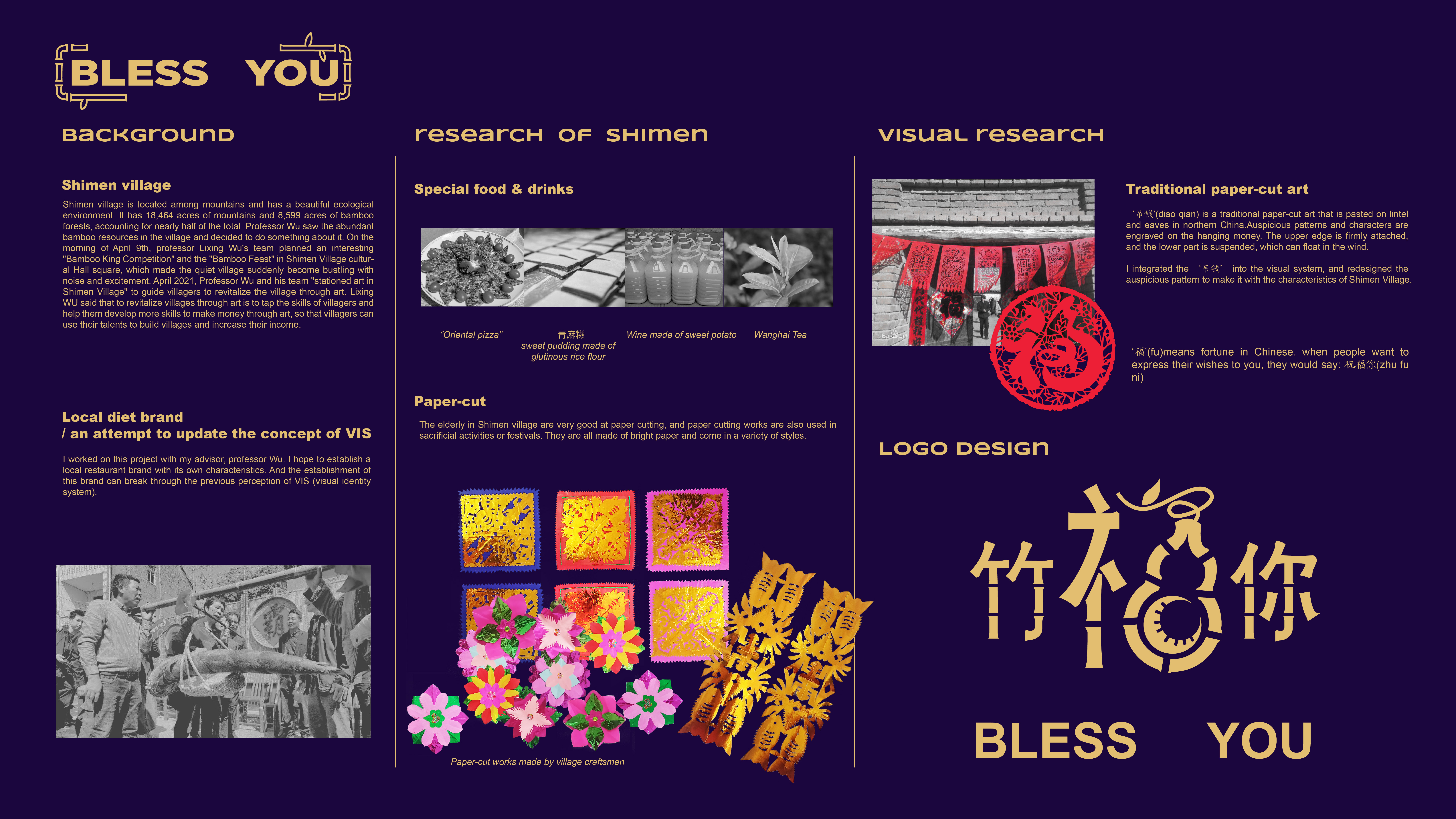 This project is made for ShiMen village, which is located among mountains and has a beautiful ecological environment. I worked on this project with my advisor, professor Wu, from my undergrad school. I hope to establish a local restaurant brand with its own characteristics. And the establishment of this brand can break through the previous perception of VIS. VIS is not limited to posters and logos, but to make more items that fit the needs of villagers, use visual style to unify the brand.