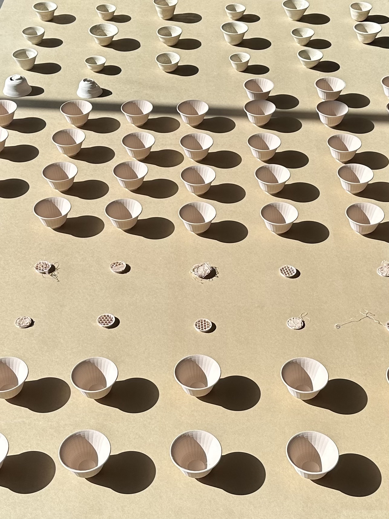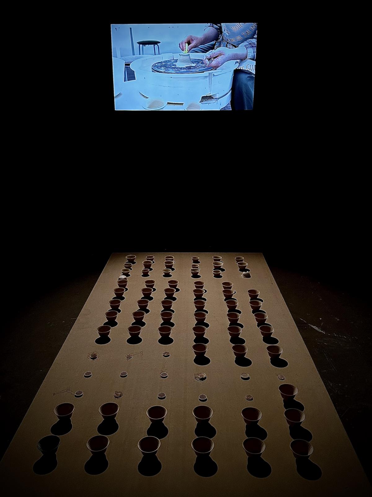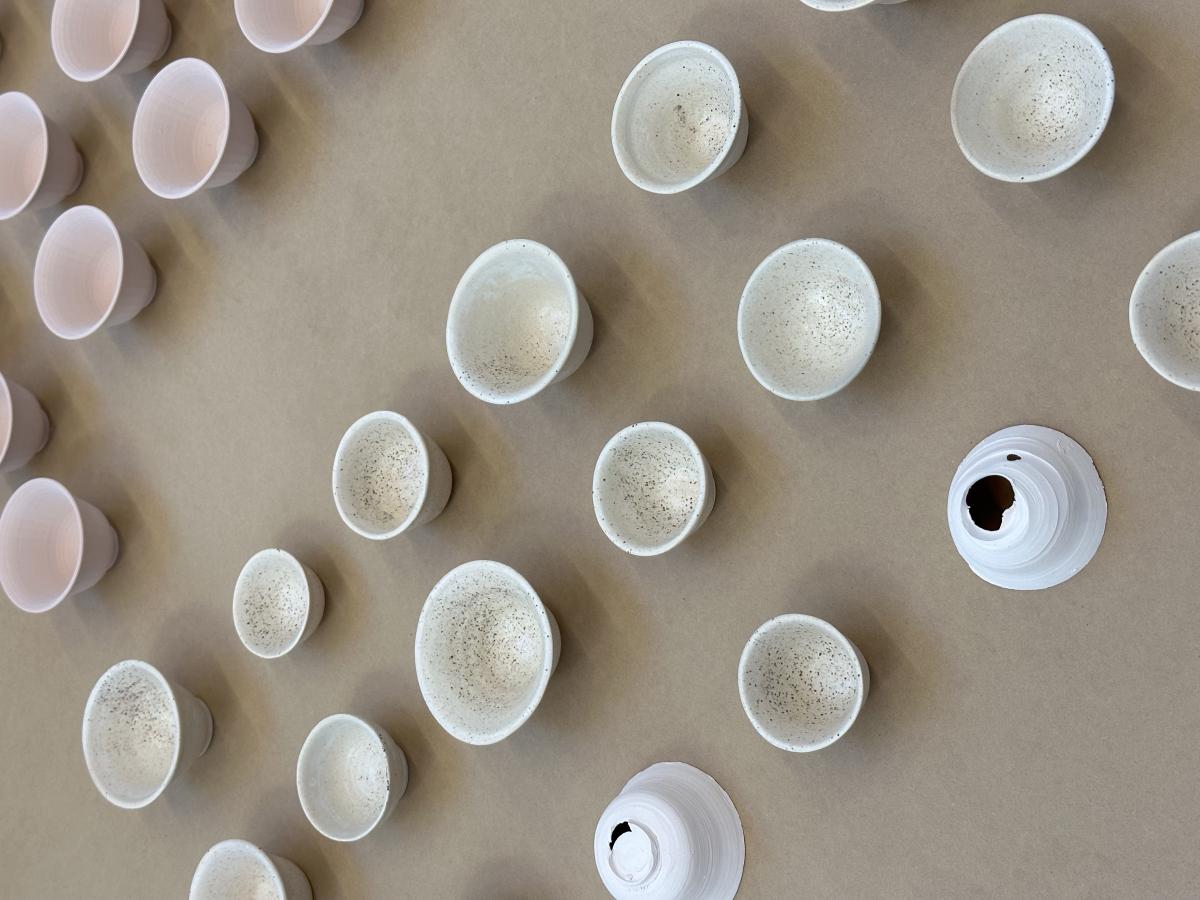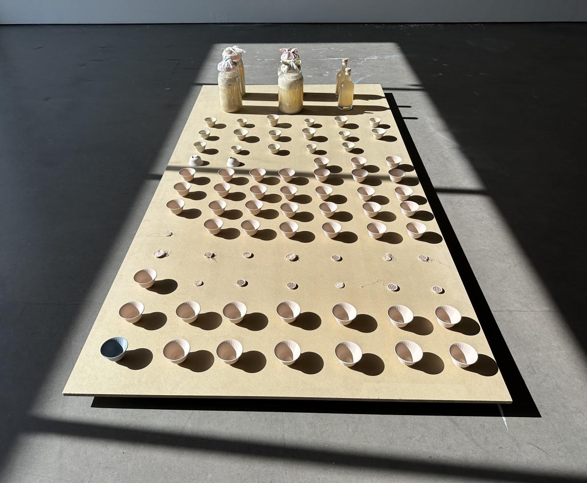 빚다[bitda]is an installation composed of 3D printed cups, hand wheeled ceramic cups, and handmade Makgeolli (traditional Korean alcohol made with rice). Each type of object is presented on a low wooden table and was constructed during a 12-week period. The layout includes failures, such as broken cups and printing errors. The hand-wheeled ceramics suggest an older form of craftsmanship, while 3D printing is a new manufacturing method that can print an identical shape infinitely from a single file. 빚다[bitda] also asks questions about language and translation; the word 빚다 is difficult to fully translate into English. It connotes craftmanship, meaning making/shaping/building something with time and care. It is the word used in the bible where it says God created humans. The expression 빚다 in daily life is mostly used for making pottery, clay or alcohol. The project compares the process of ‘빚다’ with the 3d-printed and handmade ceramic cups with Makgeolli. The work does not define which is more valuable, rather, it compares the processes of making. 3D printed objects are more objective, whereas handmade objects bear the marks of their maker.
