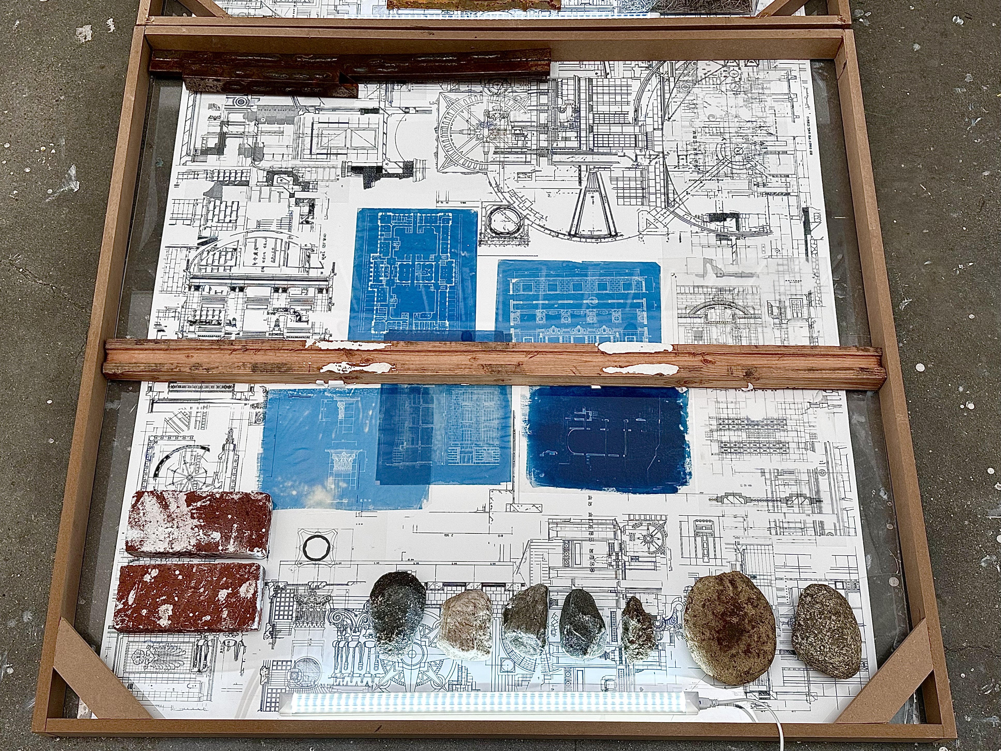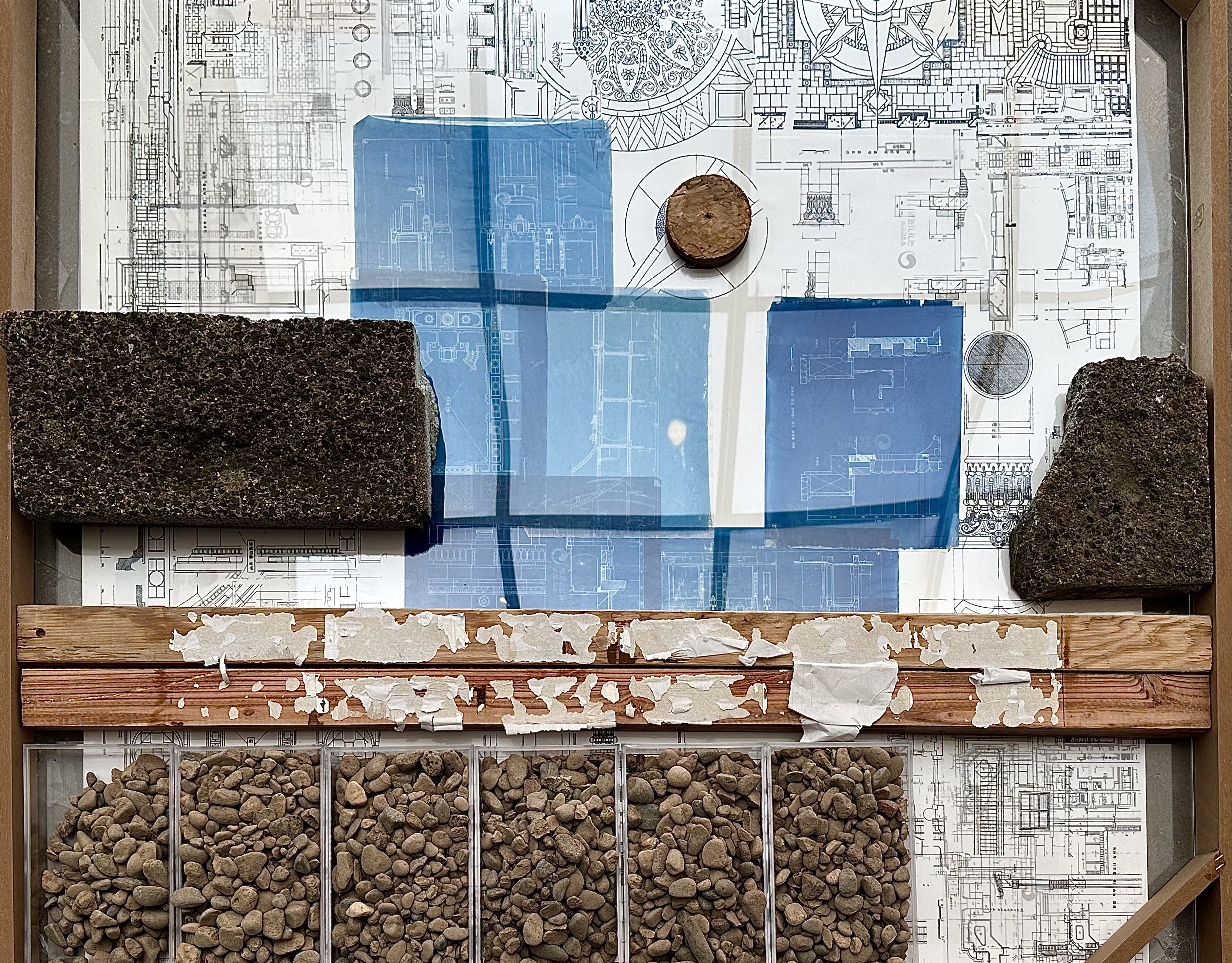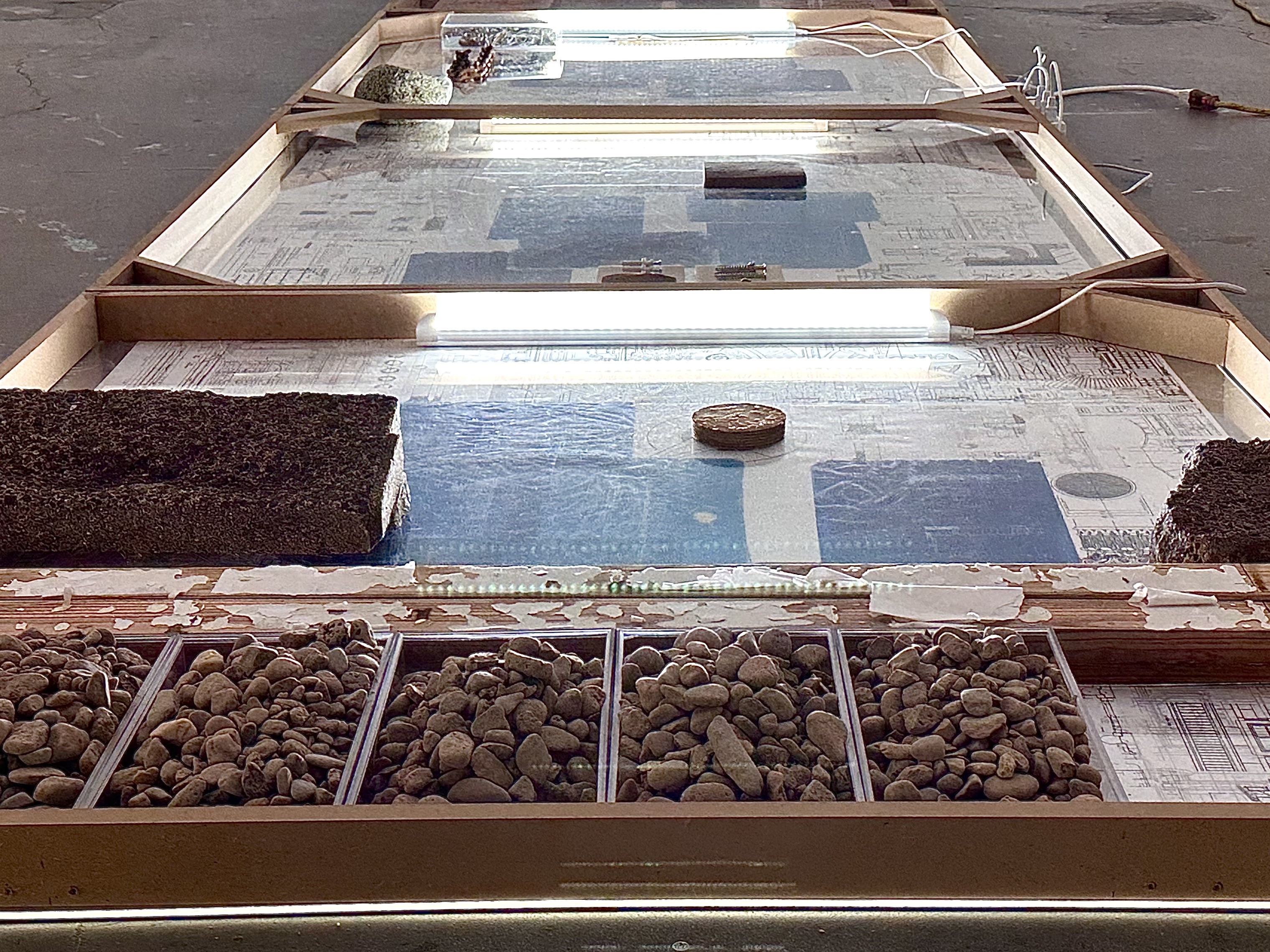 Installation with wooden structure, collage (digital print and cyanotype), stone, metal, wood, and led lights