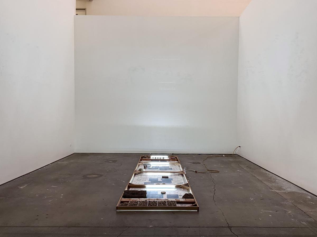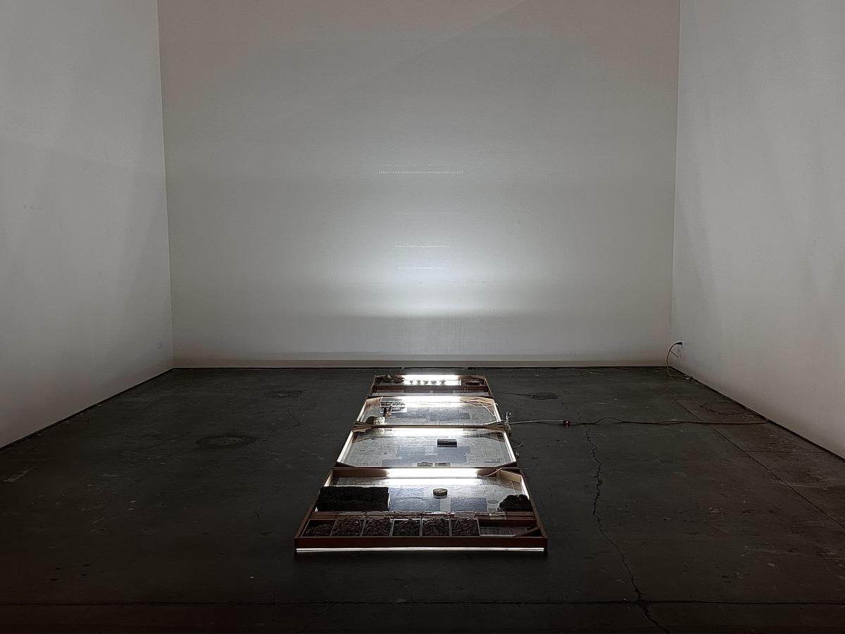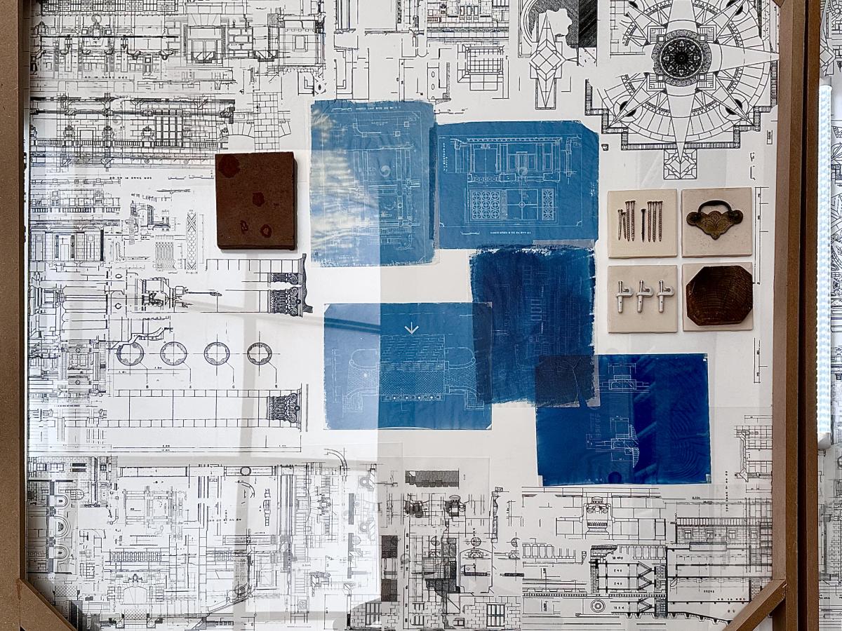 Installation with wooden structure, collage (digital print and cyanotype), stone, metal, wood, and led lights