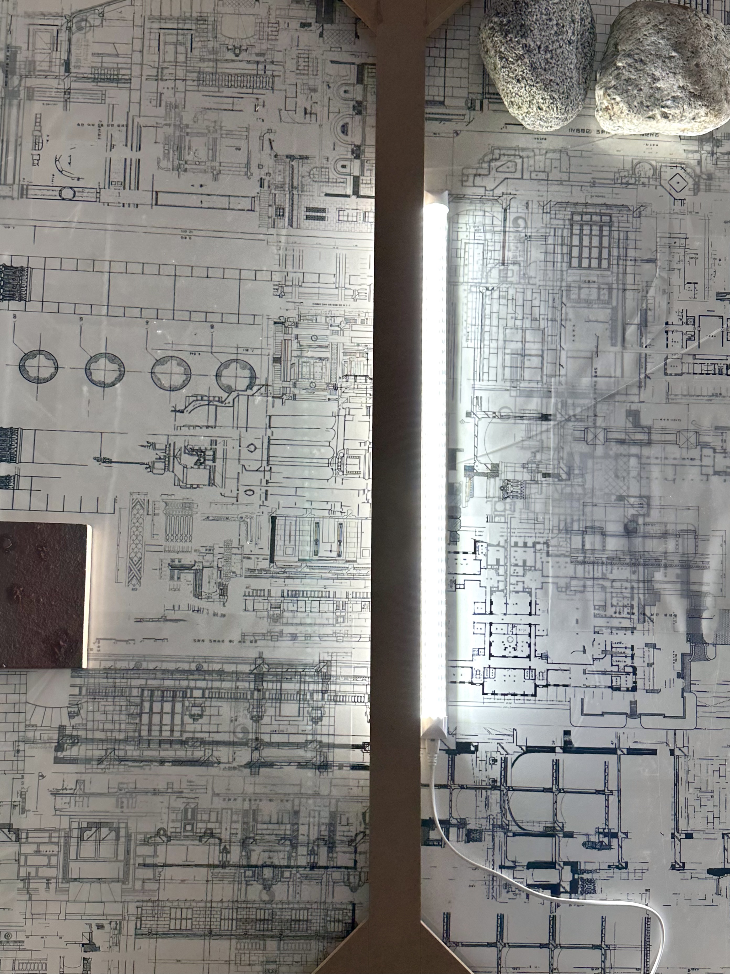 The installation is composed of a squared structure with a wooden frame that sits on the floor. Underneath the structure there is a collage made out of the floor plans of the building and cyanotypes. The structure contains construction materials, including wood, metal and stone, and ceiling lights that mimic remnants of the ground floor after a building has been demolished. Deleted Space and Afterimage explores the void left by modern structures that once existed and then vanished, and the choices made during the process of demolition. By juxtaposing architectural drawings created before the building was built with the debris left behind after the building was demolished, the work addresses the loss of physical building, as well as the differing interpretations (controversies) of the government's decision and the historical context over time.