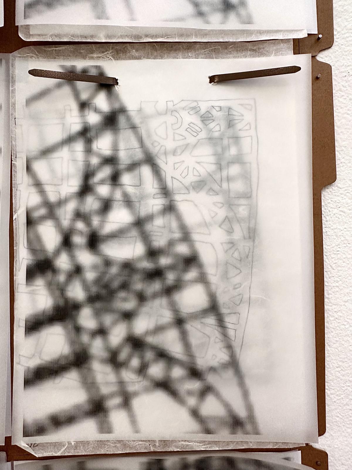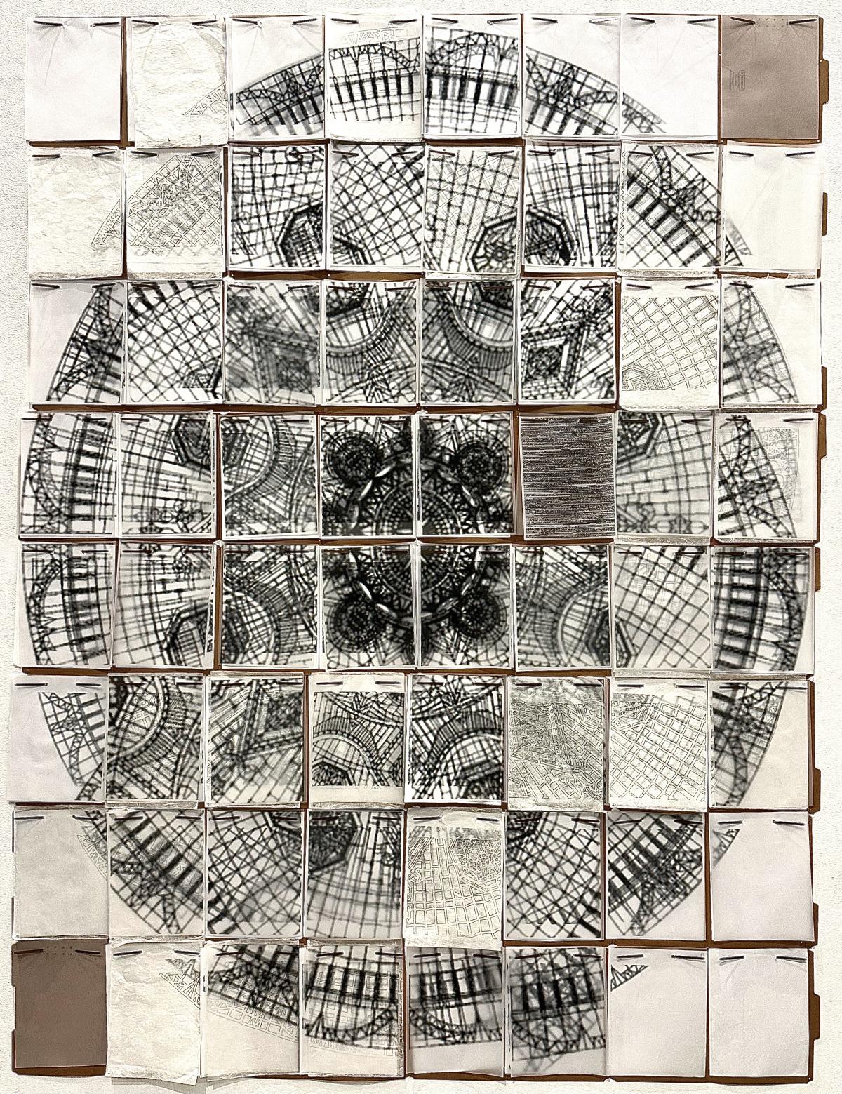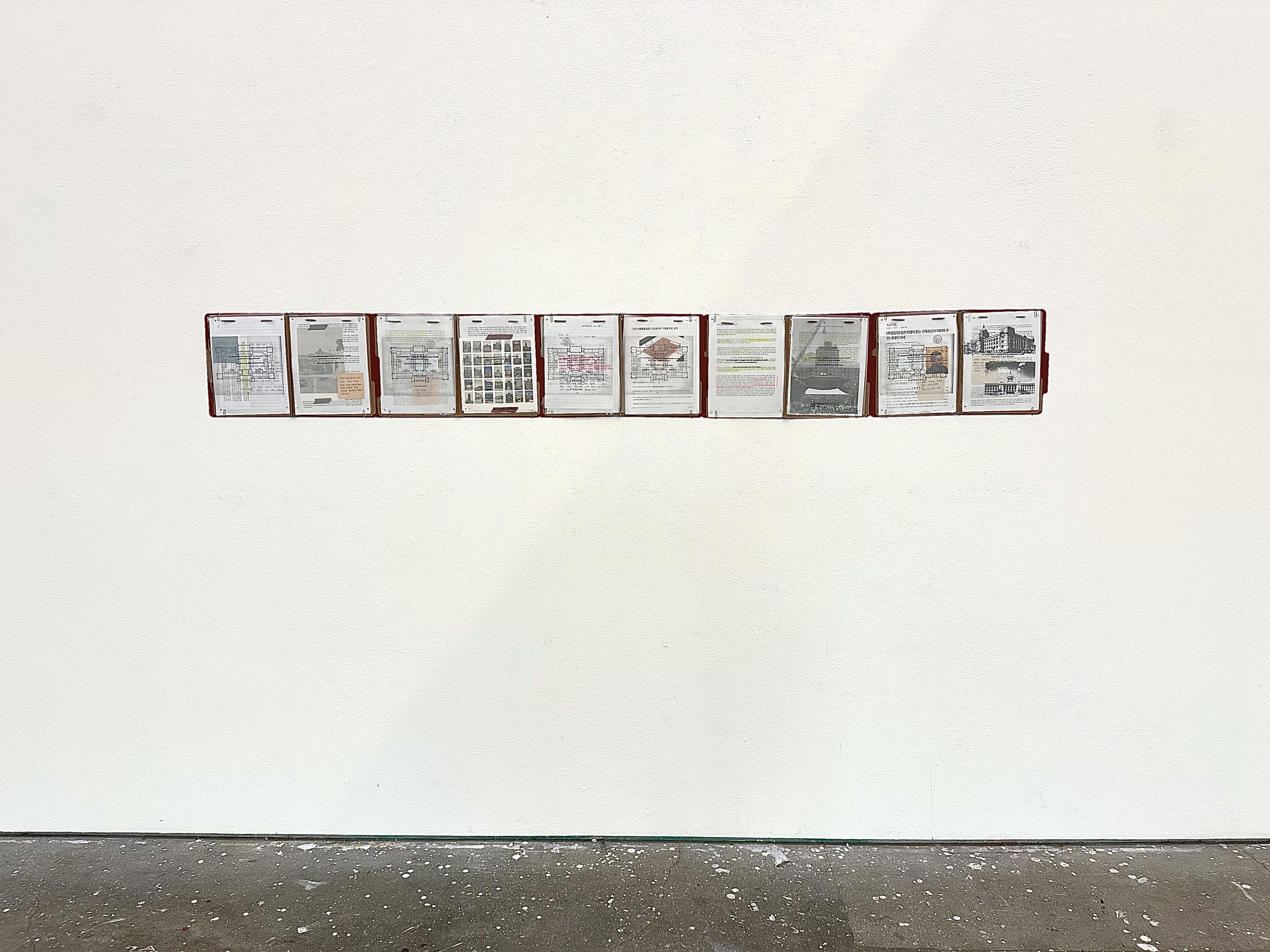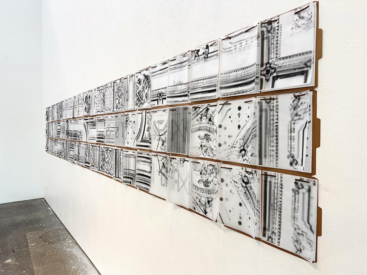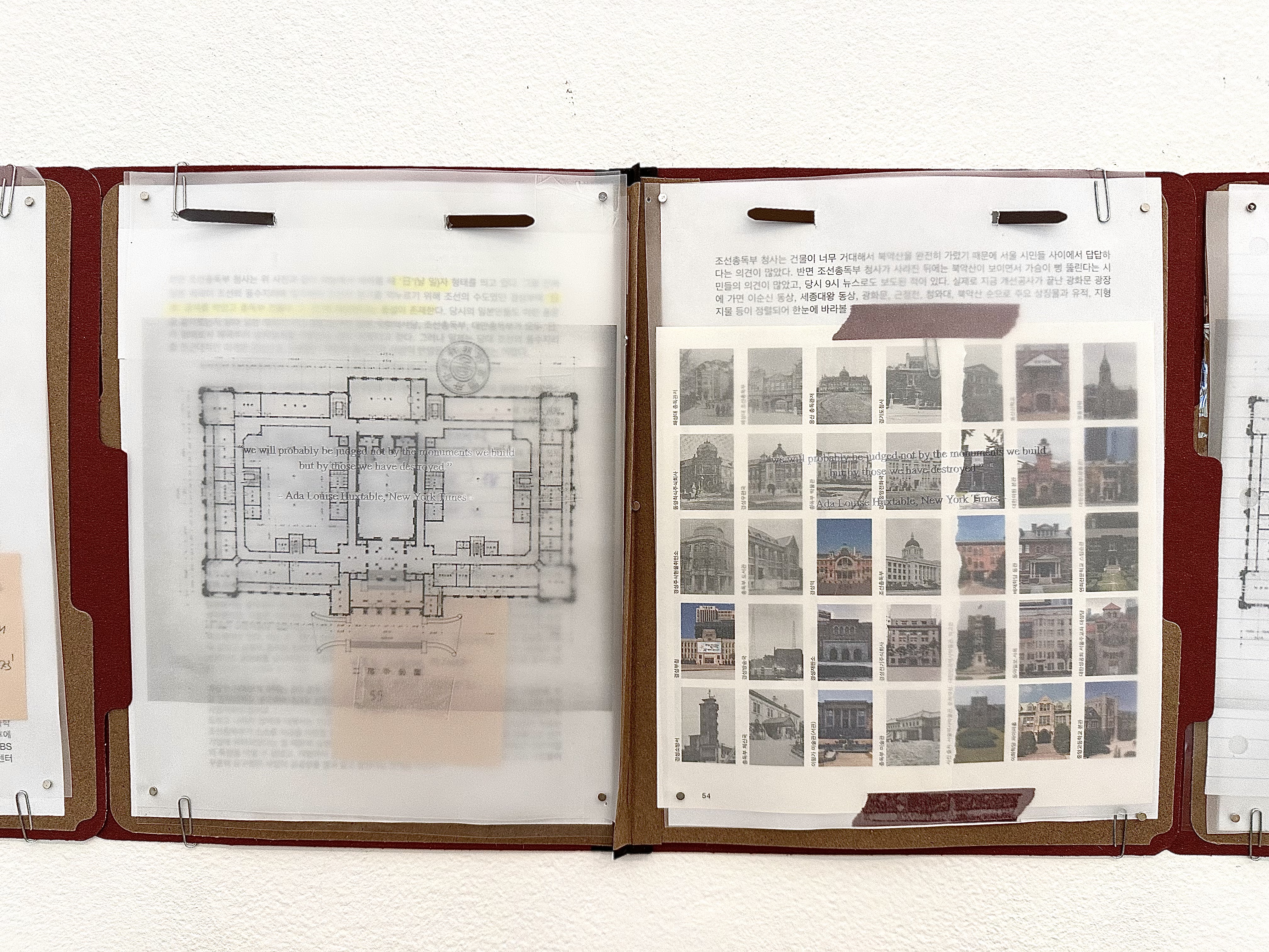 On the front wall of the exhibition hall, five file folders are displayed in a row. Each file is a collage of Lee's research on the building, her personal opinions, and related images. On both sides of the wall, there are another three works in folders. Each work utilizes patterns from the first-floor central hall, the stained-glass ceiling of its dome, and the ceiling of the conference room. Patterns that remain only as records due to the building's demolition are printed onto paper and displayed as documents in a grid. Between the faint patterns, the viewer encounters a space that once formed the building's floor and ceiling.