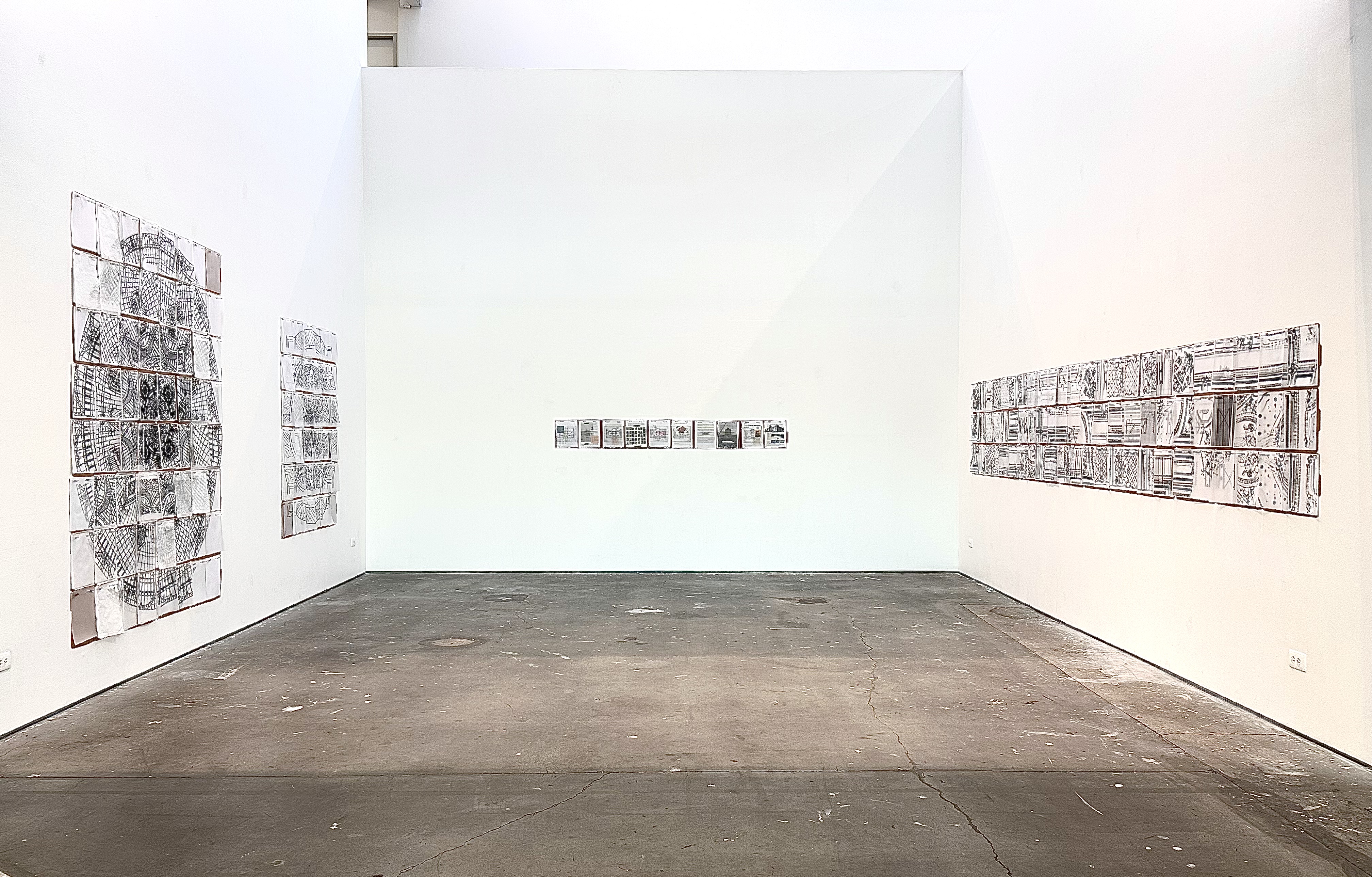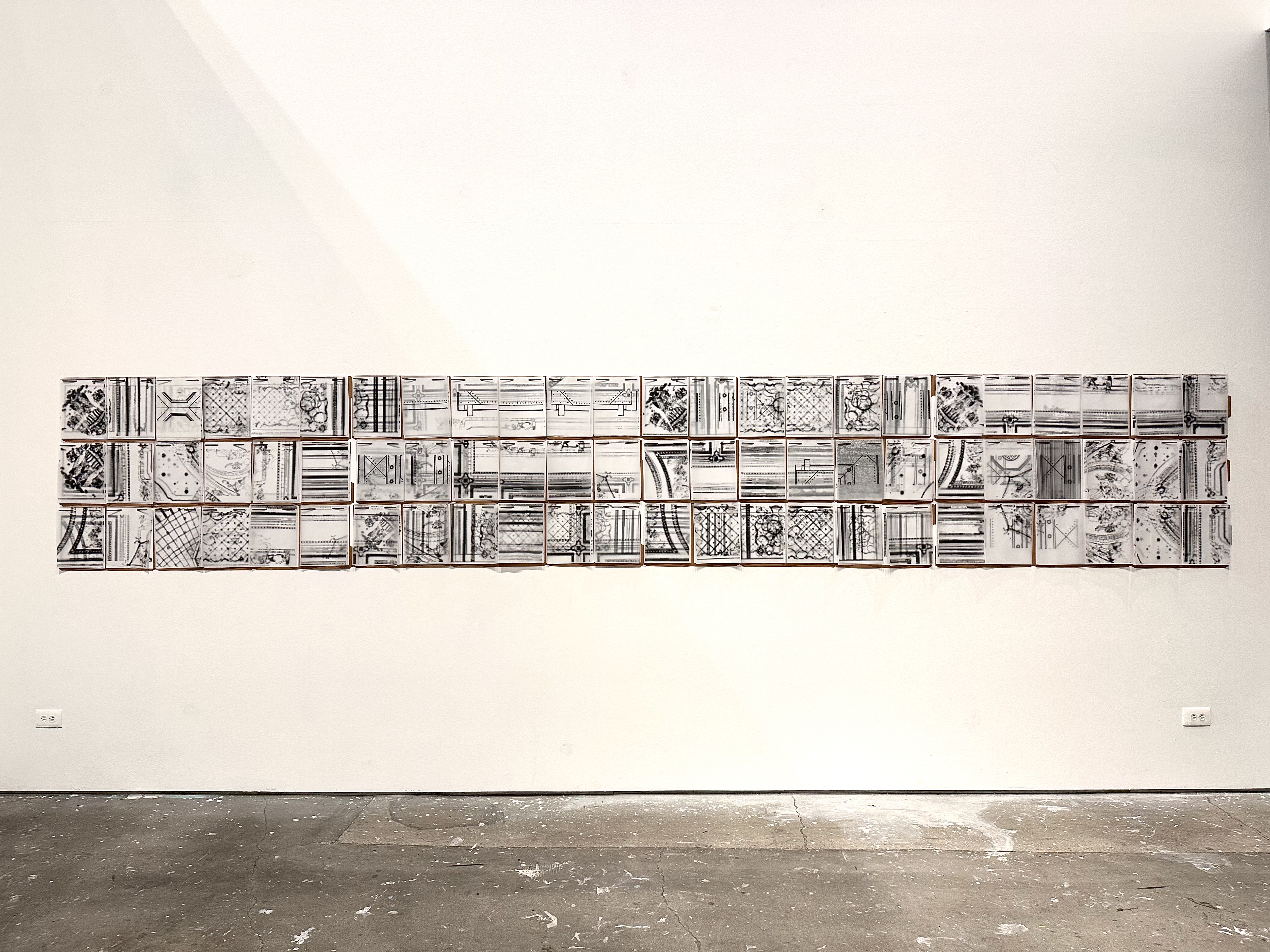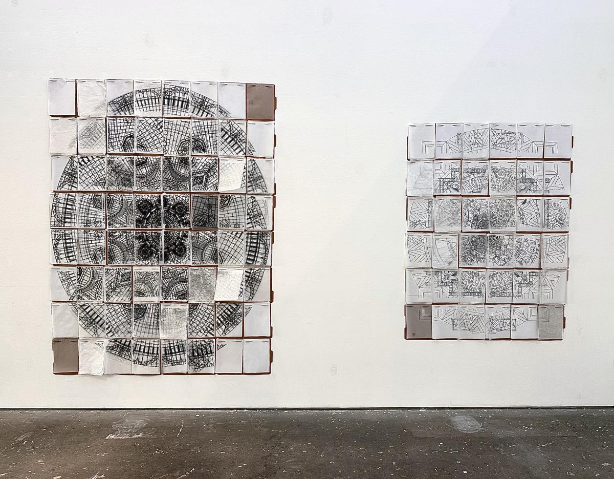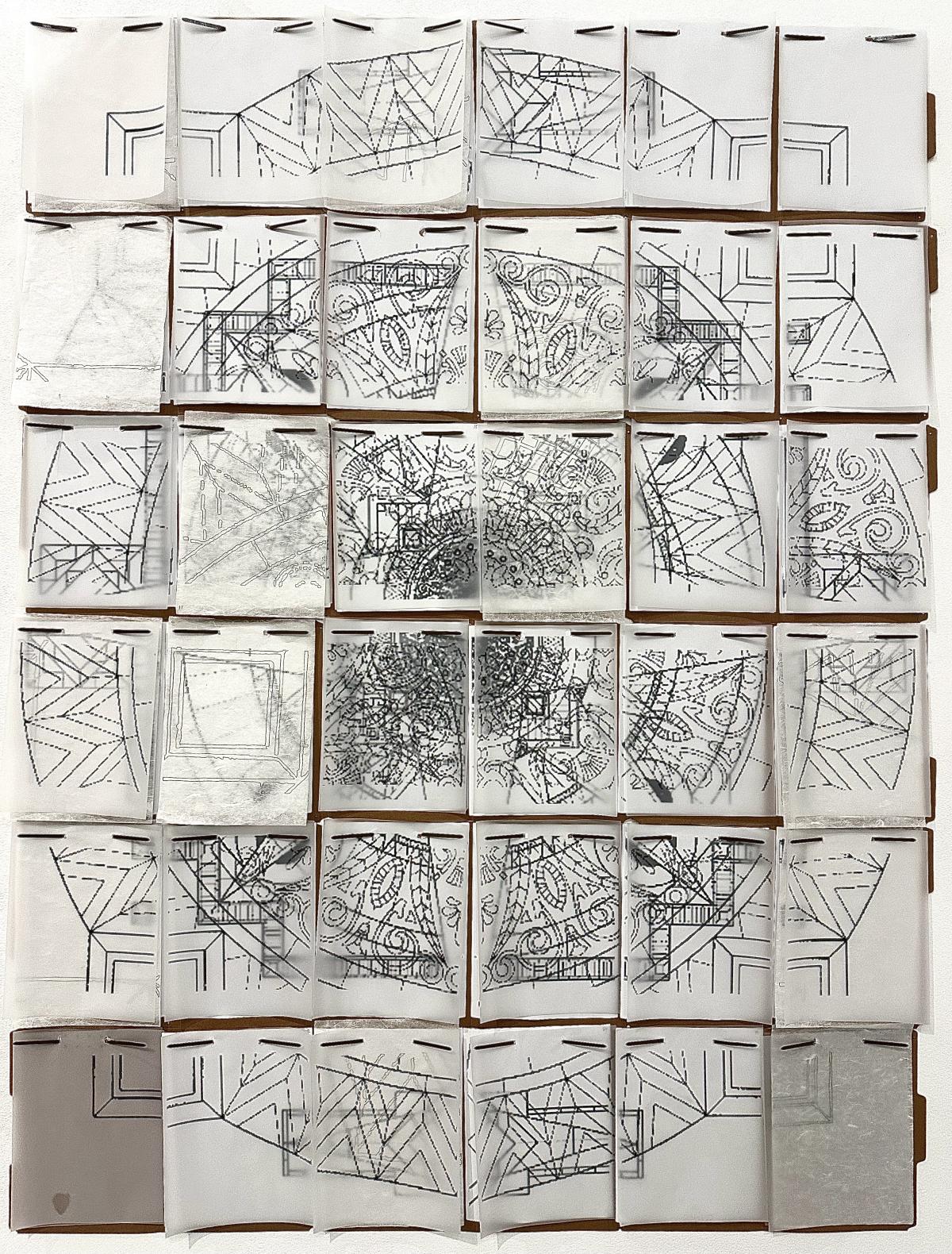 On the front wall of the exhibition hall, five file folders are displayed in a row. Each file is a collage of Lee's research on the building, her personal opinions, and related images. On both sides of the wall, there are another three works in folders. Each work utilizes patterns from the first-floor central hall, the stained-glass ceiling of its dome, and the ceiling of the conference room. Patterns that remain only as records due to the building's demolition are printed onto paper and displayed as documents in a grid. Between the faint patterns, the viewer encounters a space that once formed the building's floor and ceiling.
