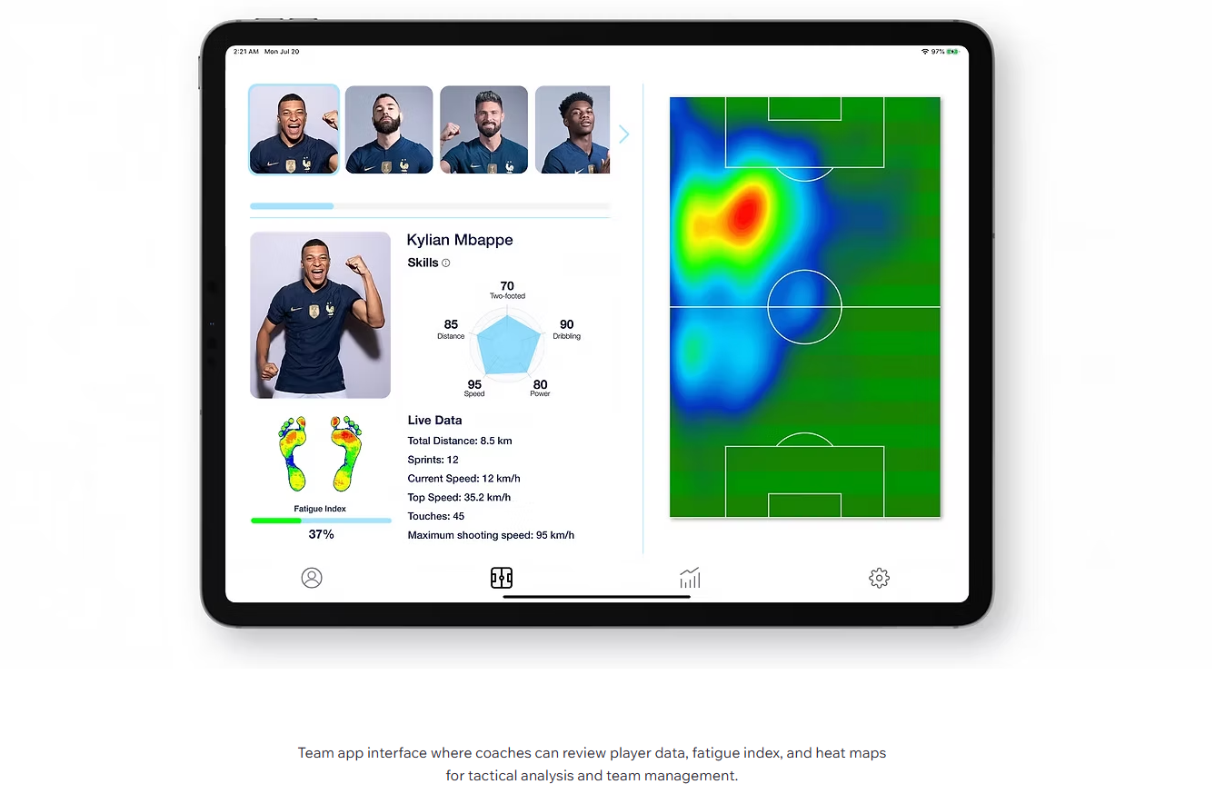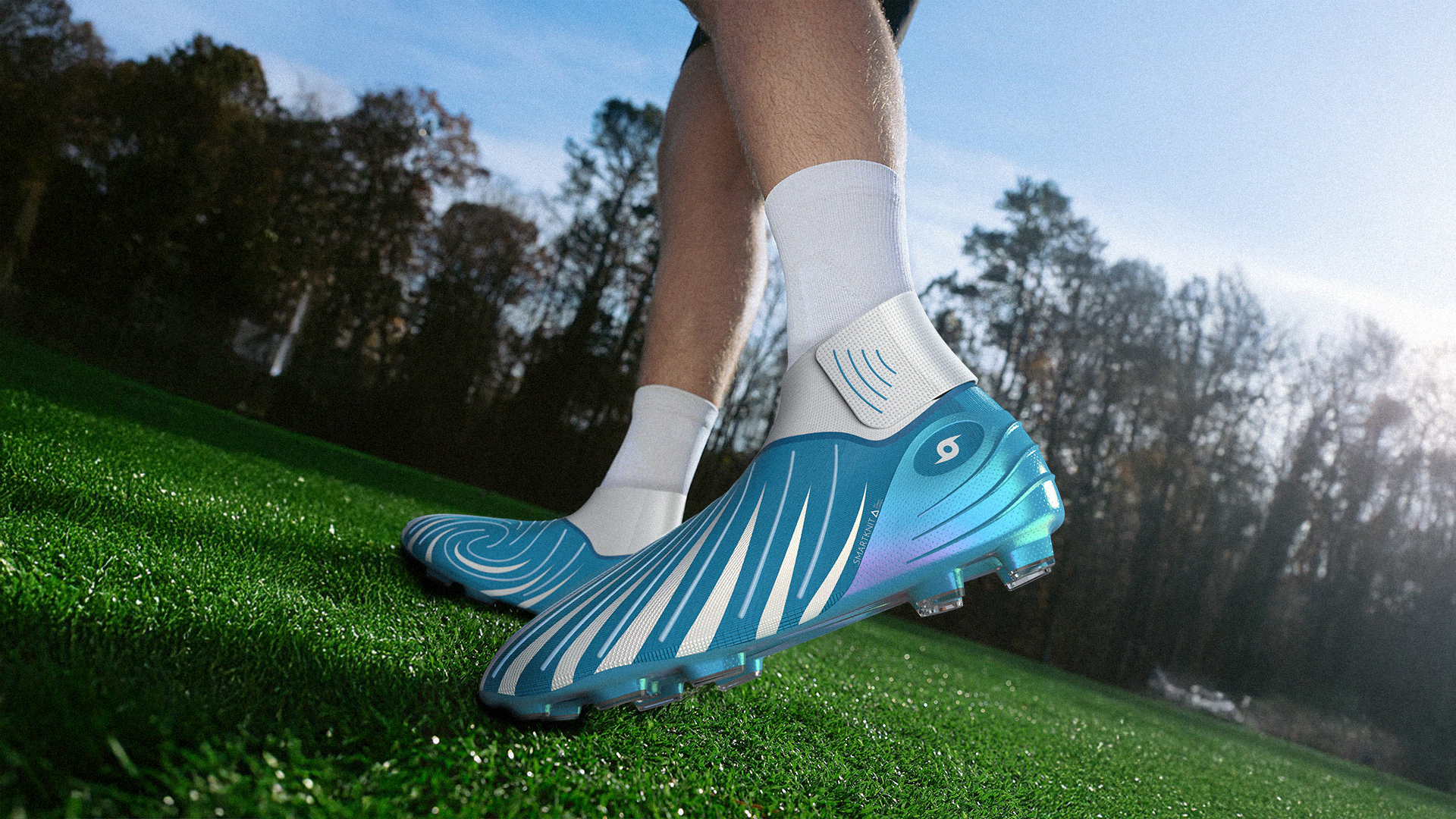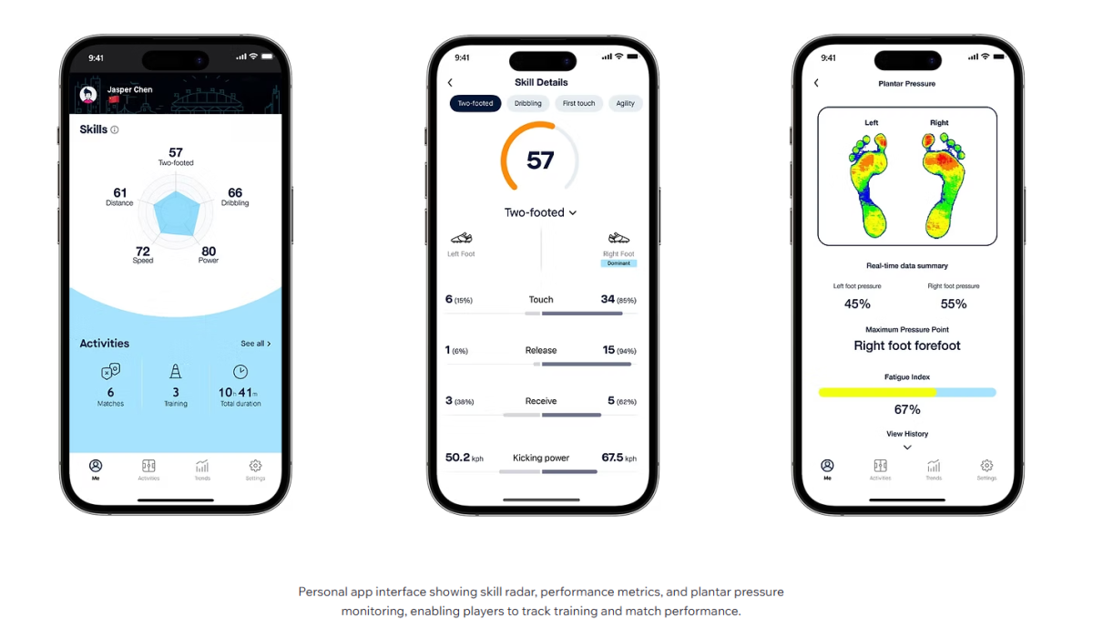 “Hurricane” takes visual cues from hurricane eye-walls, with wrapping lines that emphasize speed and lockdown. SMP shape-memory material in the upper molds to each player’s foot, while a high-cut quick-entry collar improves ankle protection and makes the boot faster to put on and take off. Insole pressure sensors and an outsole tracker capture fatigue and ball-contact data to support training and risk management.