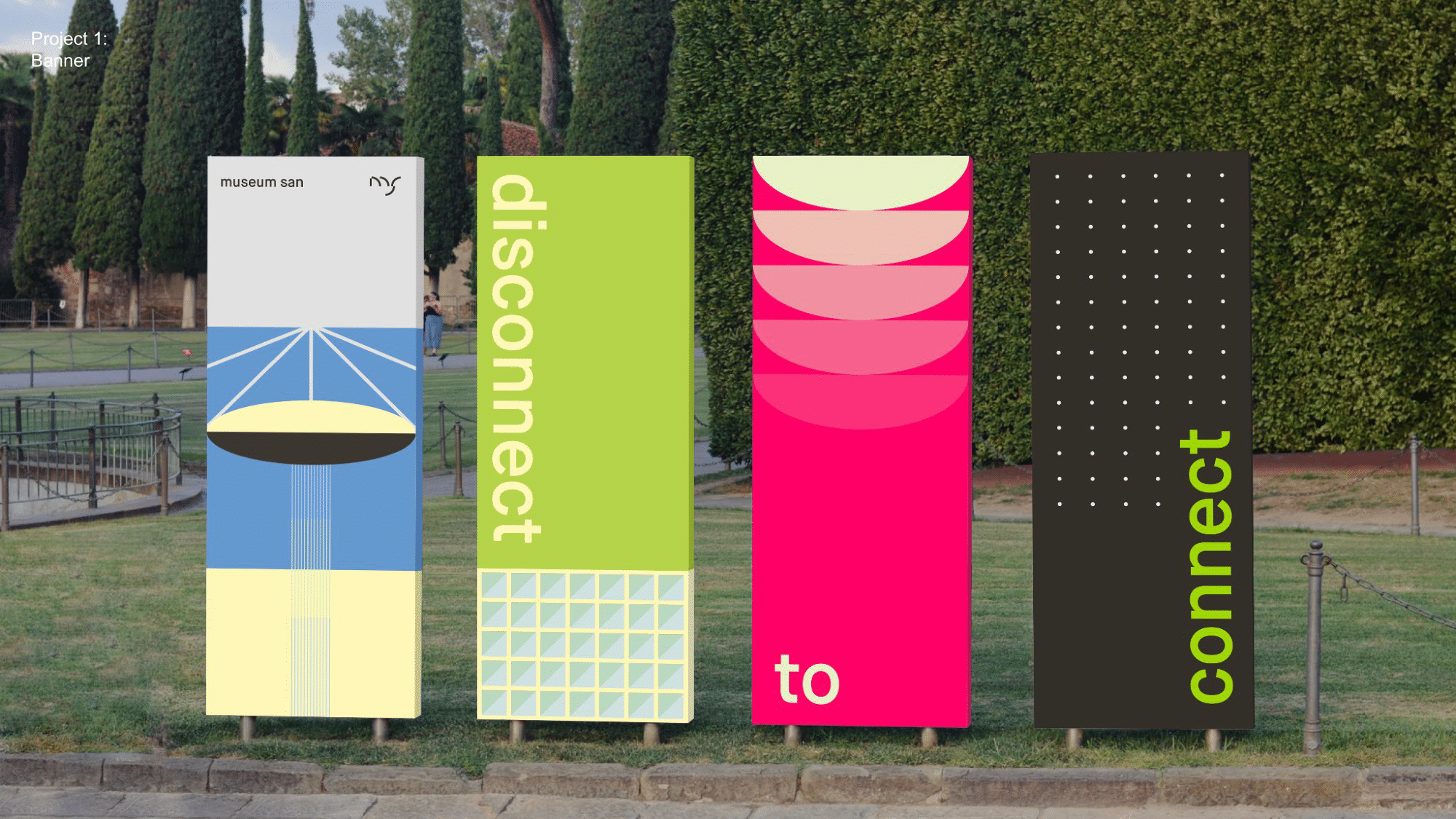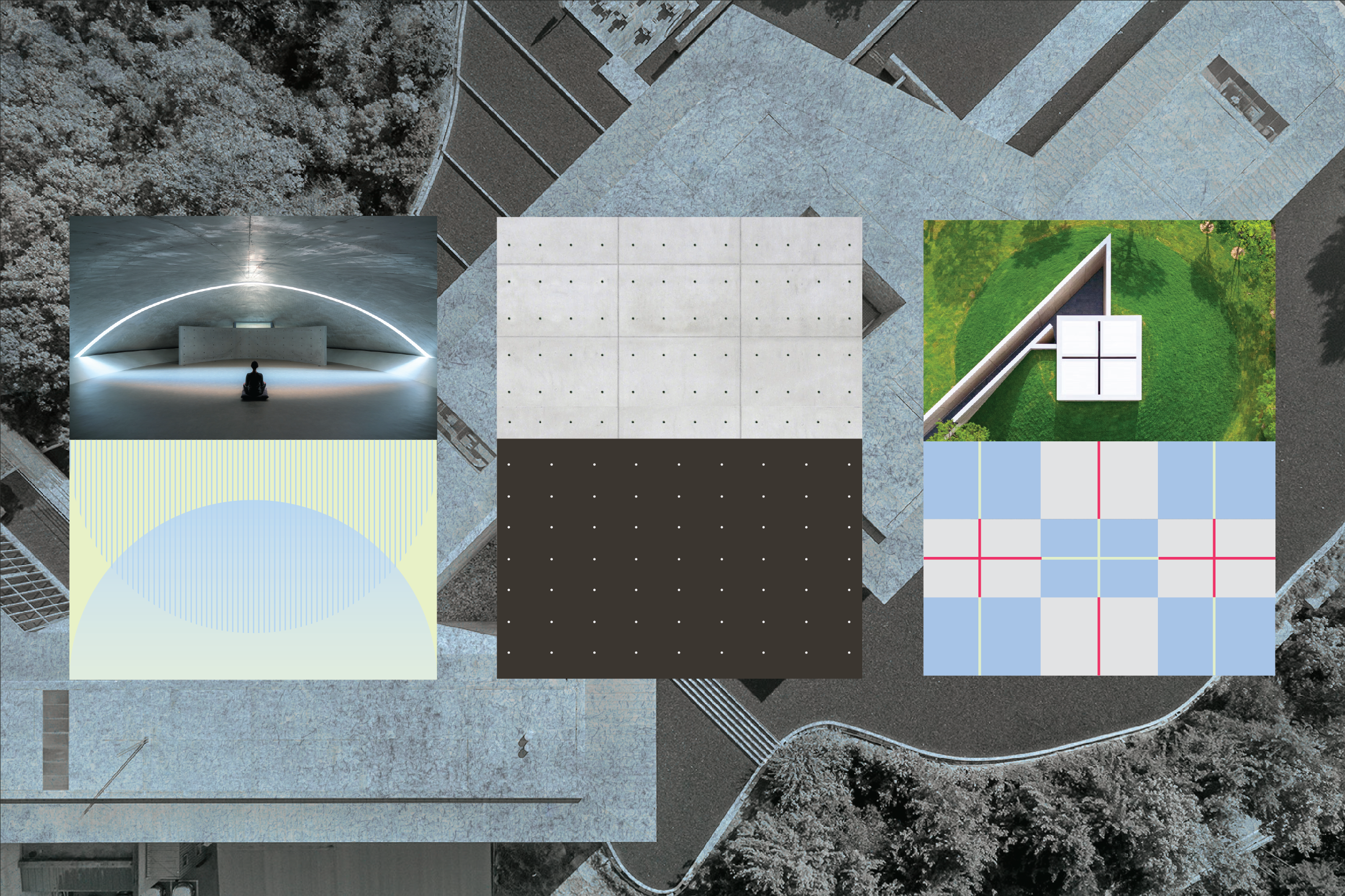 Instead of keeping original branding's muted and restricted tone, I actively used patterns and colors inspired by the nature and museum's architecture. Patterns were inspired by the shapes of shadows, the way light enters and spreads, and the gentle curves expressed in the buildings themselves. The color palette was derived from the shifting hues of the sky throughout the day. By using slightly more saturated tones, I aimed to create an inviting atmosphere that would resonate with a broad audience of all ages, including families with children.