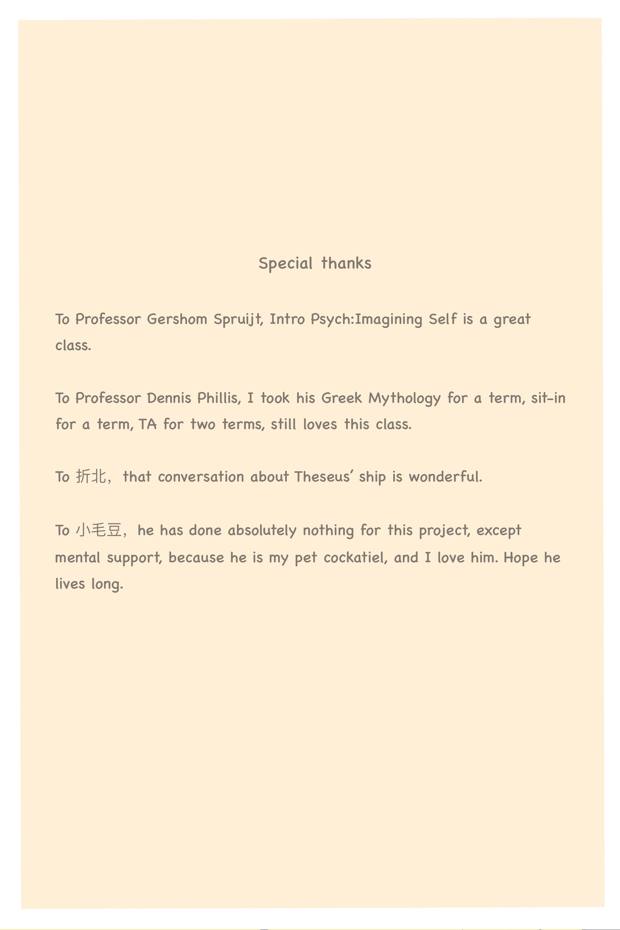 This is a term-long project about psychology: what is a “self”, and what’s the relationship between imagination and reality? Is “conversation” between 2 characters really a conversation, or rather a soliloquy of the artist? Am I truly experiencing the world, or am I only pretending—curling up in my mind and observing from a distance? Course: Intro Psych: Imagining Self Instructor: Gershom Spruijt