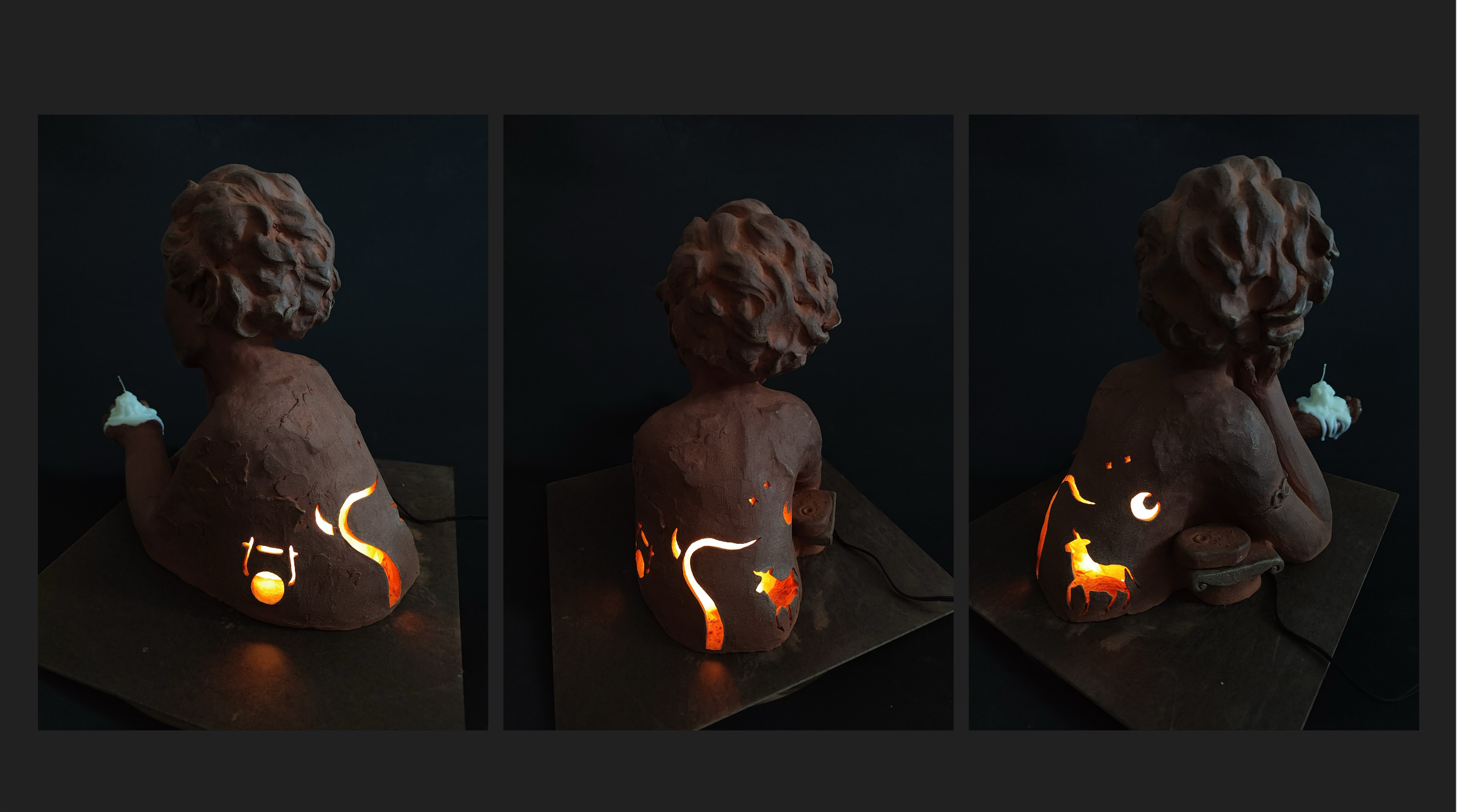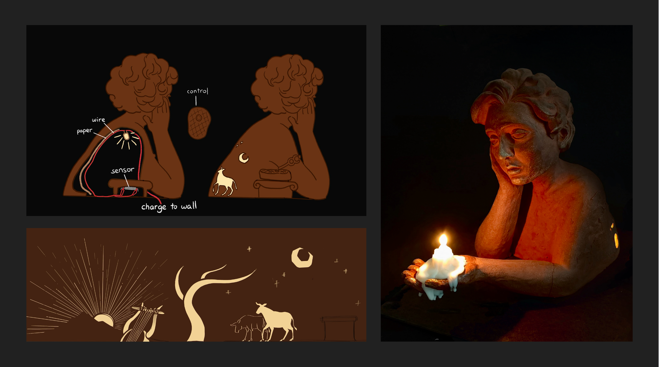 This project is a ceramic sculpture that incorporates a lighting element. The story is from the Homeric Hymn to Hermes: Hermes’ birth to the nymph Maia and Zeus. Hermes had a desire to taste beef—something not meant for a god—suggesting an underlying anxiety about mortality, both his mother Maia’s and possibly his own. The moment is when he cooked the beef and not able to eat it—reveals his divine identity. Course: Ceramic Future Lighting Instructor: Ariel Brice, Penny Herscovitch