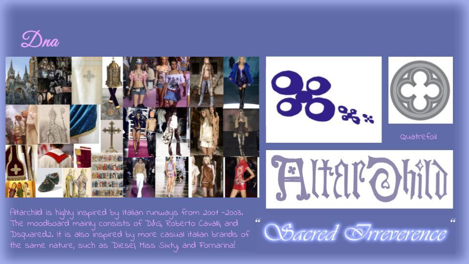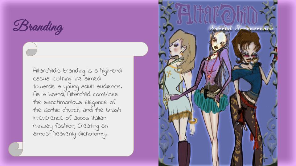 Altarchild is a high-end casual clothing line aimed towards a young adult audience. As a brand, Altarchild combines the sanctimonious elegance of the Gothic church, and the brash irreverence of 2000s Italian runway fashion; Creating an almost heavenly dichotomy.