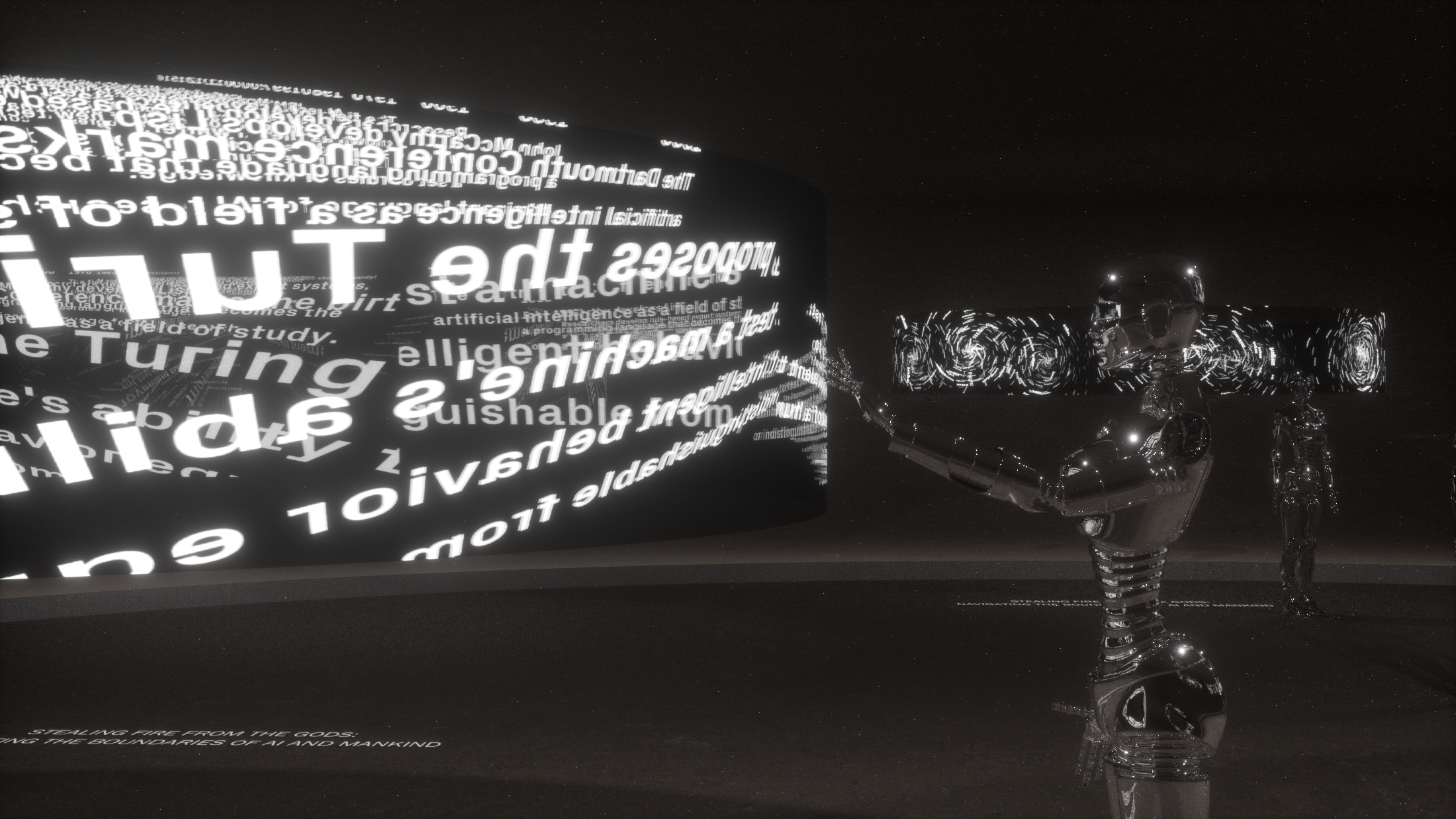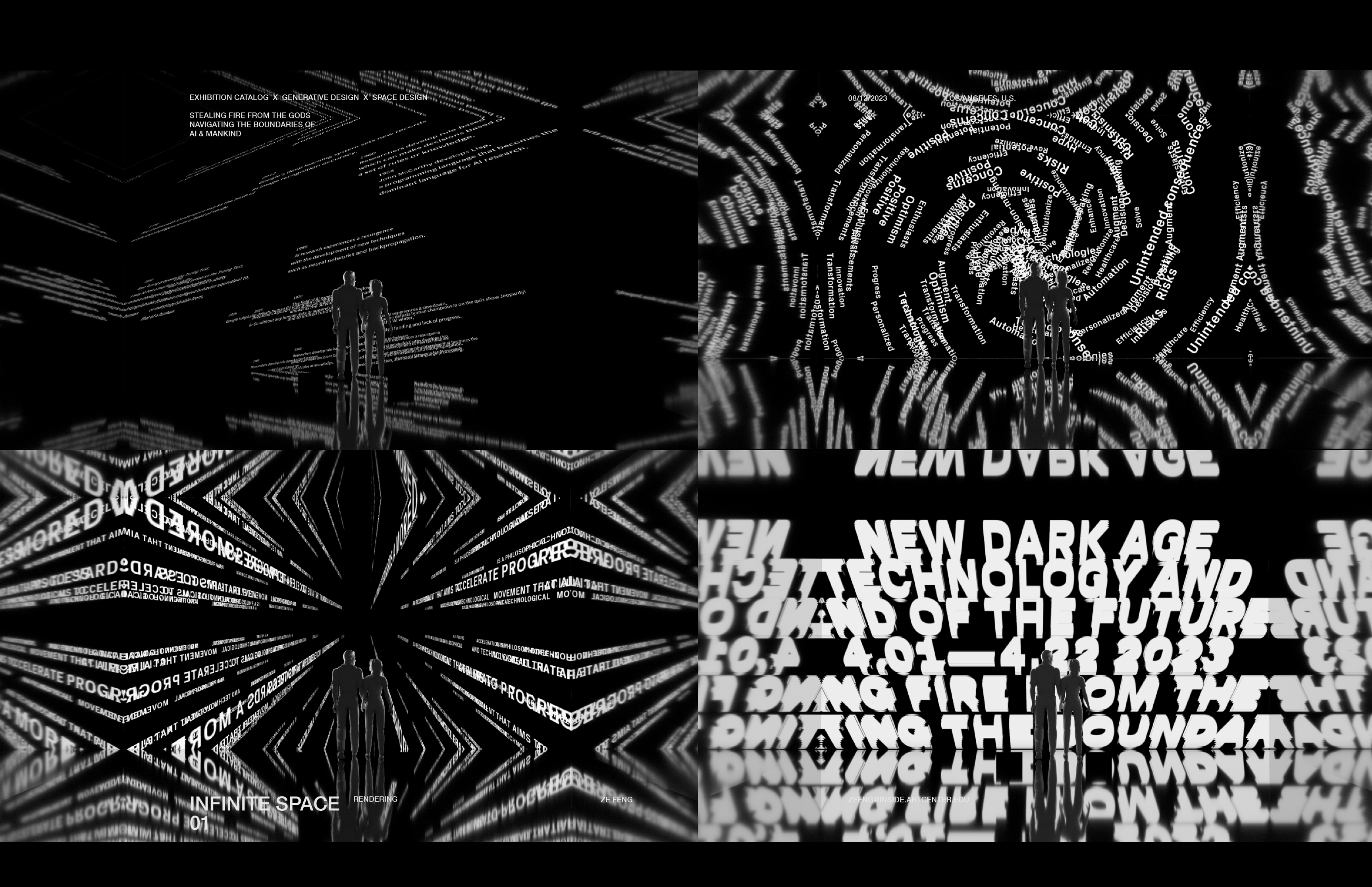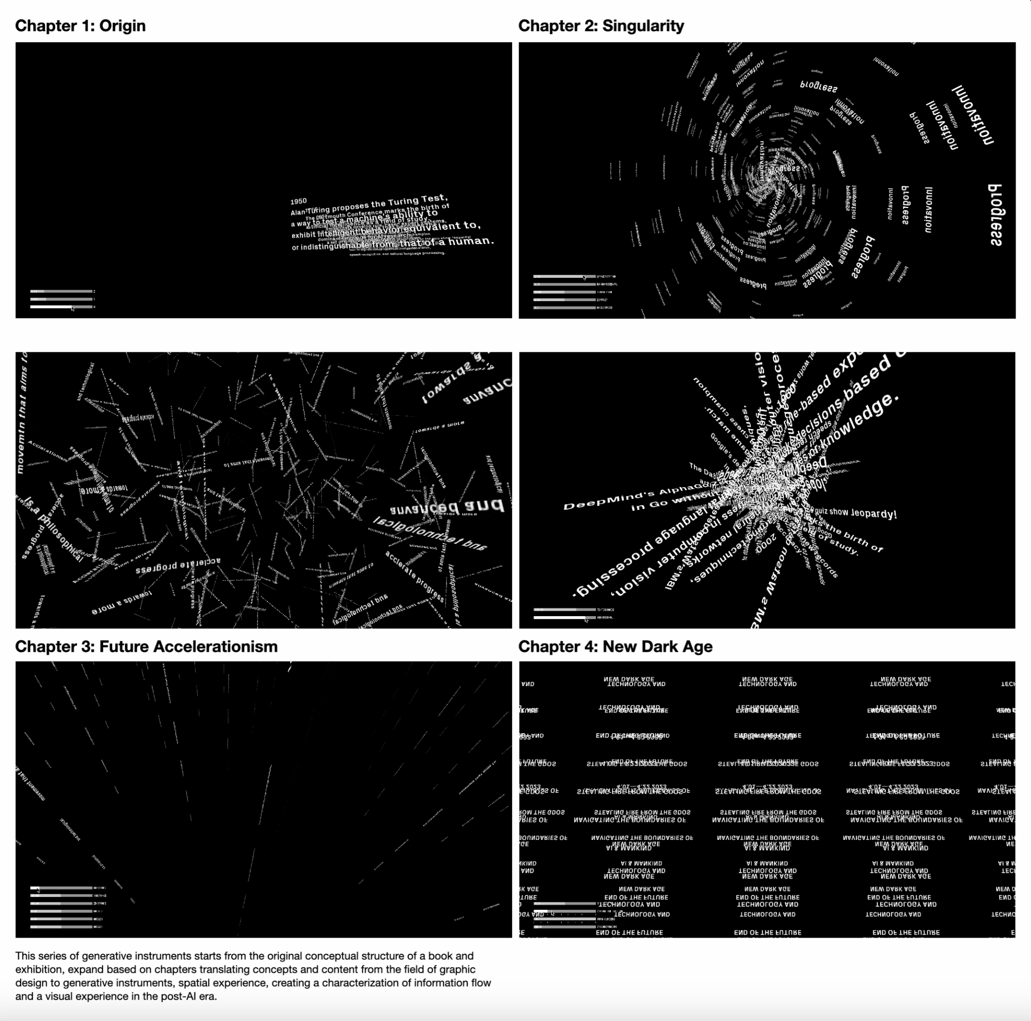 This series of generative instruments starts from the original conceptual structure of a books and exhibition (Stealing Fire From the Gods), expand based on chapters (origin, singularity, future accelerationism, new dark age, etc.)translating concepts and content from the field of graphic design to generative instruments, spatial experience, creating a characterization of information flow and a visual experience in the post-AI era.