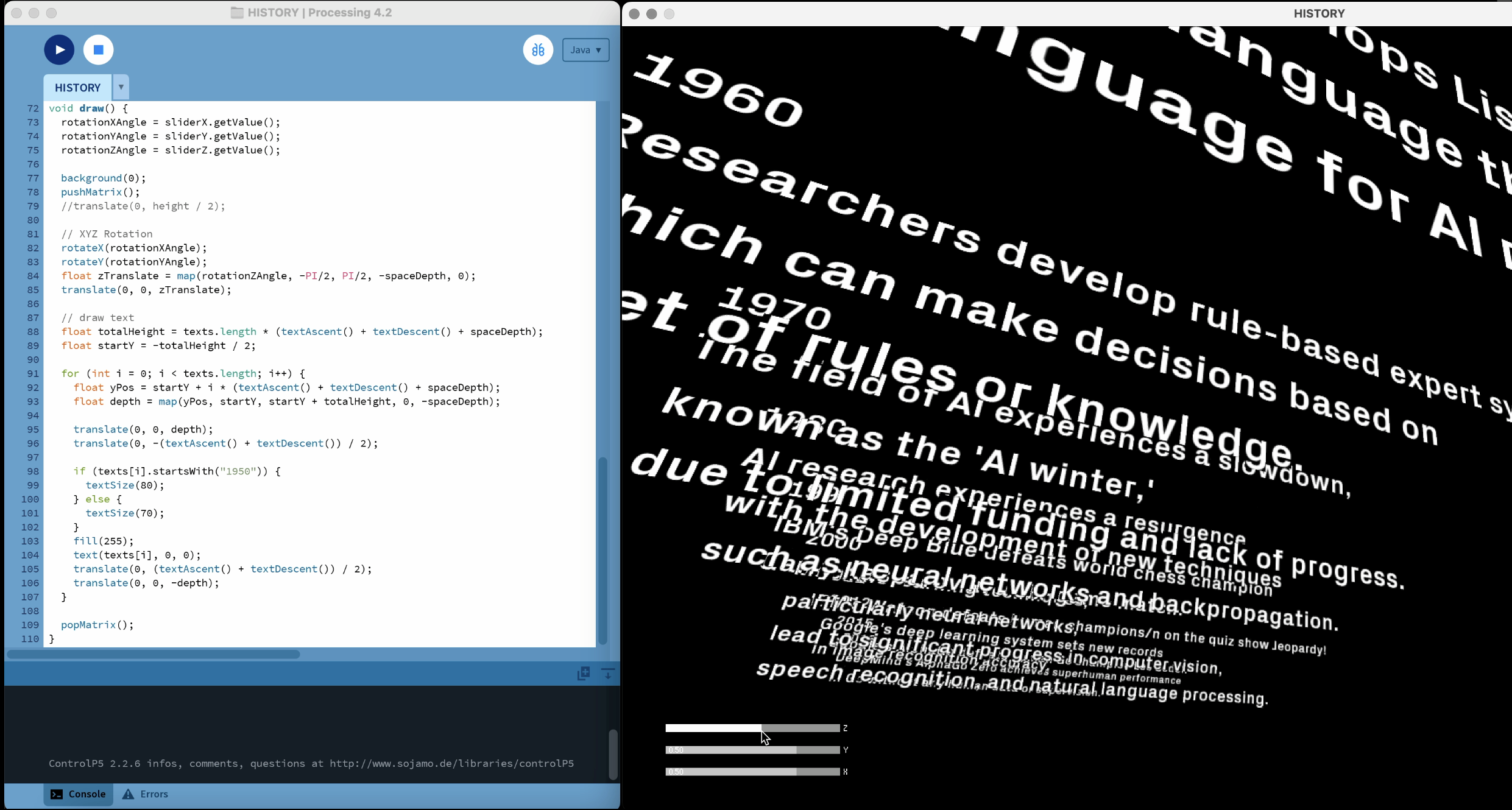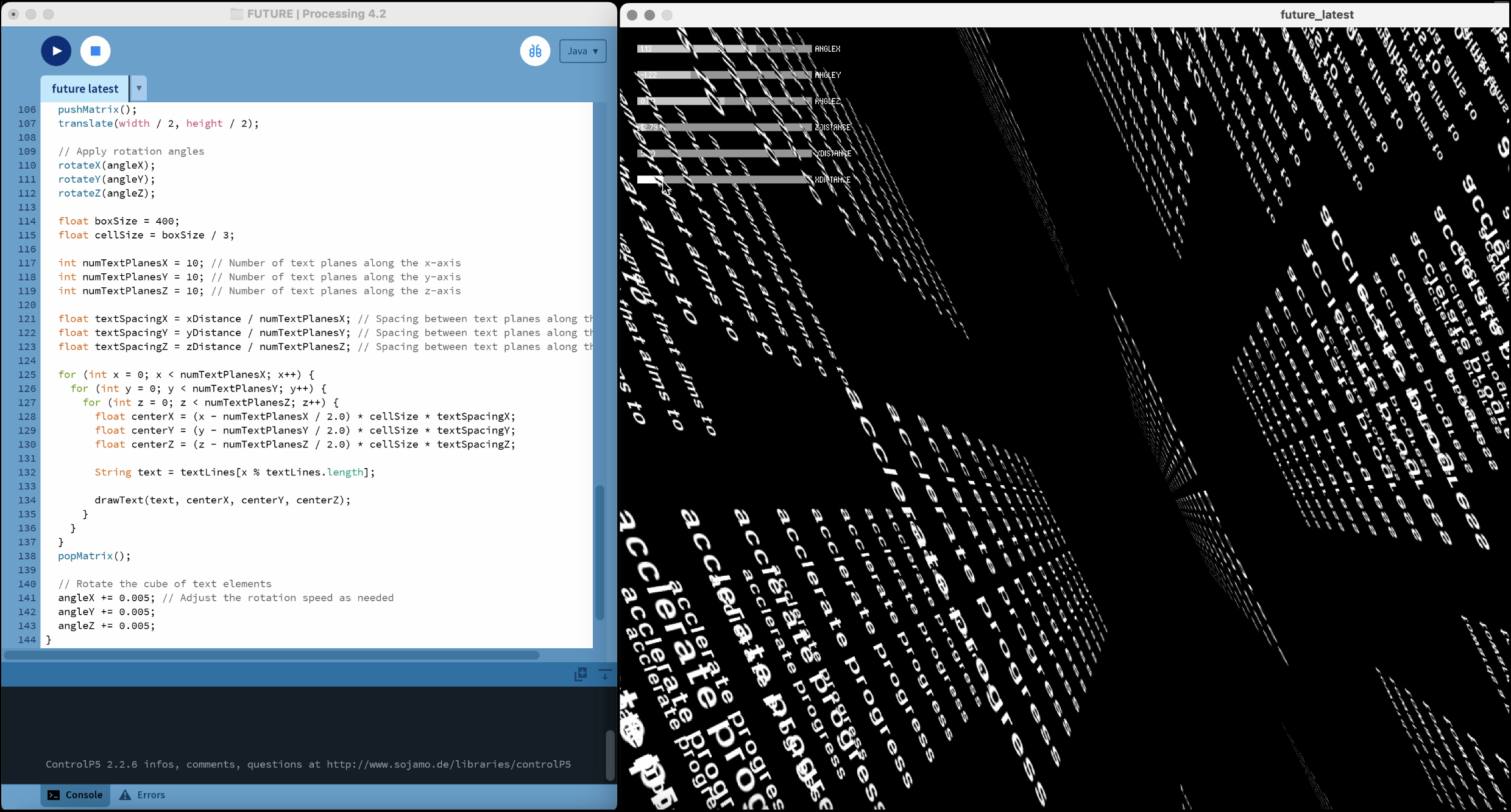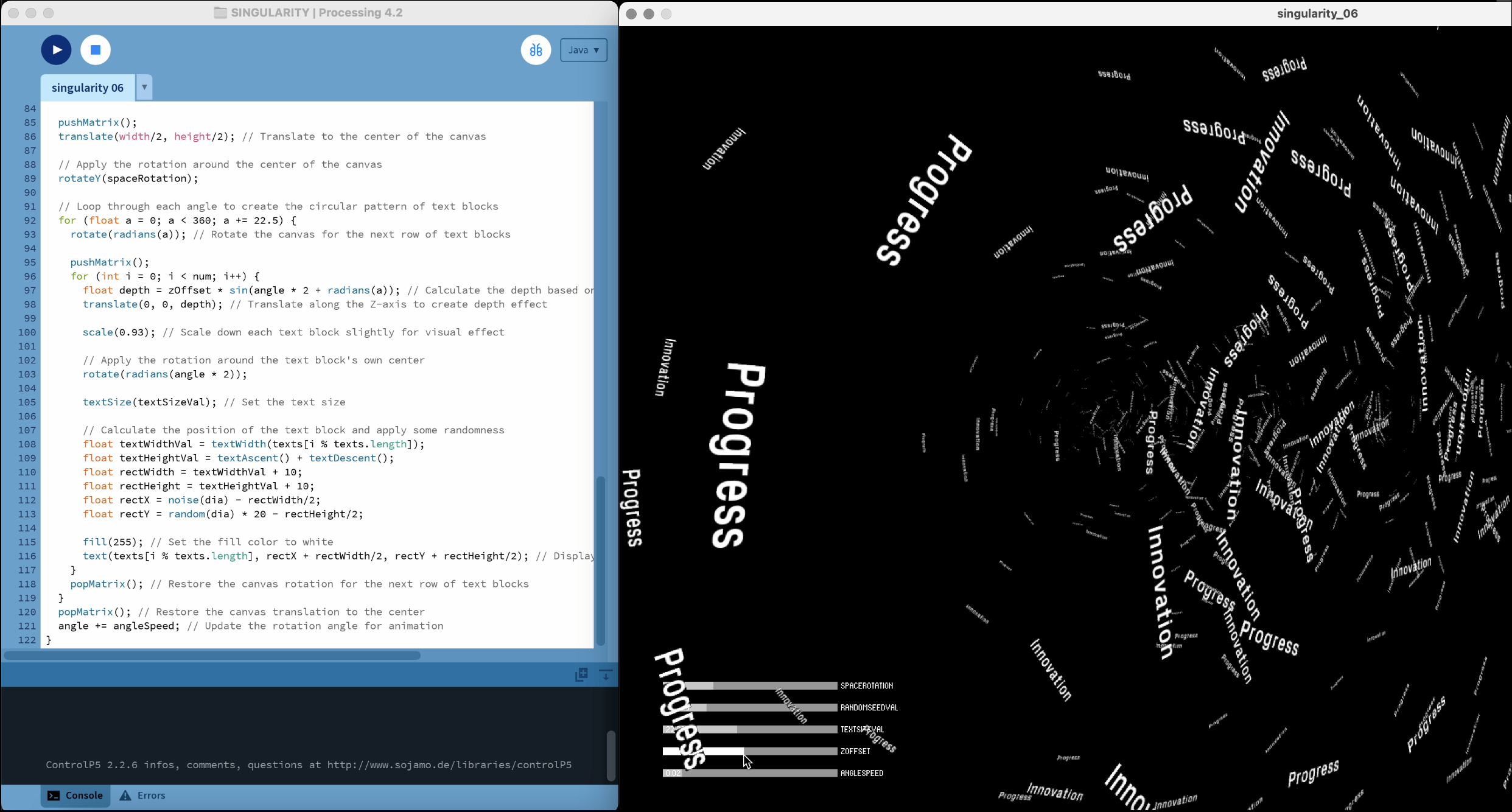 This series of generative instruments starts from the original conceptual structure of a books and exhibition (Stealing Fire From the Gods), expand based on chapters (origin, singularity, future accelerationism, new dark age, etc.)translating concepts and content from the field of graphic design to generative instruments, spatial experience, creating a characterization of information flow and a visual experience in the post-AI era.