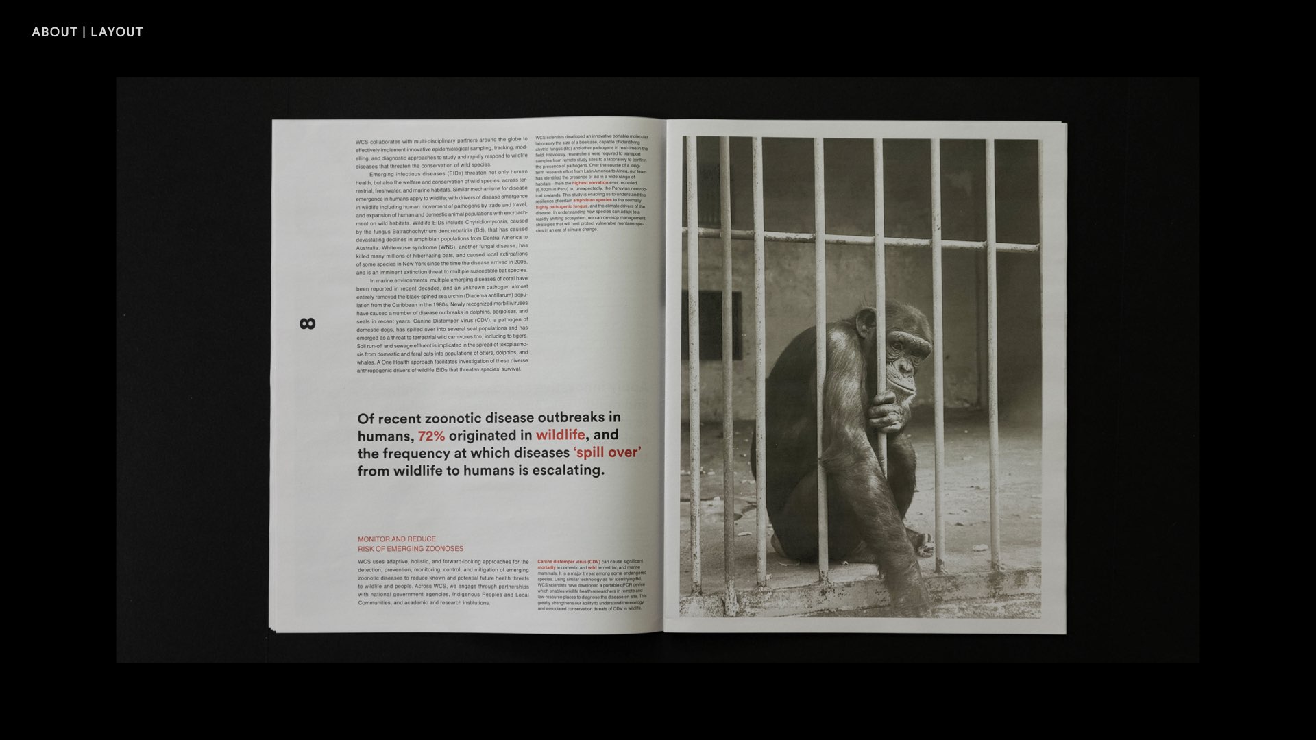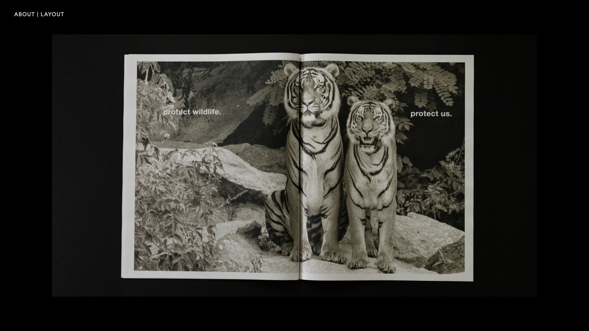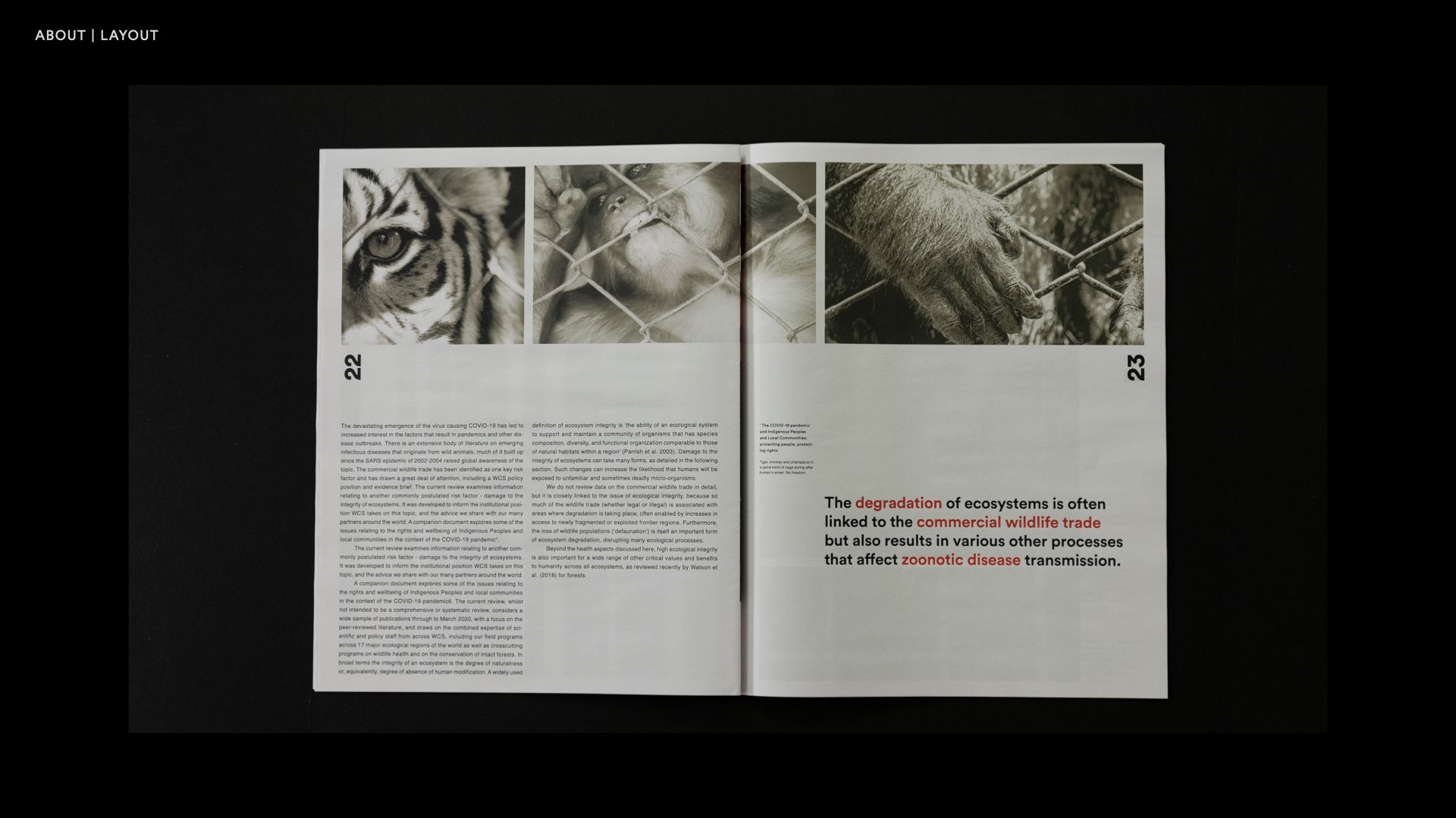 This work is a small magazine, with a message to remind people of the need to protect animals. I used different colors in pictures and fonts to remind readers of the different aspects of the relationship between humans and animals, hoping that they will understand the coexistence.