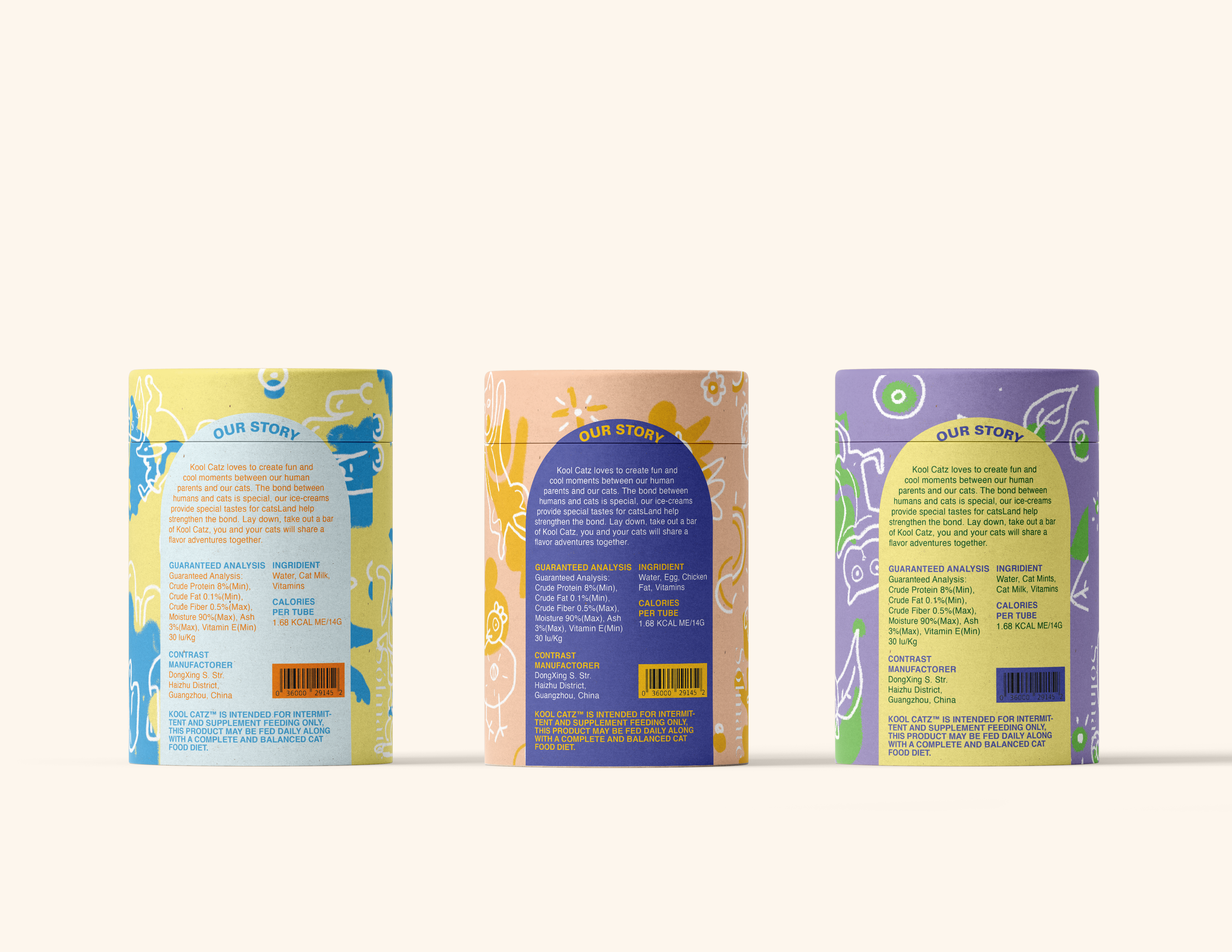 This project is to develop a product line for a packaging design for cats treats. To raise the customer experience to enjoy the ice cream, pet ice cream become necessary for pet and human. By using illustrations and using sustainable material to create a fun reaction between pets and their owner. The products are introduced 3 tastes for the cats. The consumer should be attracted by the color on the box and use the idea of protecting the Earth to ingratiate the high-income group.
