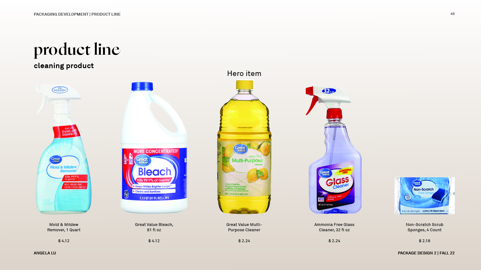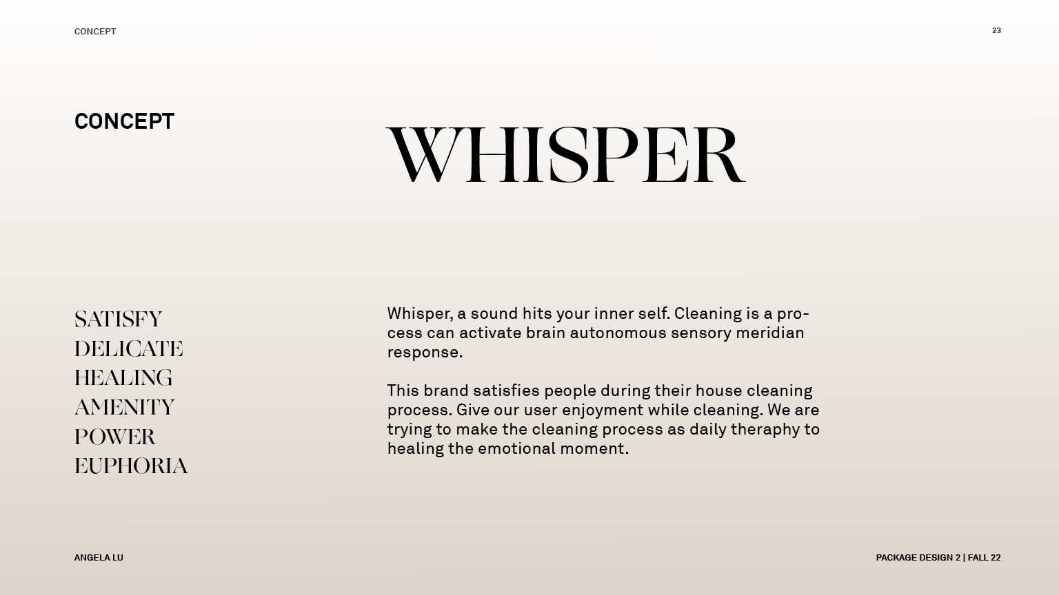 This is a rebranding project for Walmarts Great Value. My Project is focusing on household cleaning products. The concept of my branding is Whisper. This brand satisfies people during their house cleaning process. Give our user enjoyment while cleaning. Using the idea of satisfaction to heal people from intense work and life.
