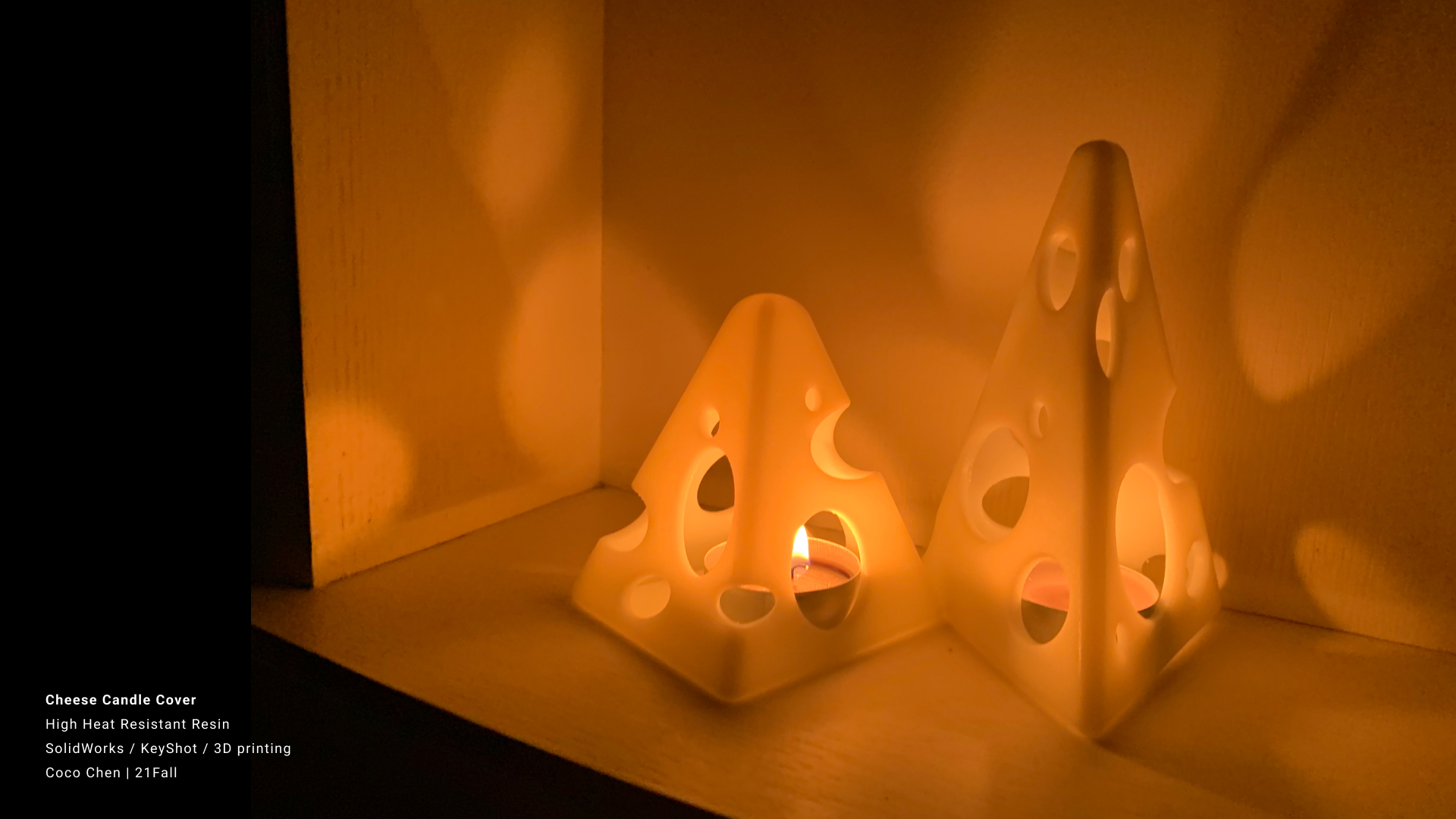 Graduates Select DepartmentBrand Design & StrategyCreative DirectionEntertainment DesignFilmFine ArtFurniture, Lighting and FixturesGraduate ArtGraduate FilmGraduate Graphic DesignGraduate Interaction DesignGraduate Spatial Experience DesignGraphic DesignIllustrationIndustrial DesignInteraction DesignMedia Design PracticesPhotography and ImagingProduct DesignSpatial Experience DesignTransportation DesignTransportation Systems and Design Back to Projects Zhenke Chen BS in Interaction Design — Interaction Design Course: INT-201 Product: Rapid Prototyping Cheese Candle Cover Designed inspired by the holes in cheese and use it to create a tempting and appetizing light effect Learning Outcomes: the use of SolidWorks modeling, material choosing, using high-temperature resin material 3d printed candle cover Image Image Image Image