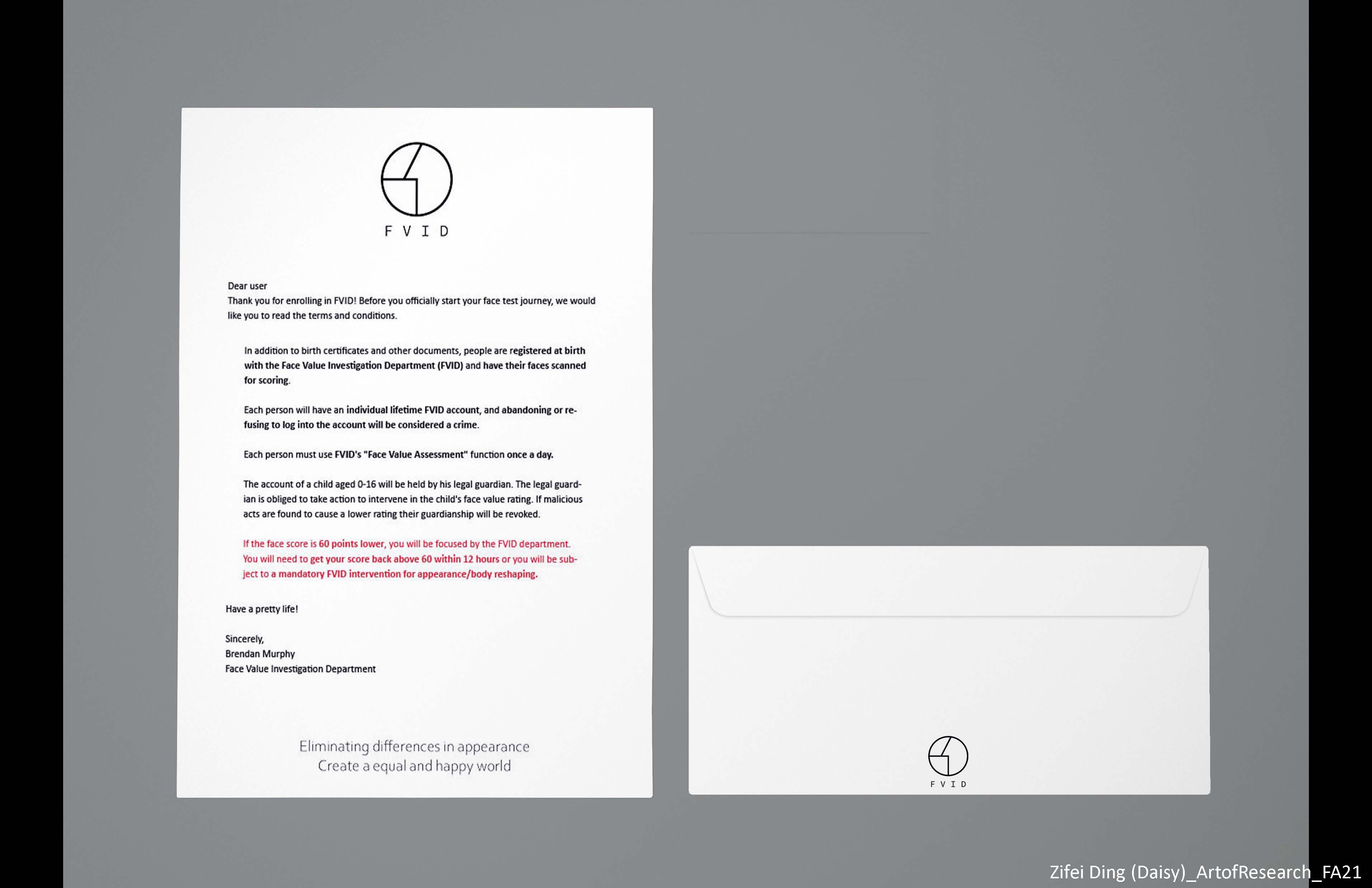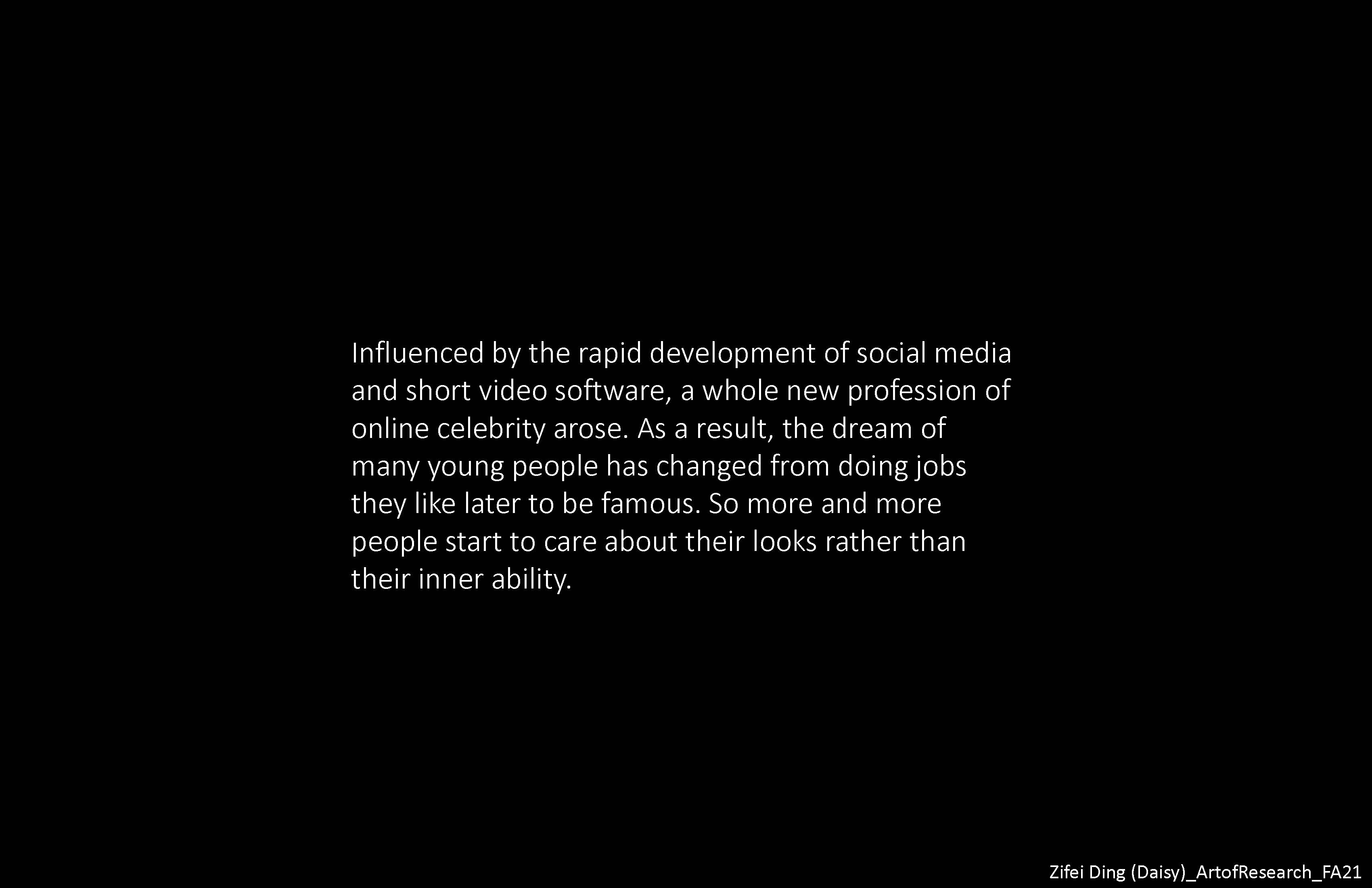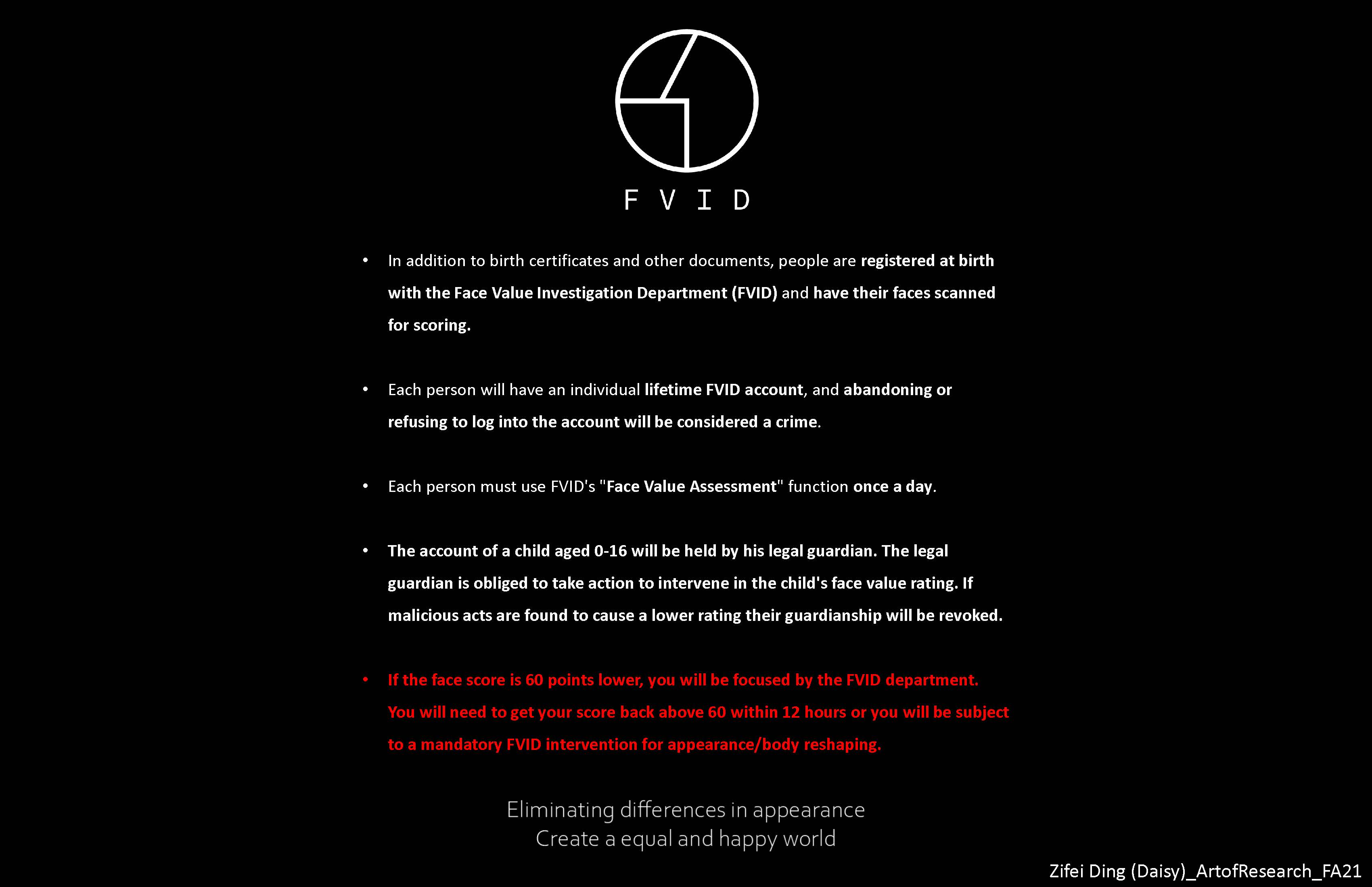 Influenced by the rapid development of social media, a whole new profession of online celebrity arose. More and more people start to care about their looks rather than their inner ability. In the art of research, I investigate and analyze the underlying causes of this social phenomenon and expose the huge negative effects it brings. I created a virtual organization called the Face Value Investigation Department to tell people what the future holds if they don't take this issue seriously.