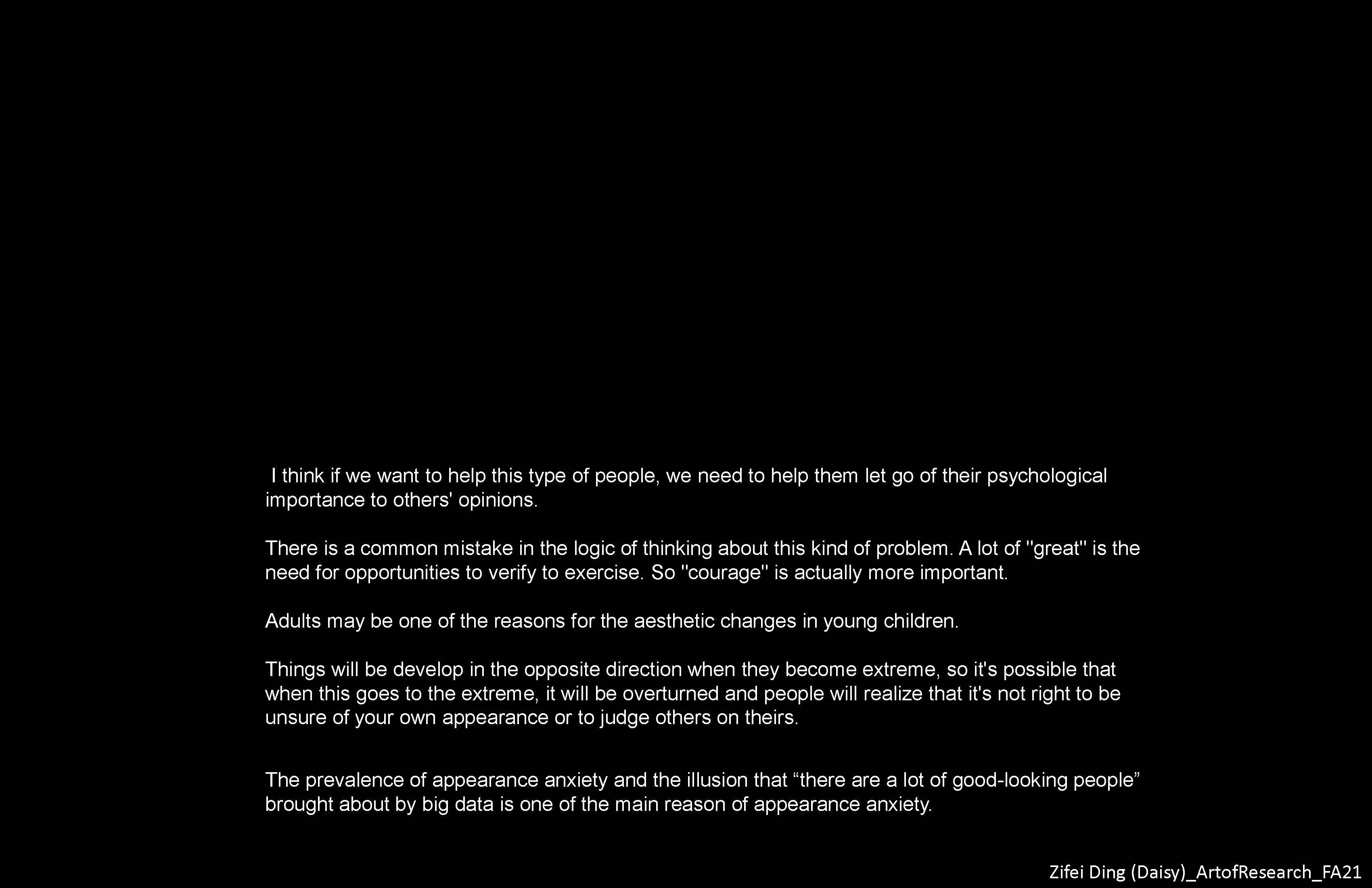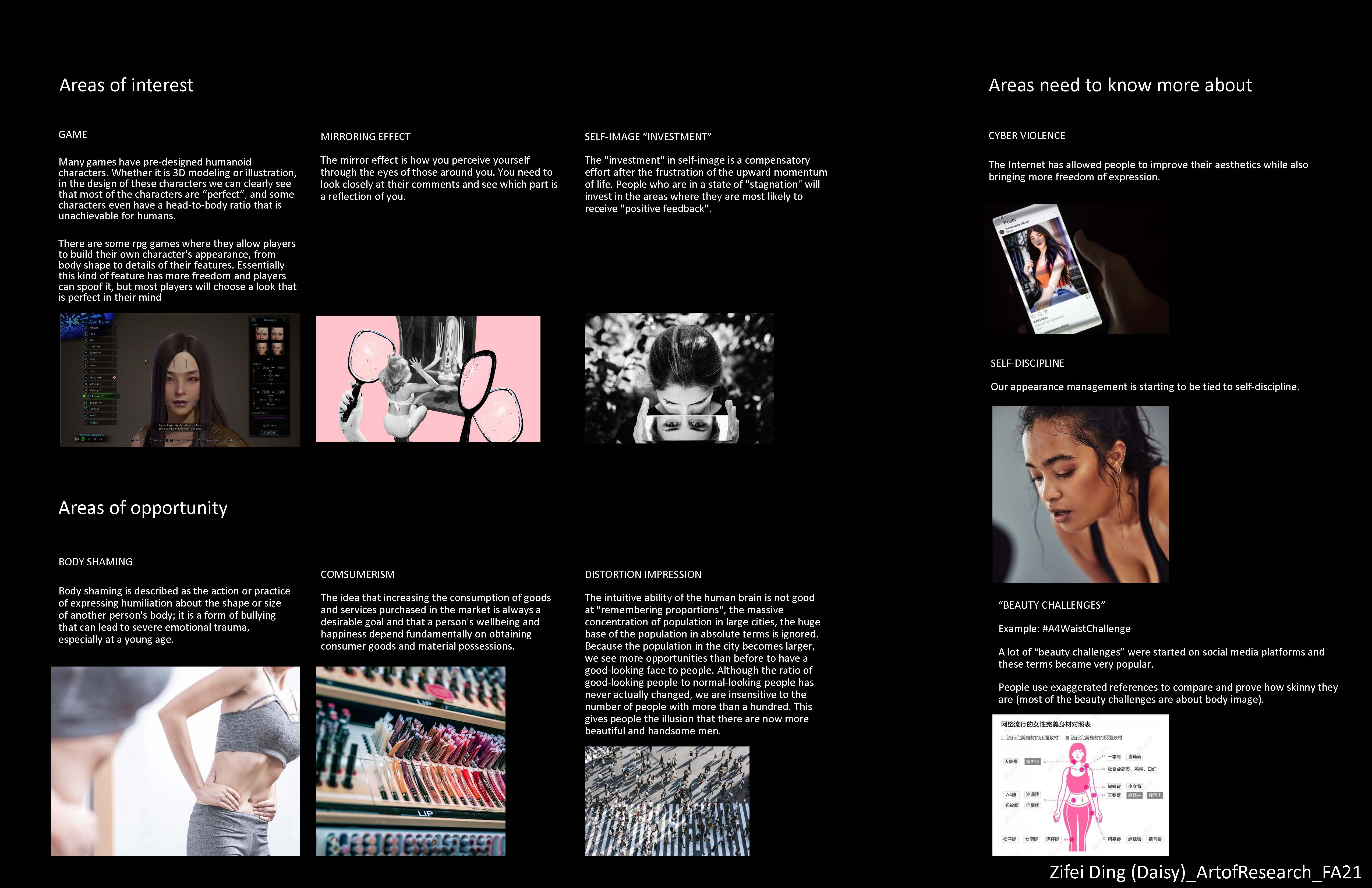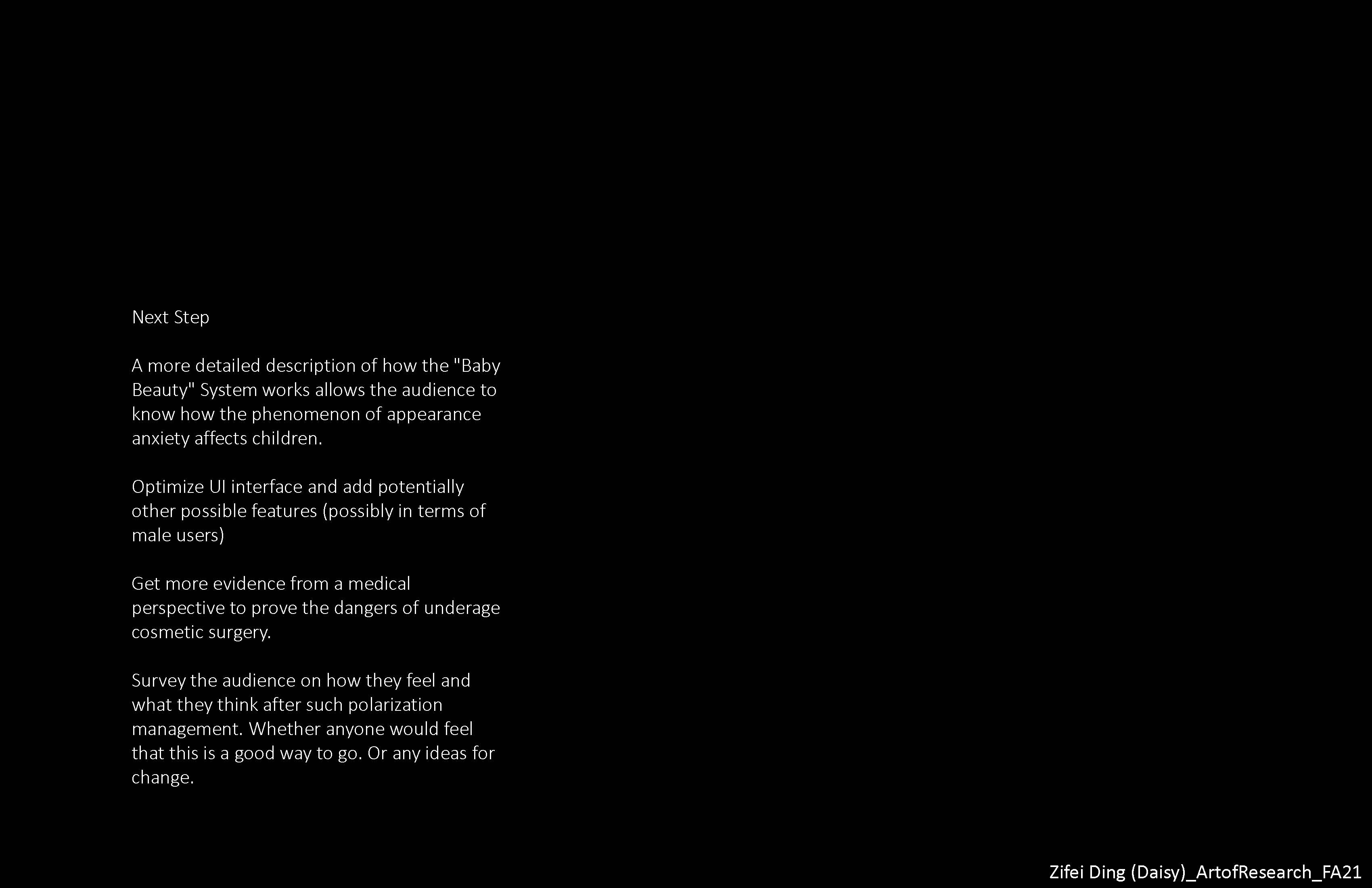Start with a topic that interests you, keep looking for the interesting place behind it, and look for ways to solve the problem from the designer's point of view. Constantly looking for information and analysis. I learned and used different research methods: Observational Research, Isolation Experiment, and Interview, which will have an impact on my future design process.