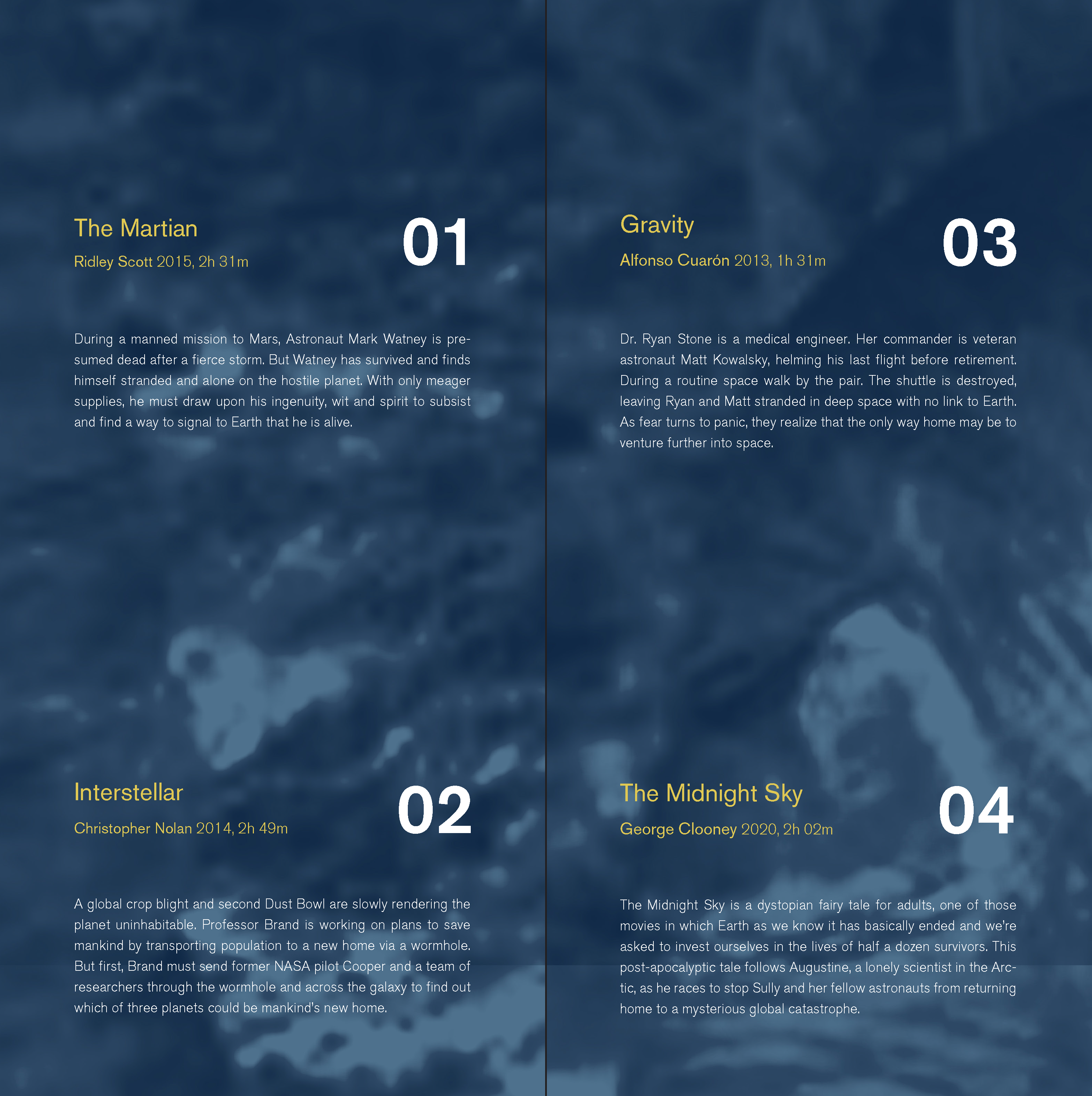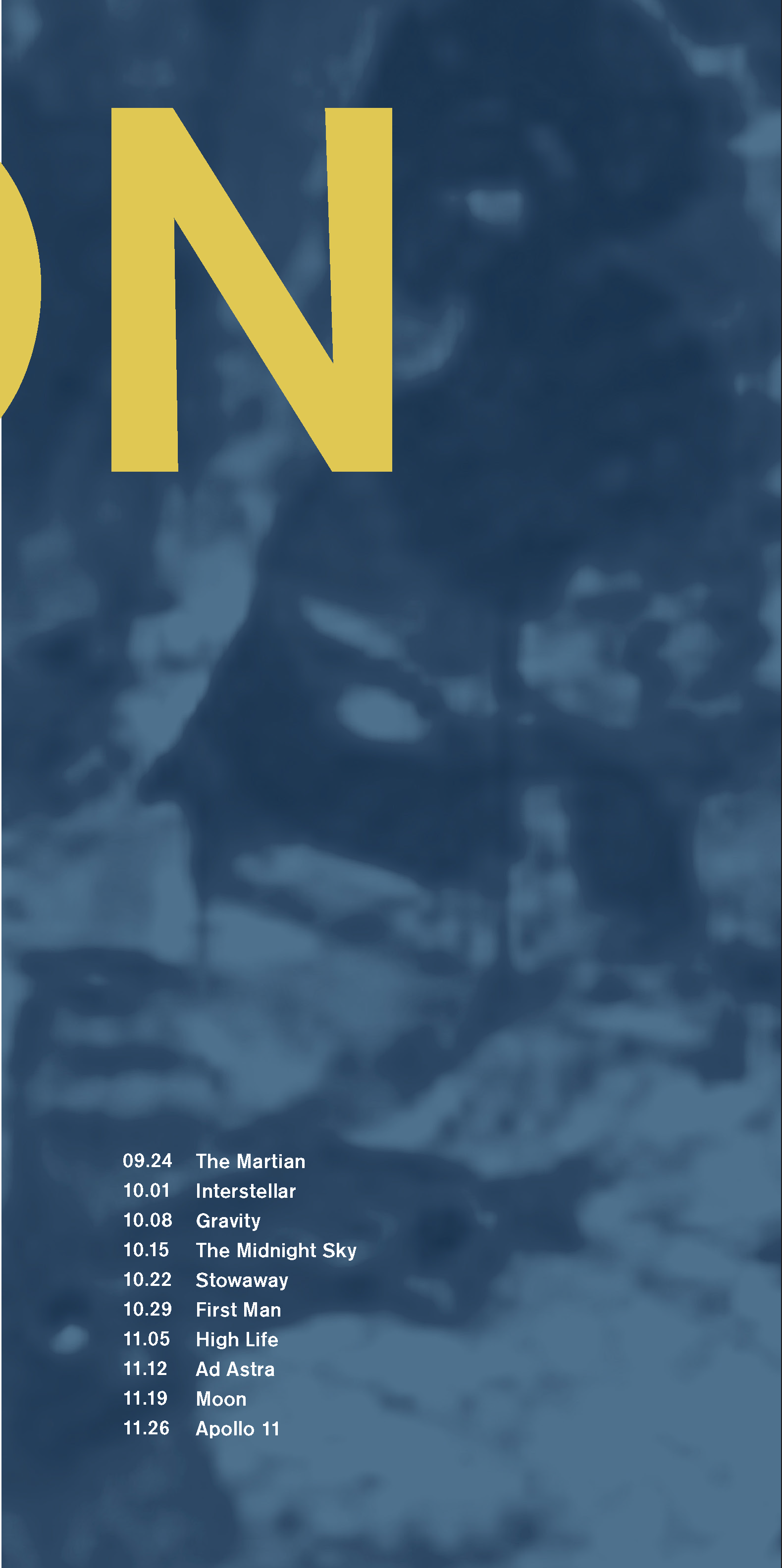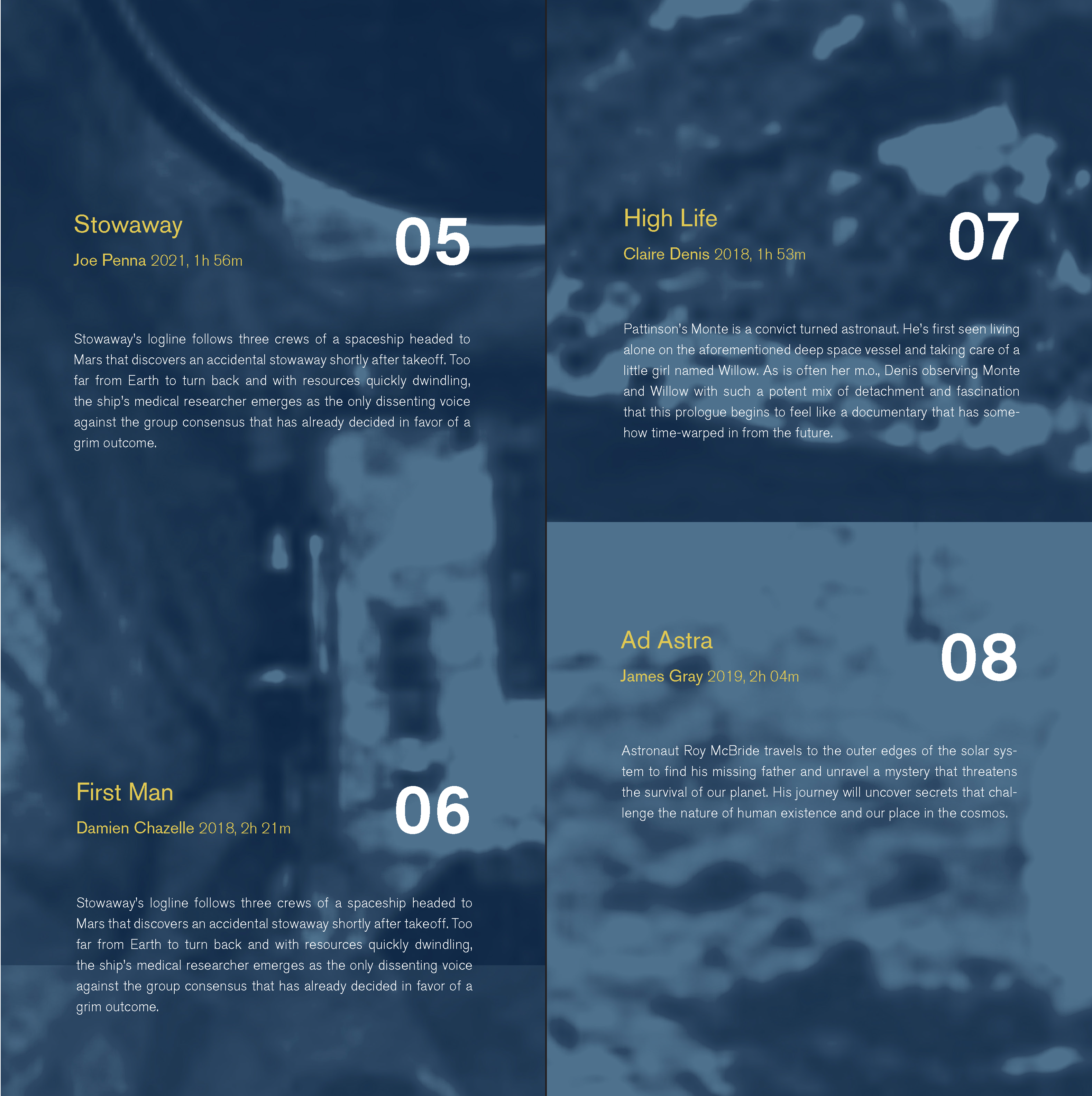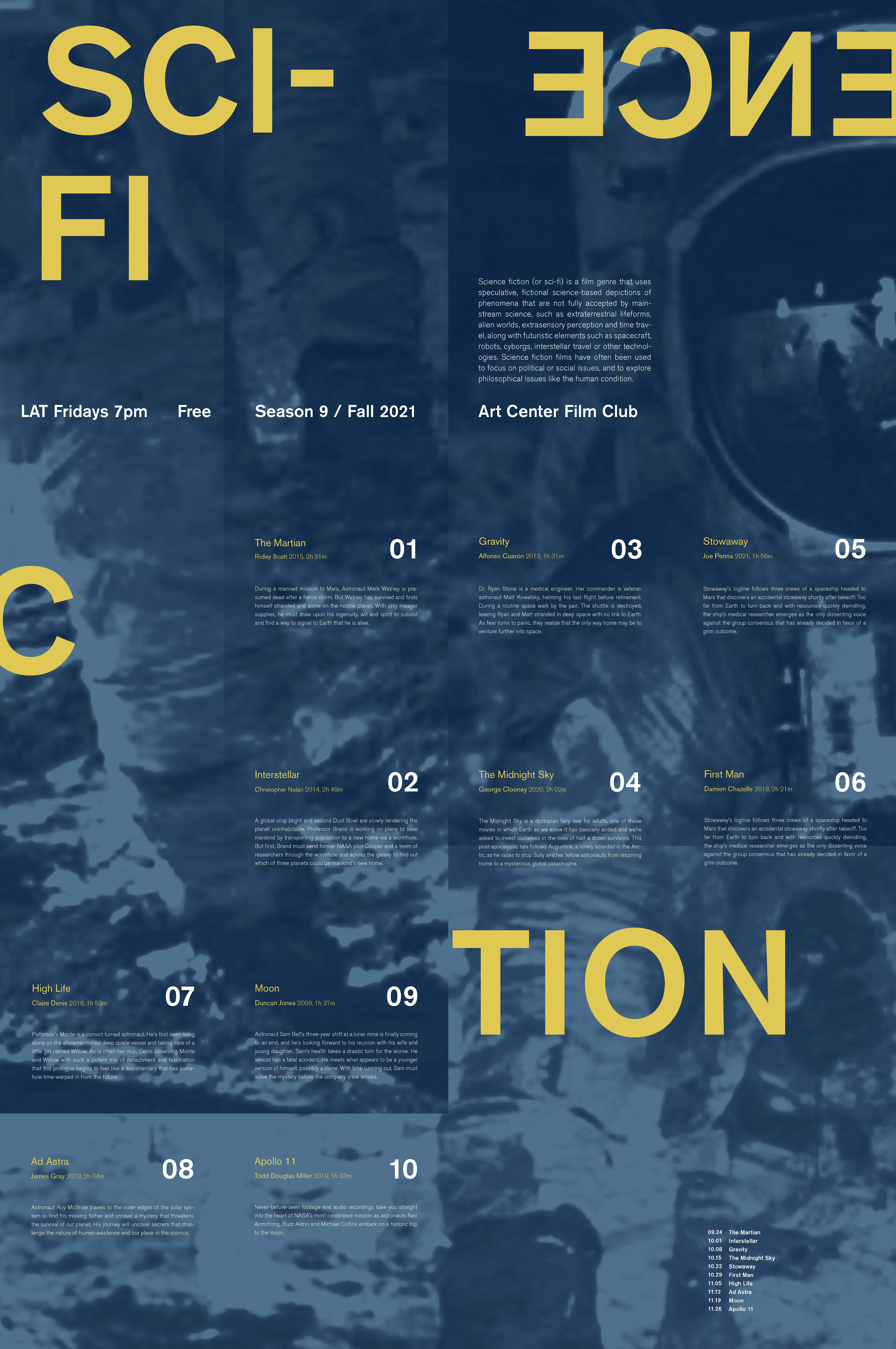 For this project I needed to create a poster for the Art Center Film Club with a list of films on a specific topic. This poster could also be folded and cut down to a small, easy-to-read brochure to save on printing costs. I chose a sci-fi (science fiction) film series and assigned a list of relevant films.
