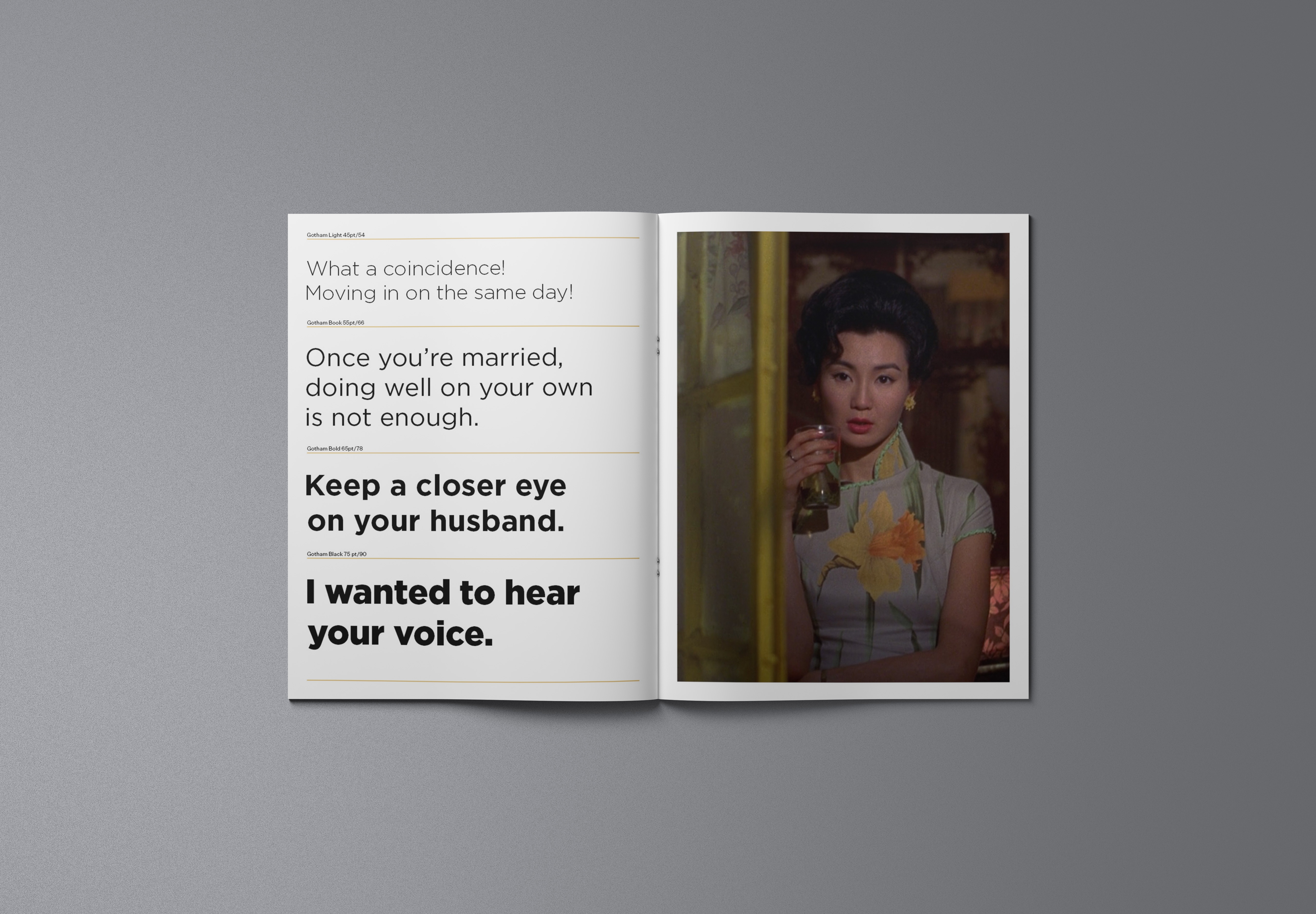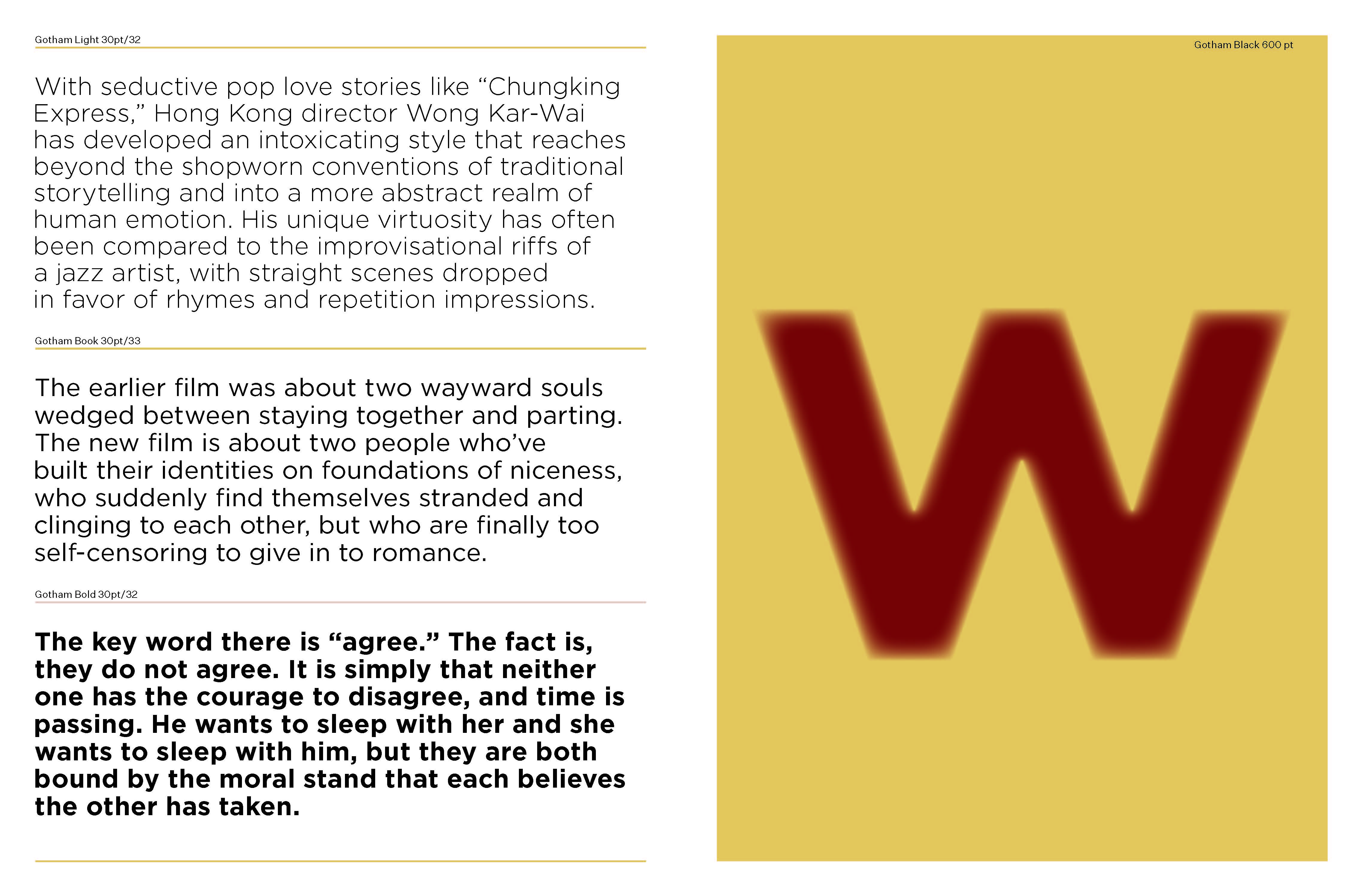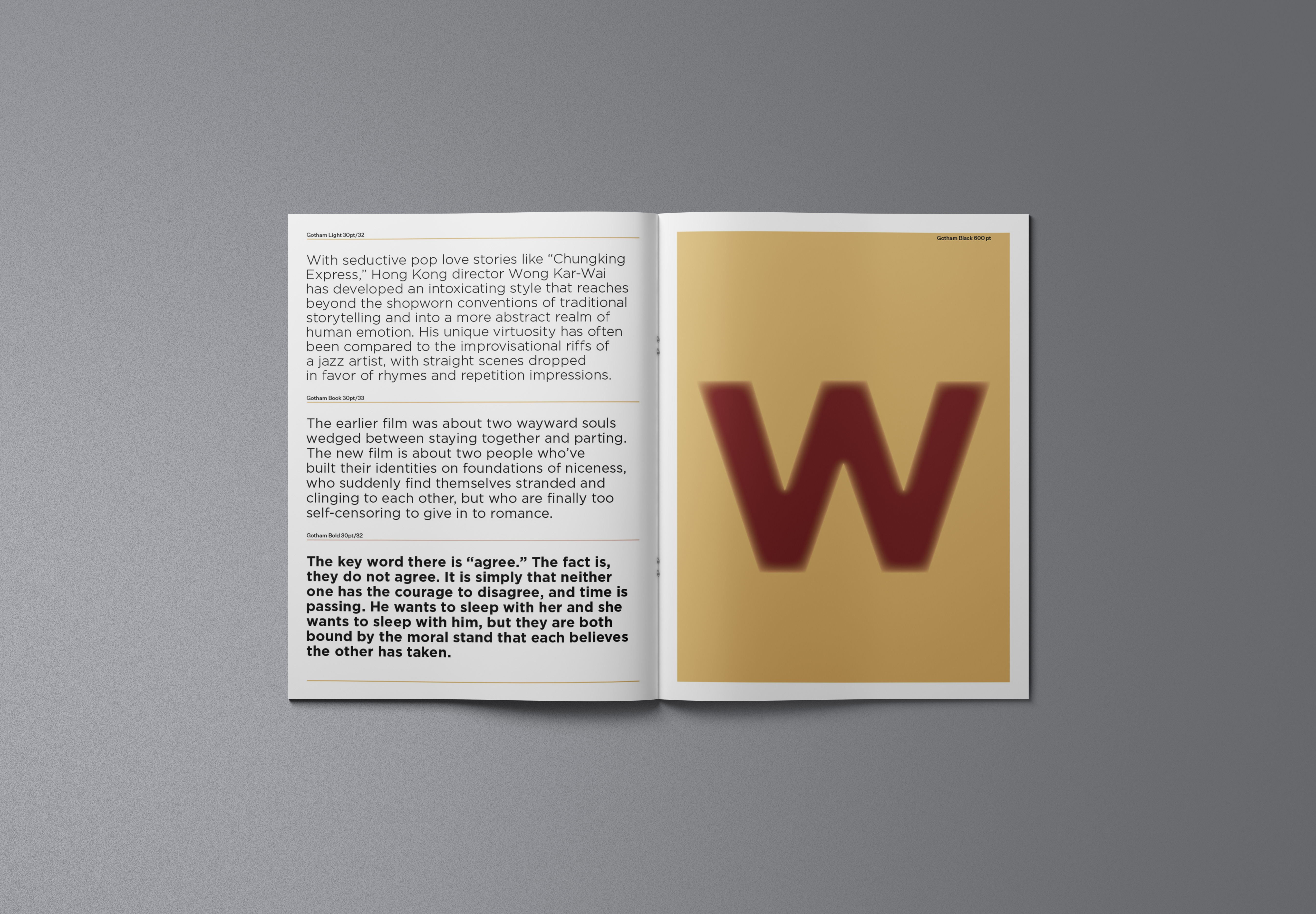 Specimen book for Gotham contains reviews of director Wong Kar-wai's work and keywords from his films to showcase the Gotham font.
