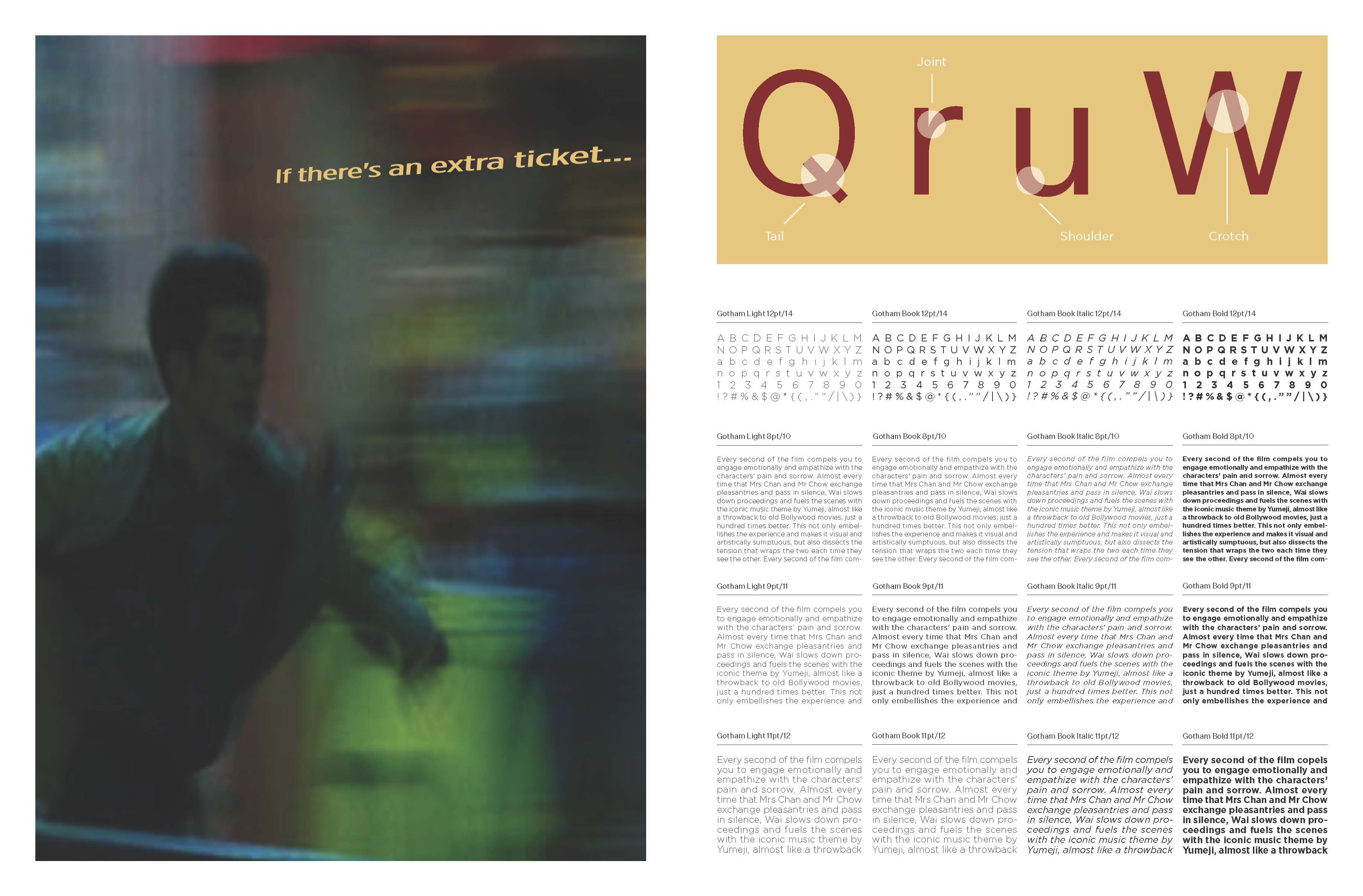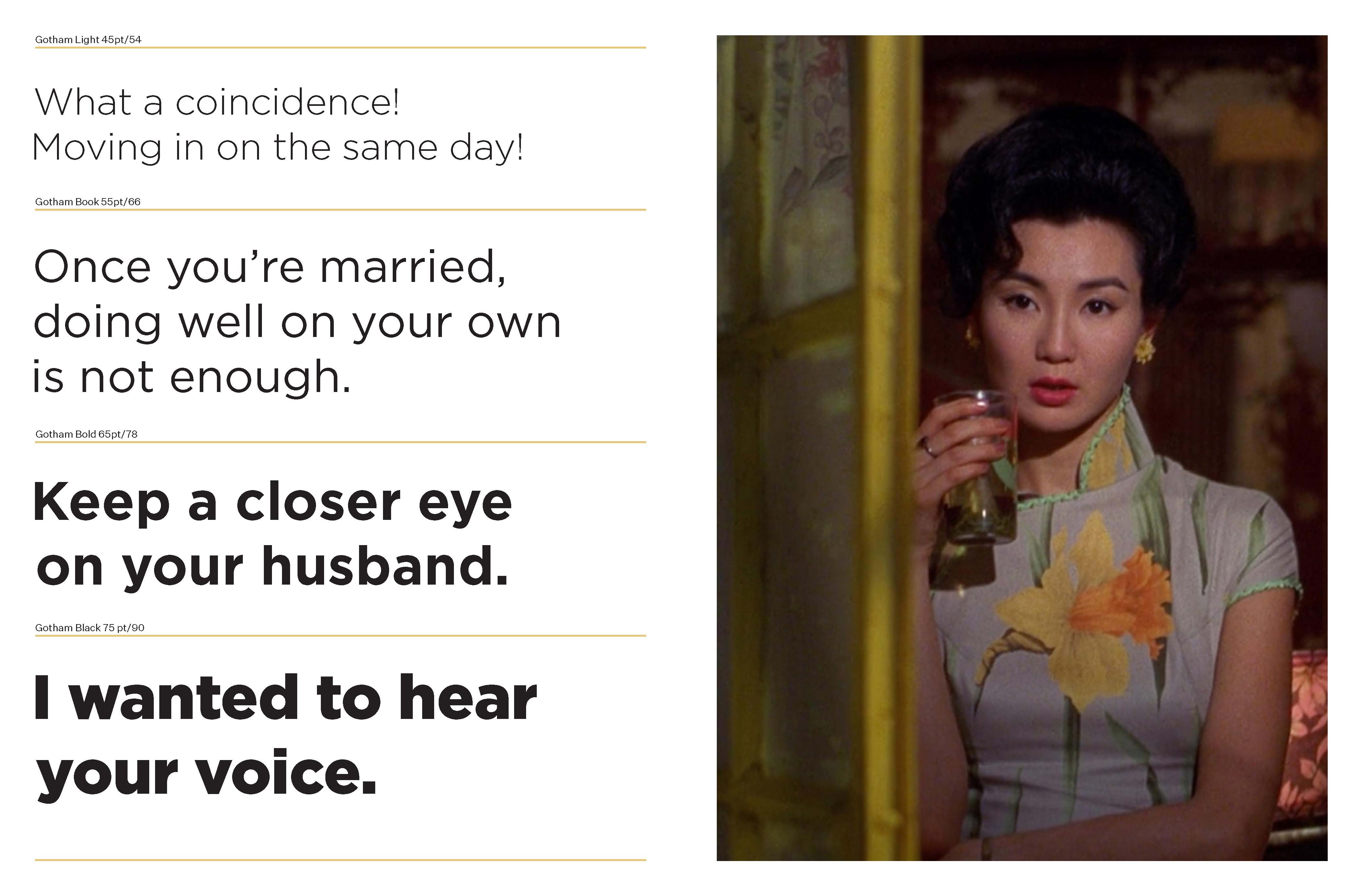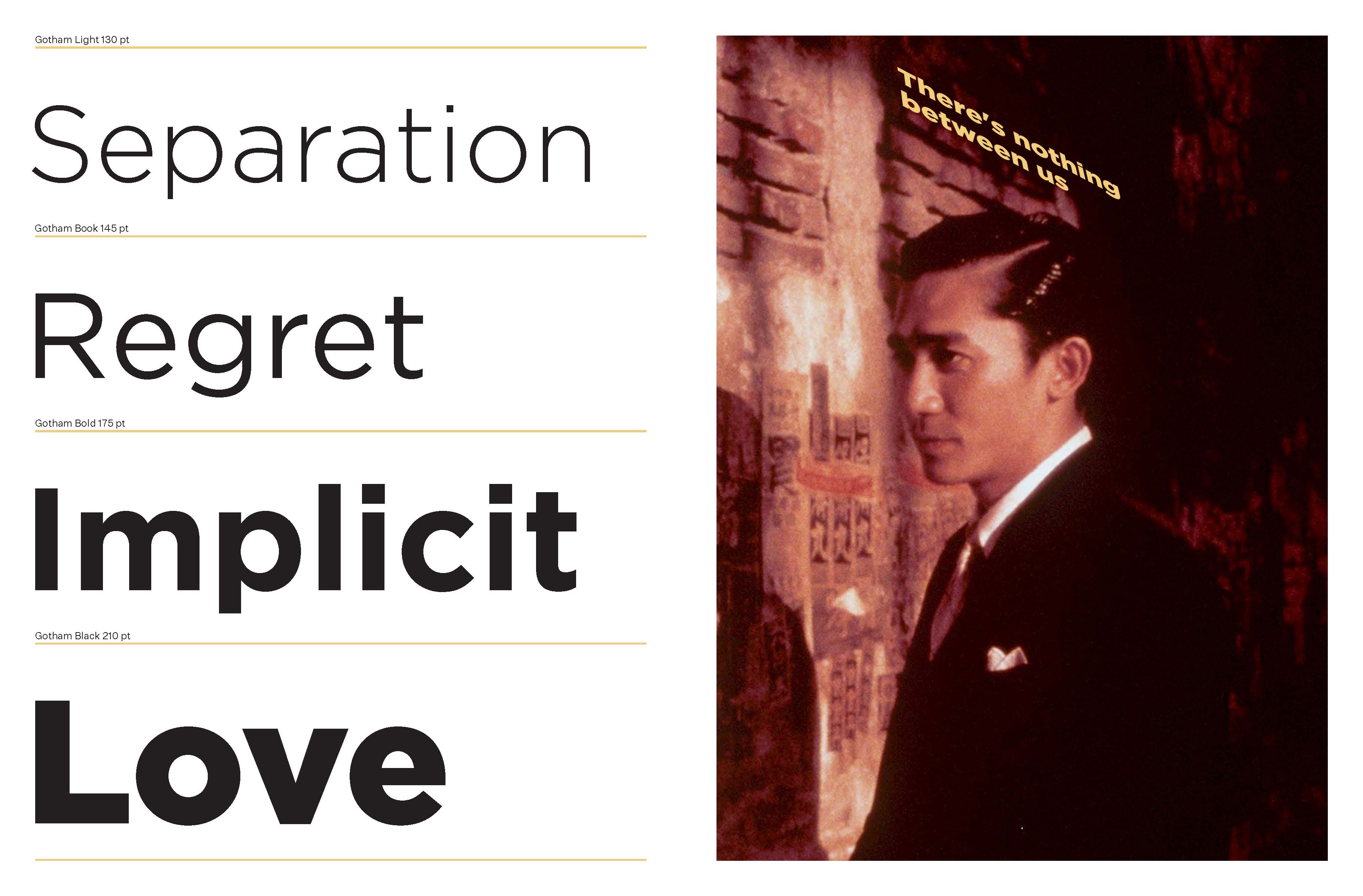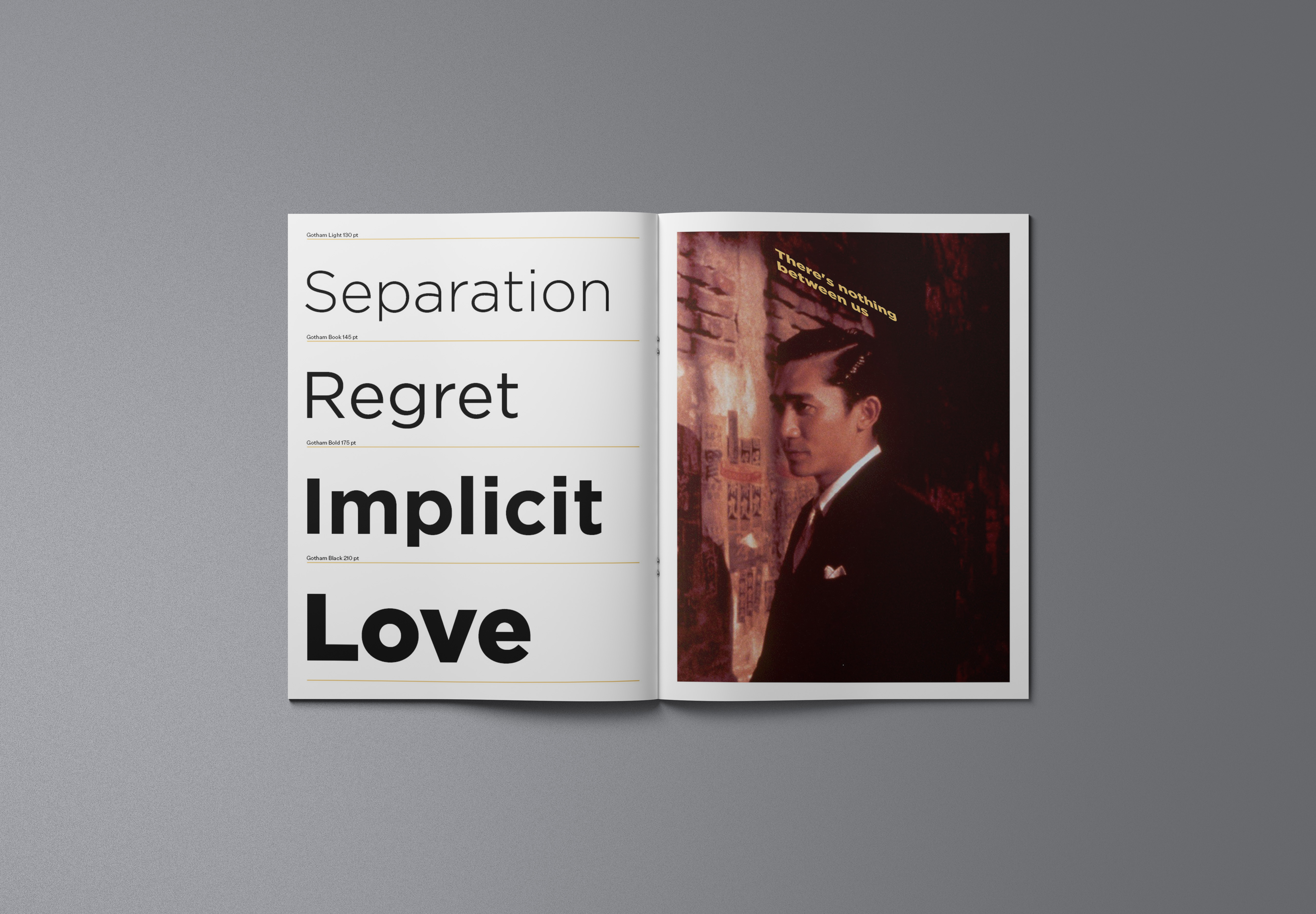 Specimen book for Gotham contains reviews of director Wong Kar-wai's work and keywords from his films to showcase the Gotham font.