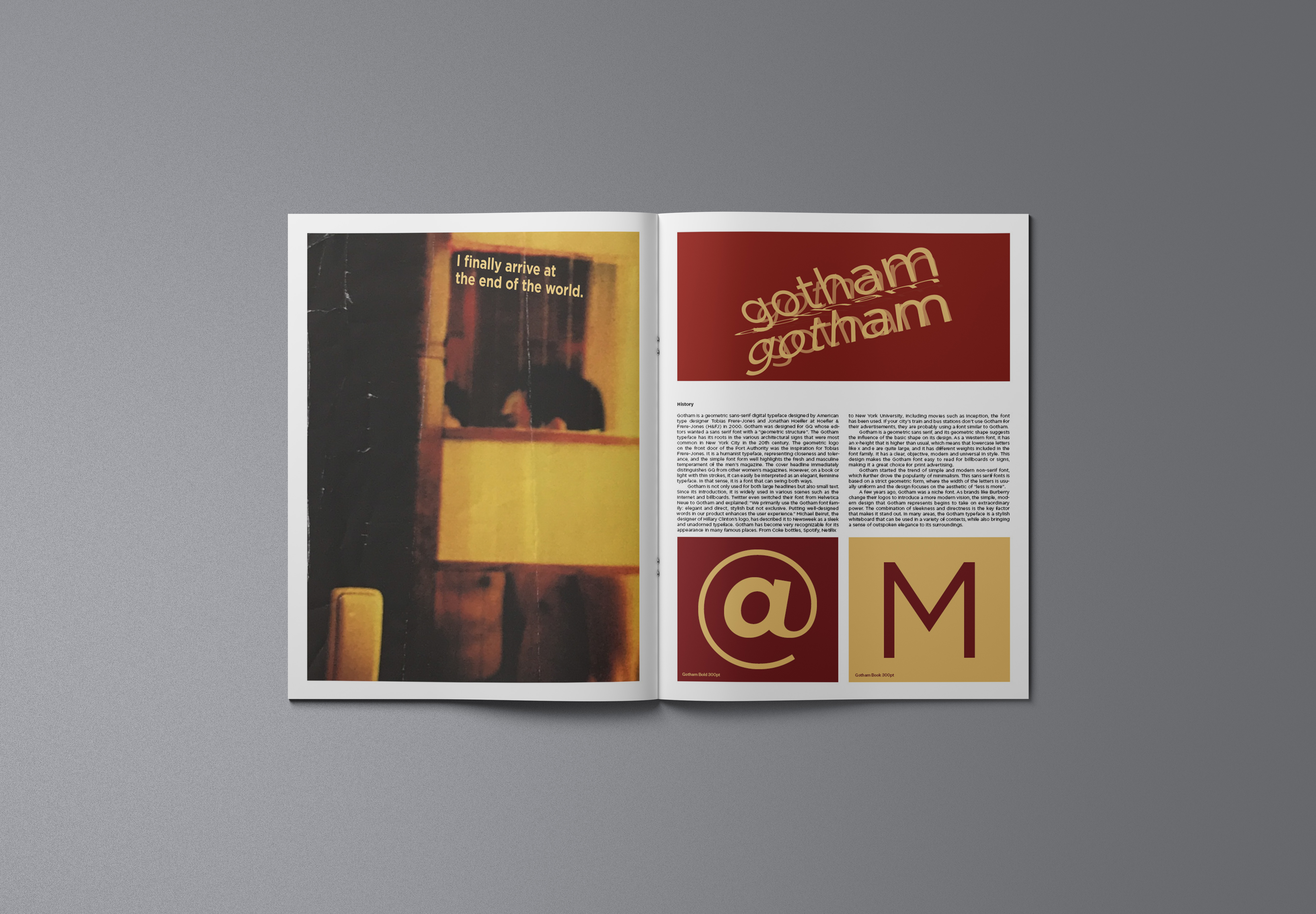 I first tried to combine the font and the image, as well as the type as image, using Adobe After Effects to make the font better blend into the atmosphere of the image. Secondly, I used Gotham font with different sizes, weights, and leading when making this project, which made me understand this font more comprehensively.