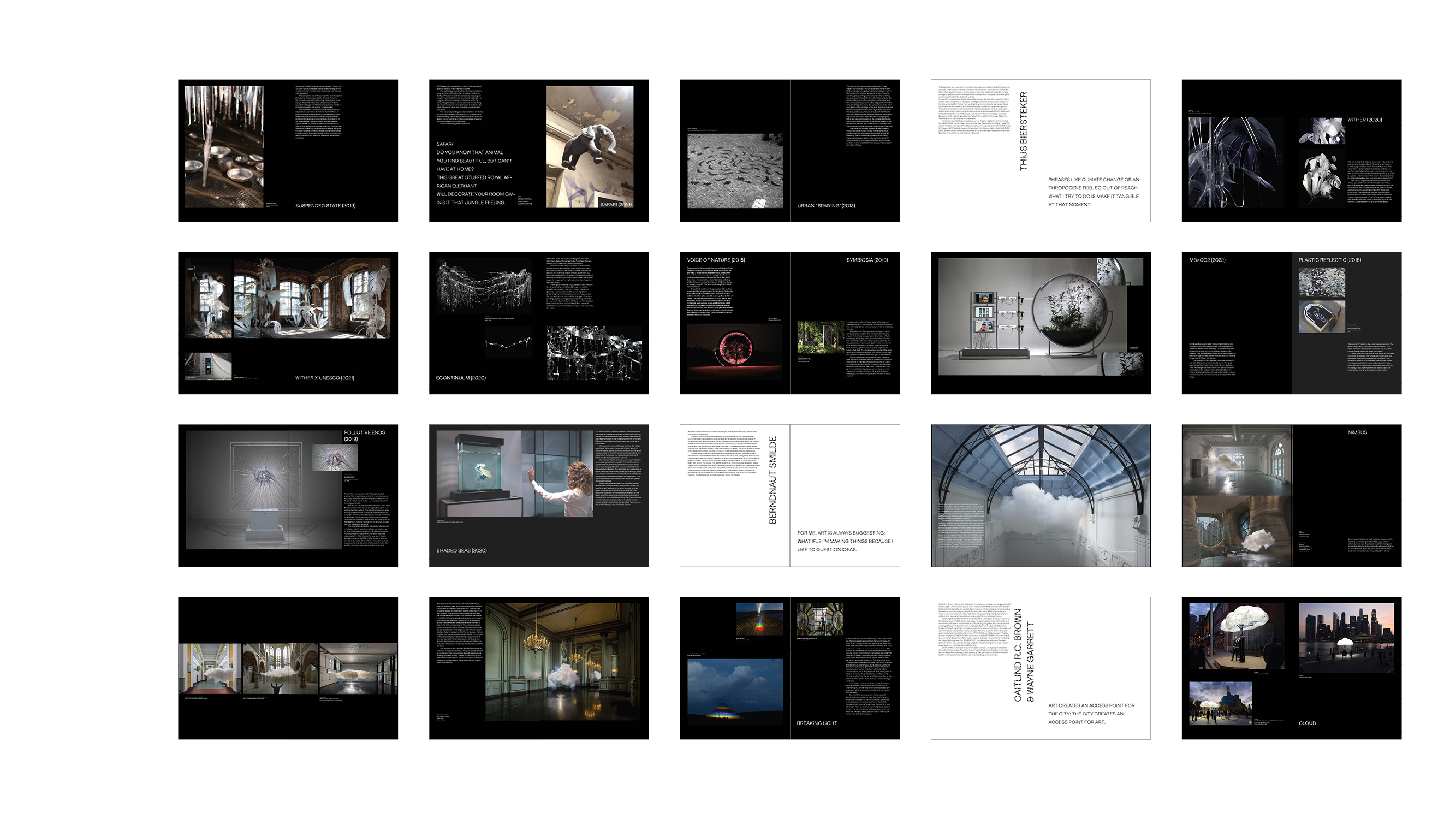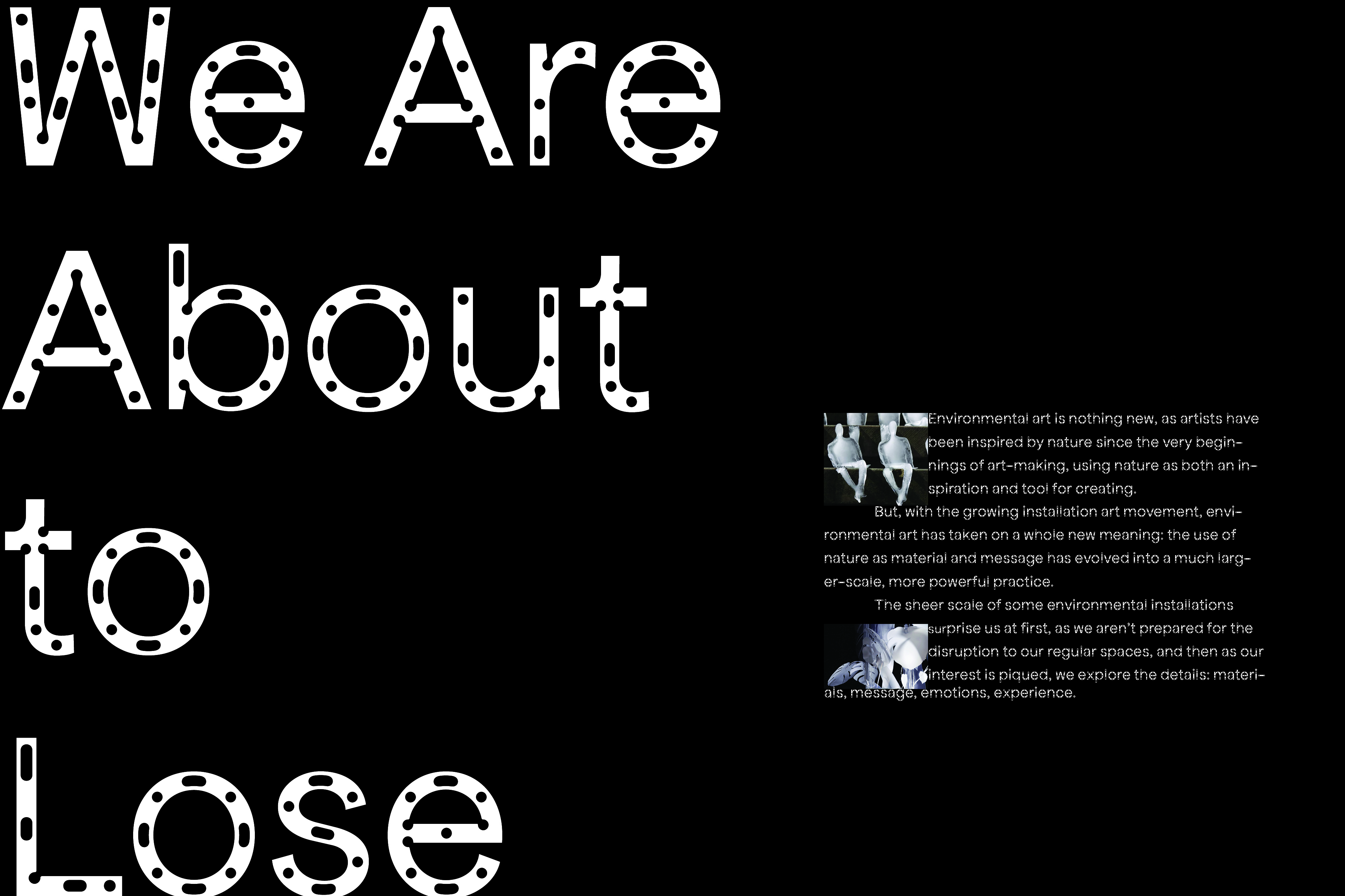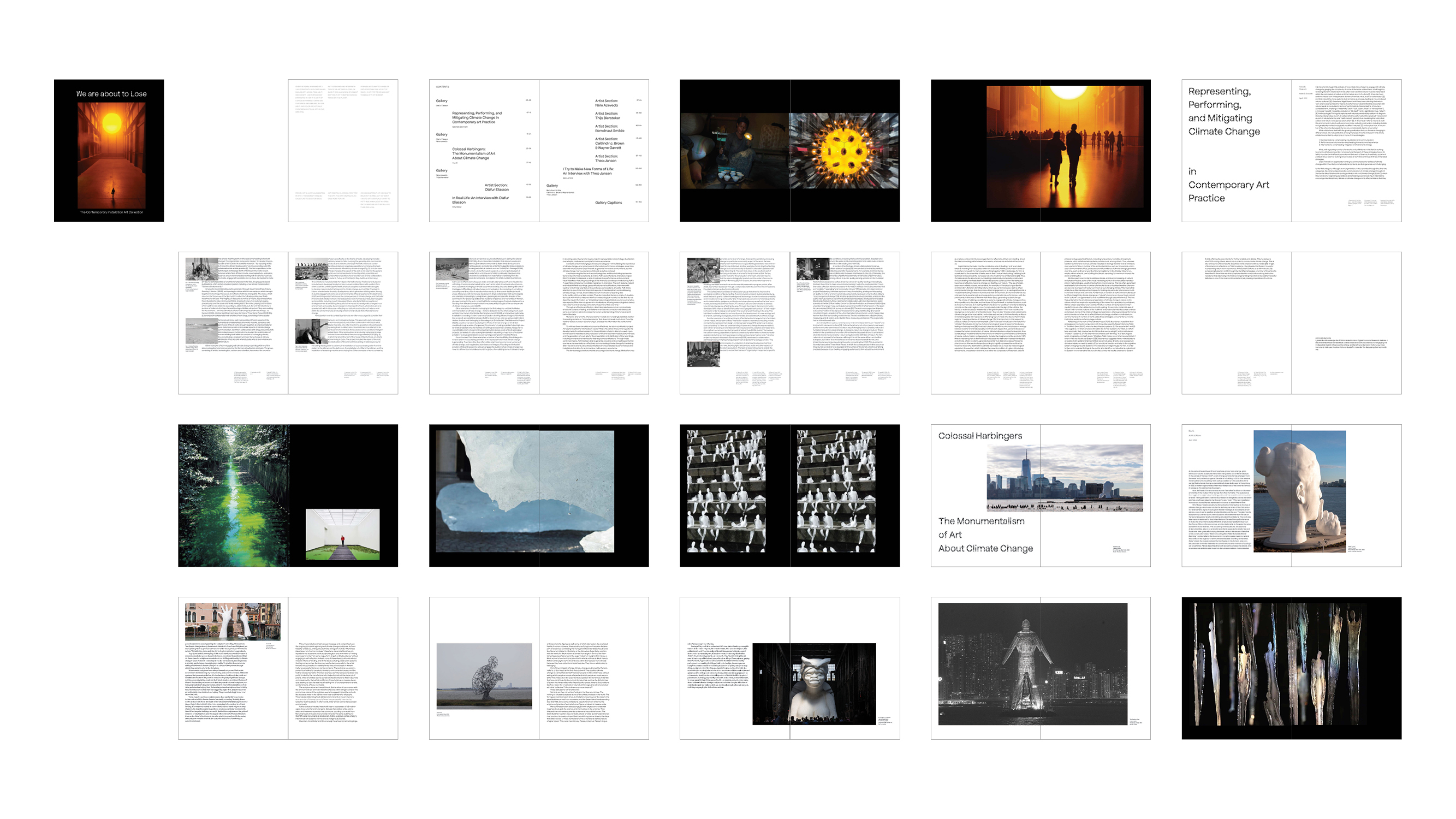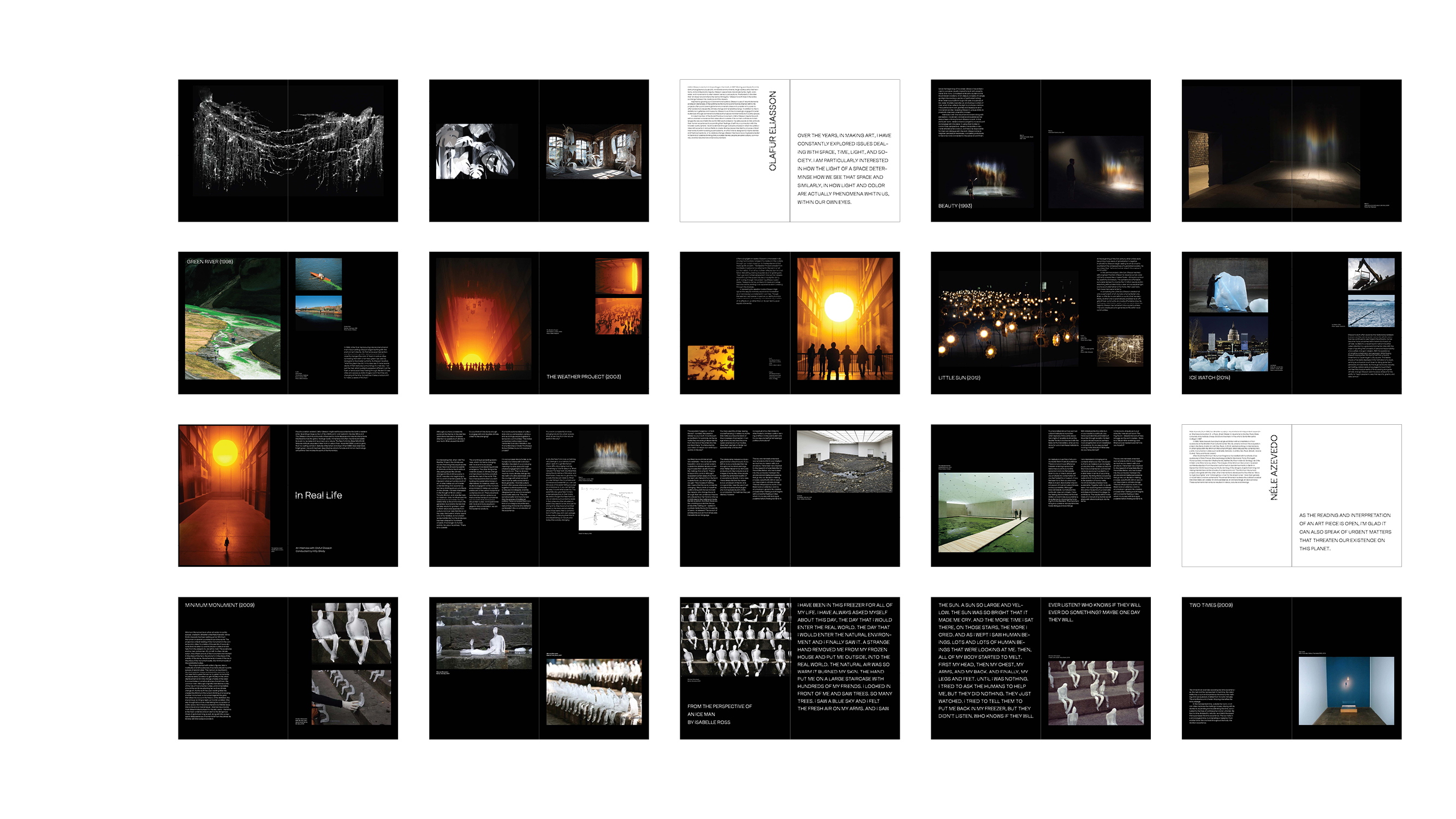 For this project, I am a curator and the designer of a hypothetical exhibition. I need to develop the visual language which will apply to the catalog, promotional materials, and exhibition space. The theme of my exhibition is Climate Change in Contemporary Installation Art. I chose six artists who produce installations about climate change or whose work is interpreted as being related to climate change.