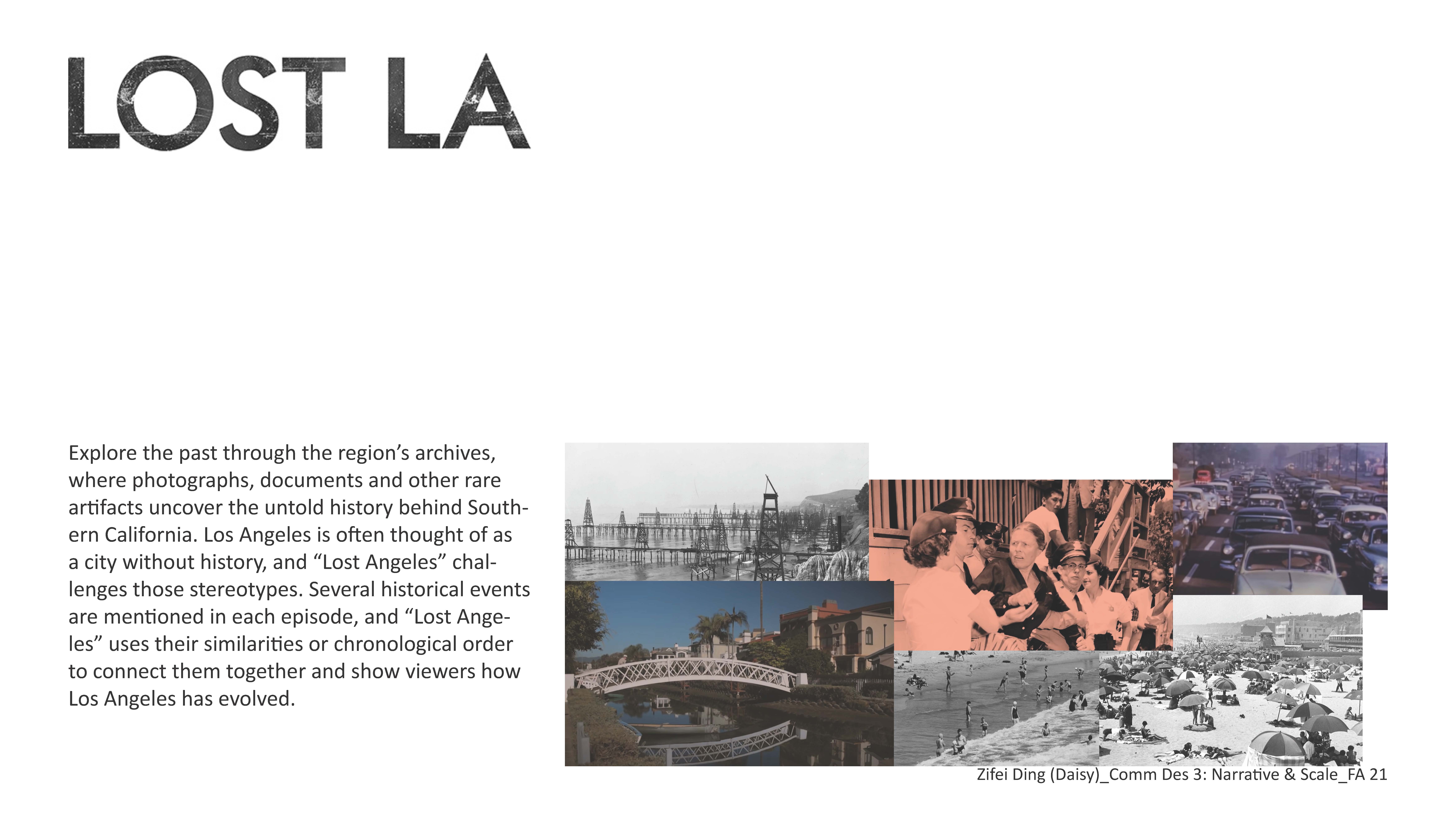 In this project I recreated the logo for the documentary “Lost LA”, which original logo was more traditional and conservative. The majority of the audience will be young people who interested and willing to learn about the history of Los Angeles. Lost LA will have a more modern and mysterious impression of the logo to attract a new and potential audience.