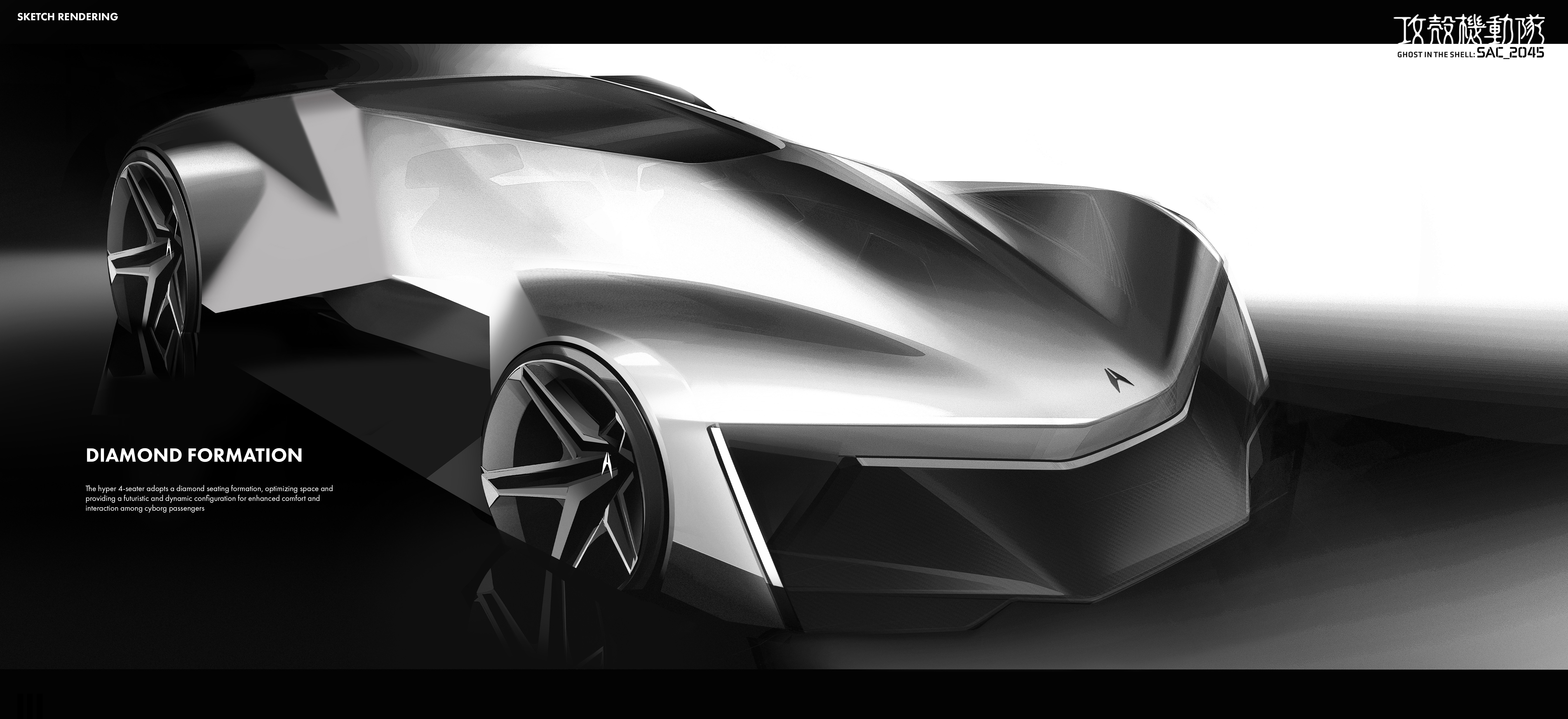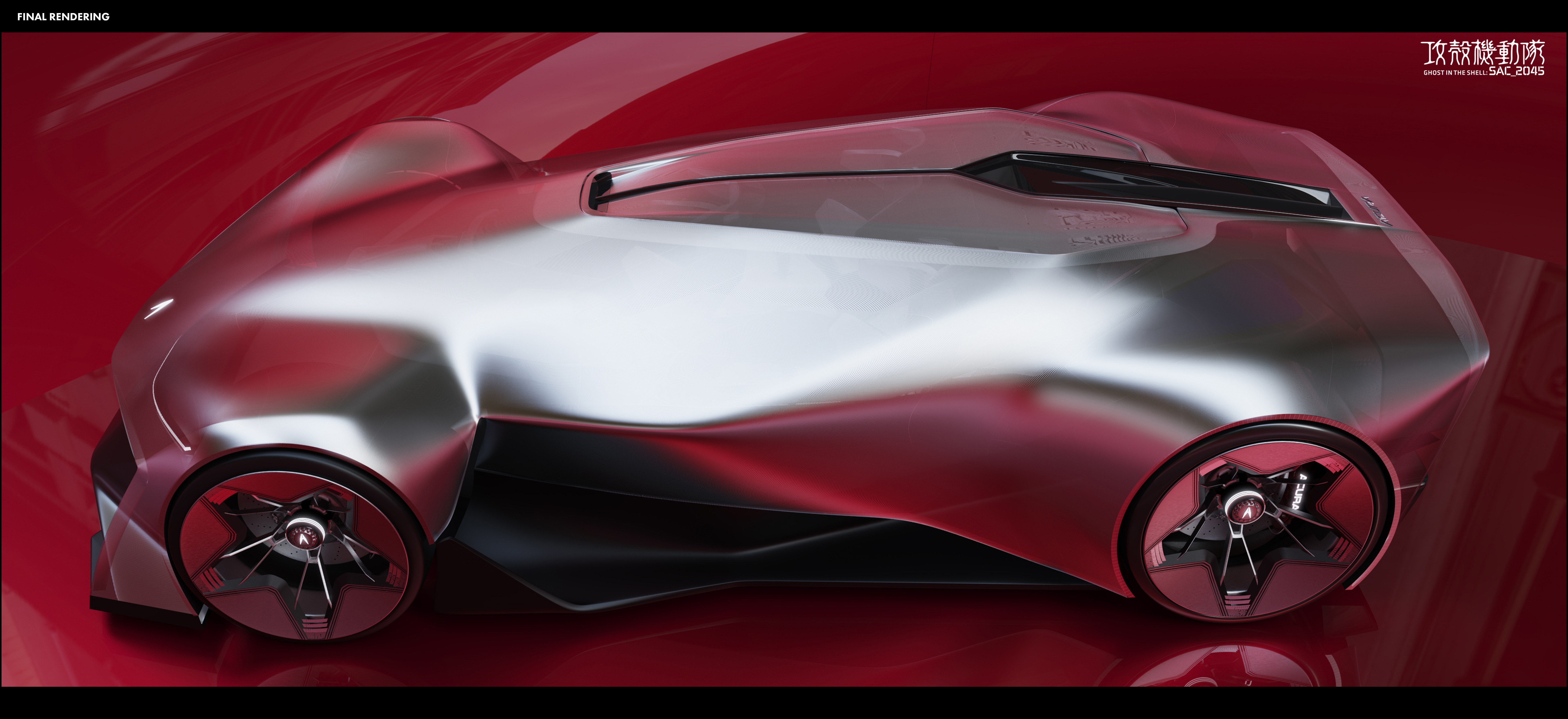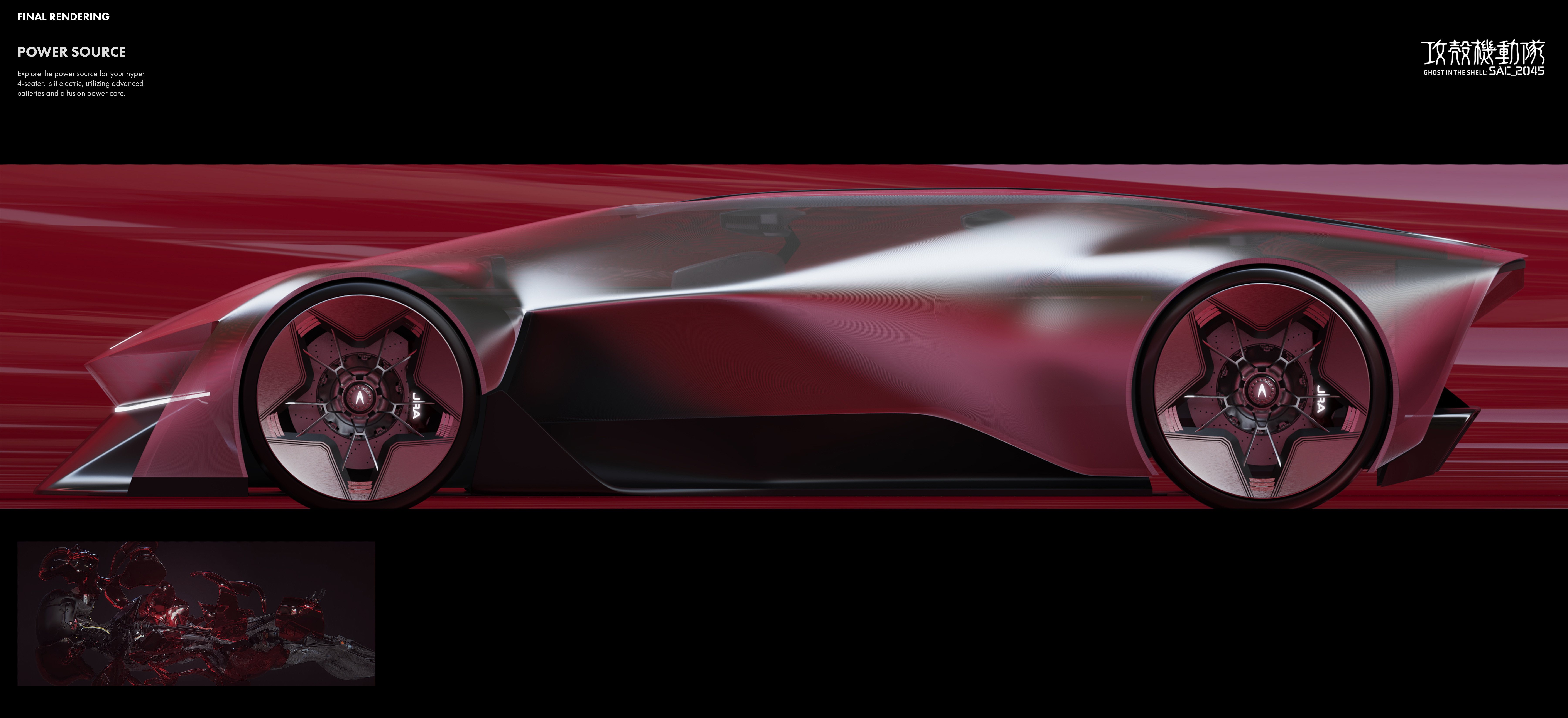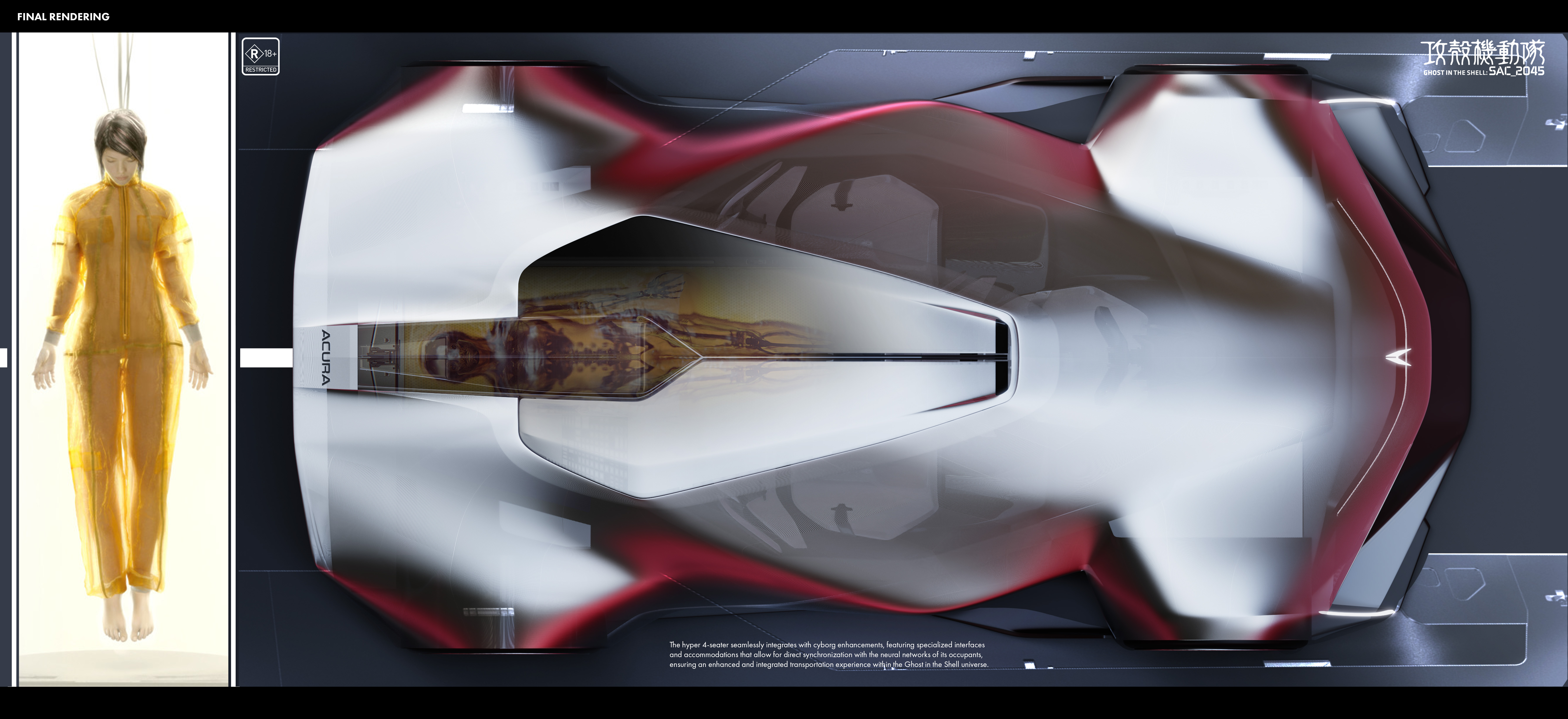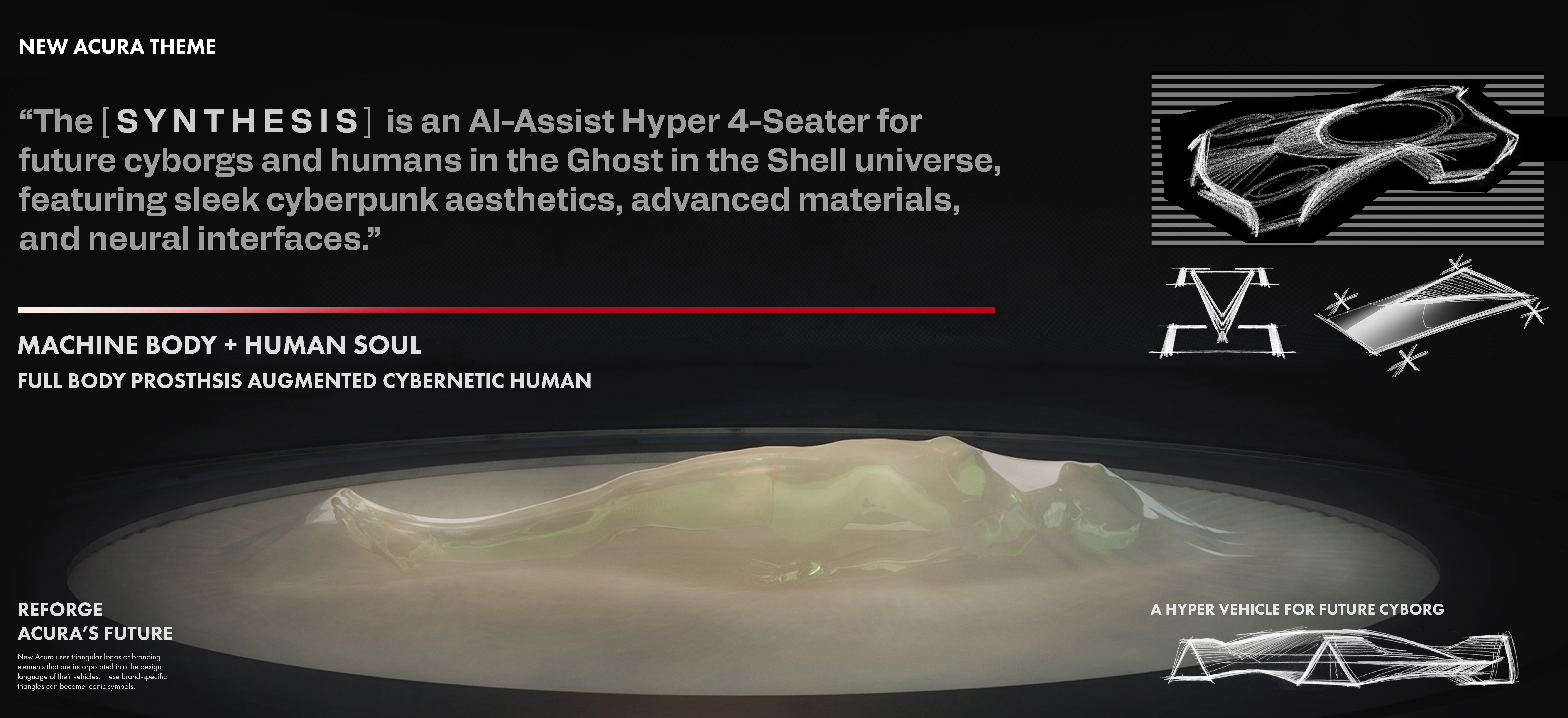 “The [SYNTHESIS] is an AI-Assist Hyper 4-Seater for future cyborgs and humans in the Ghost in the Shell universe, featuring sleek cyberpunk aesthetics, advanced materials, and neural interfaces.”
