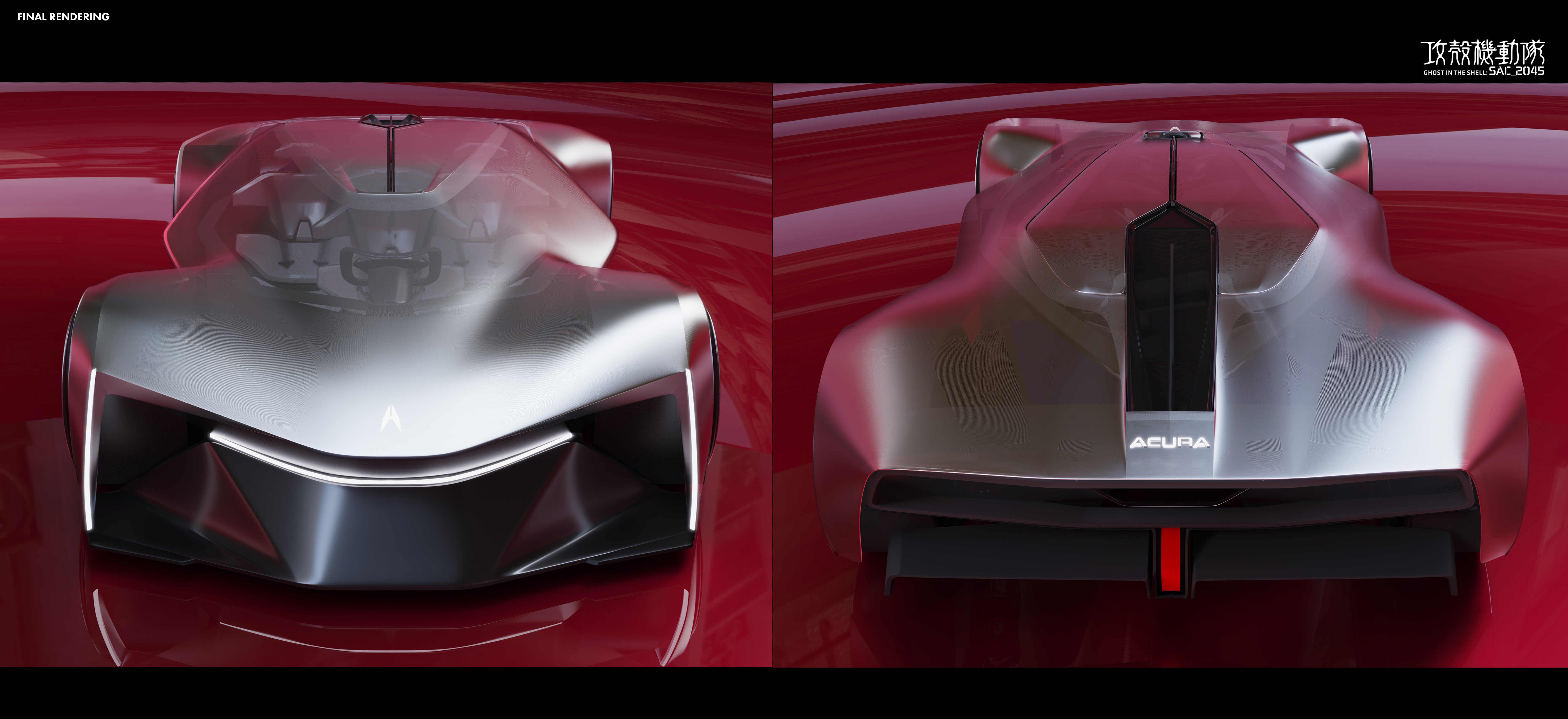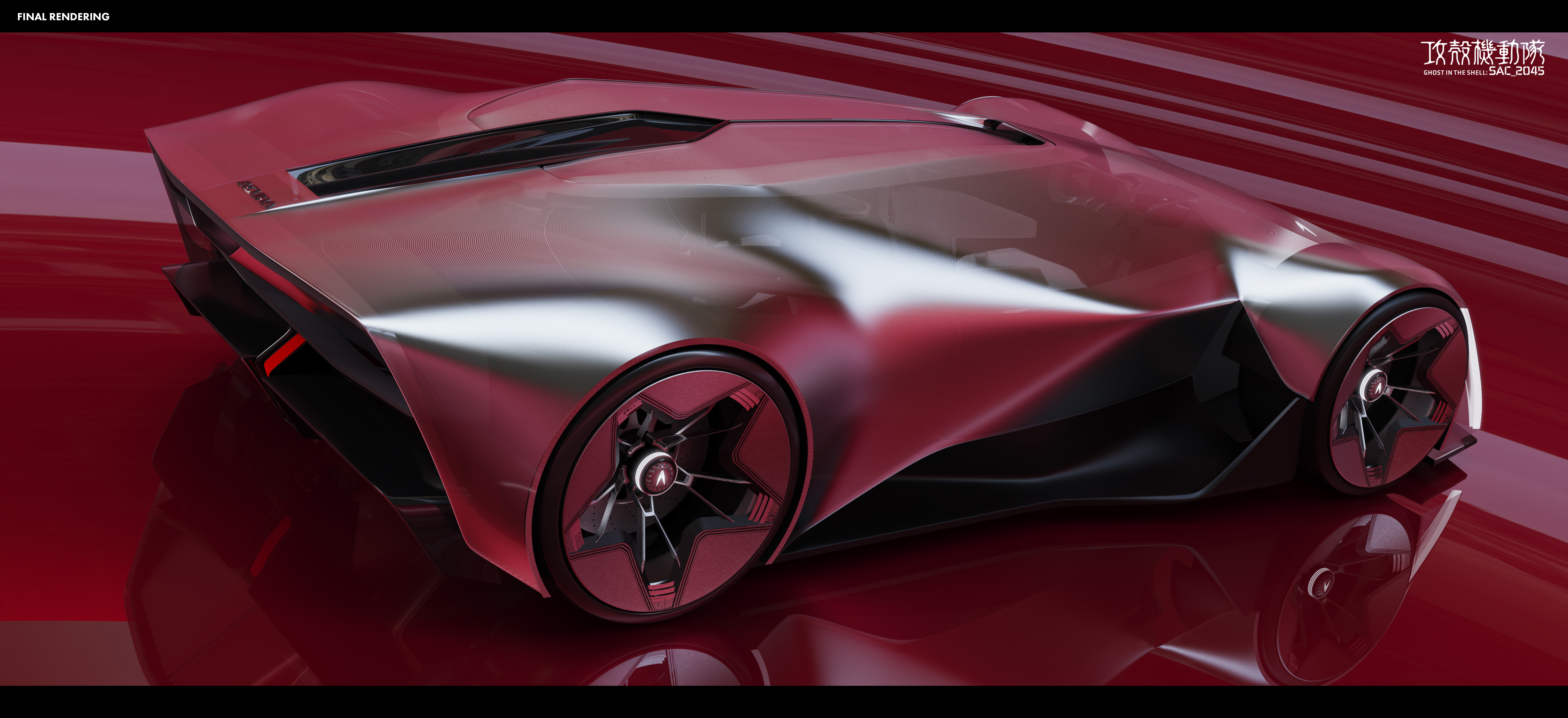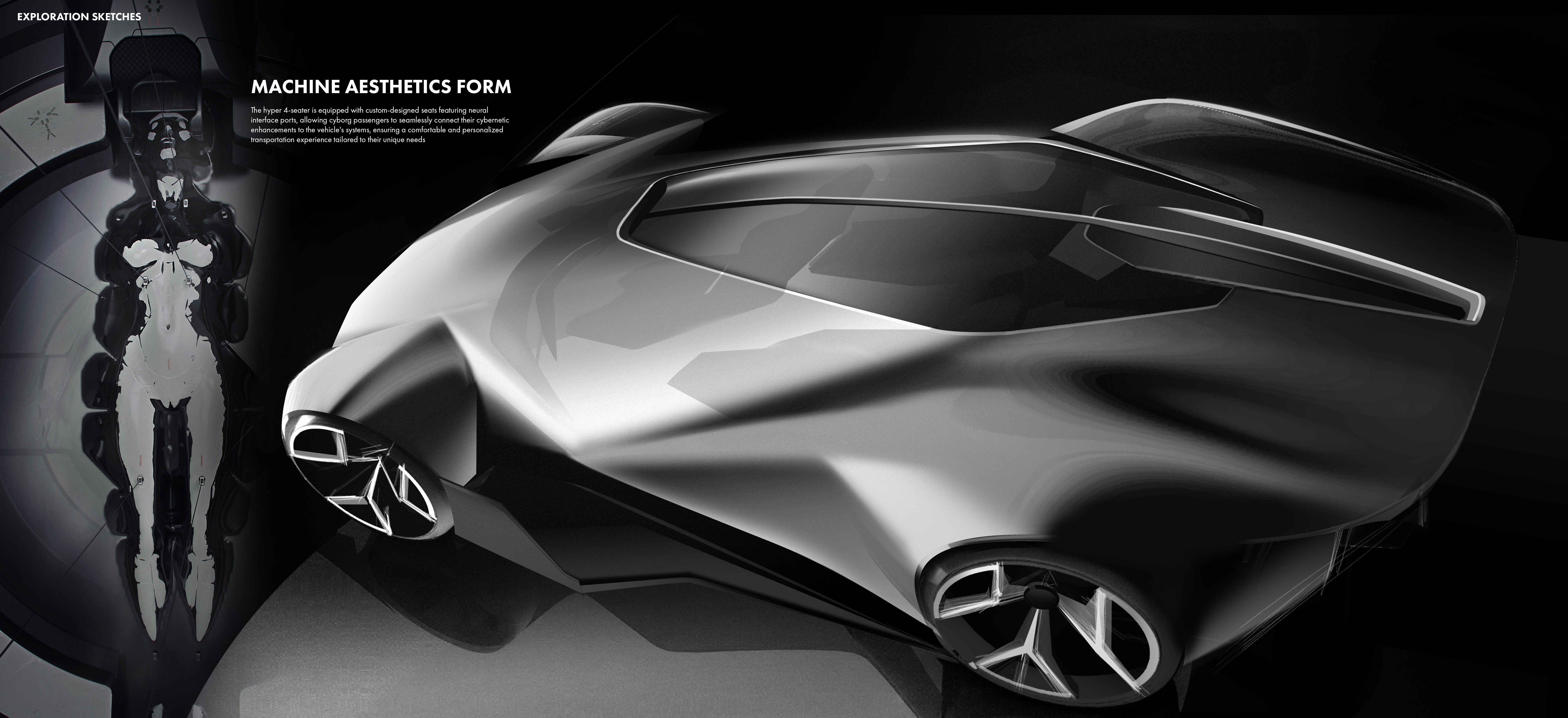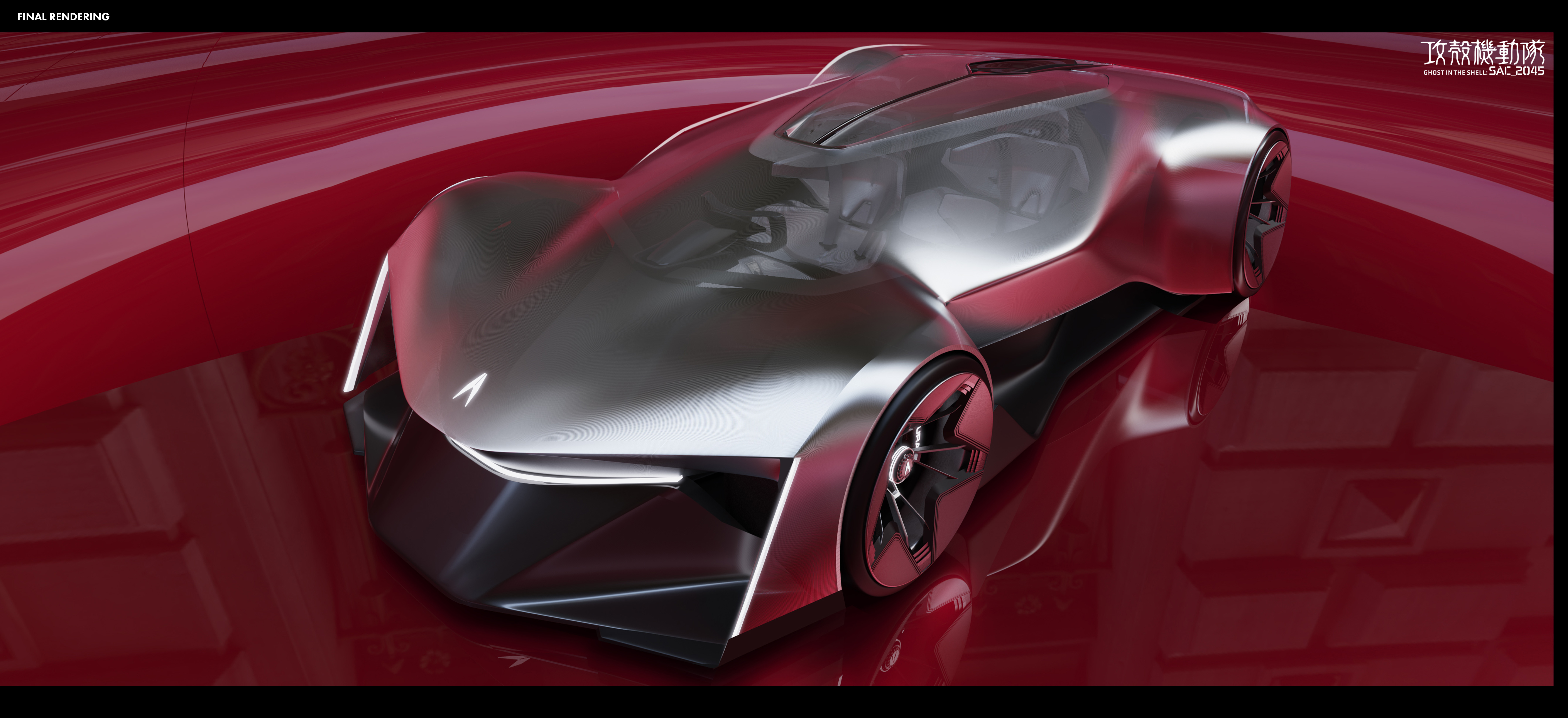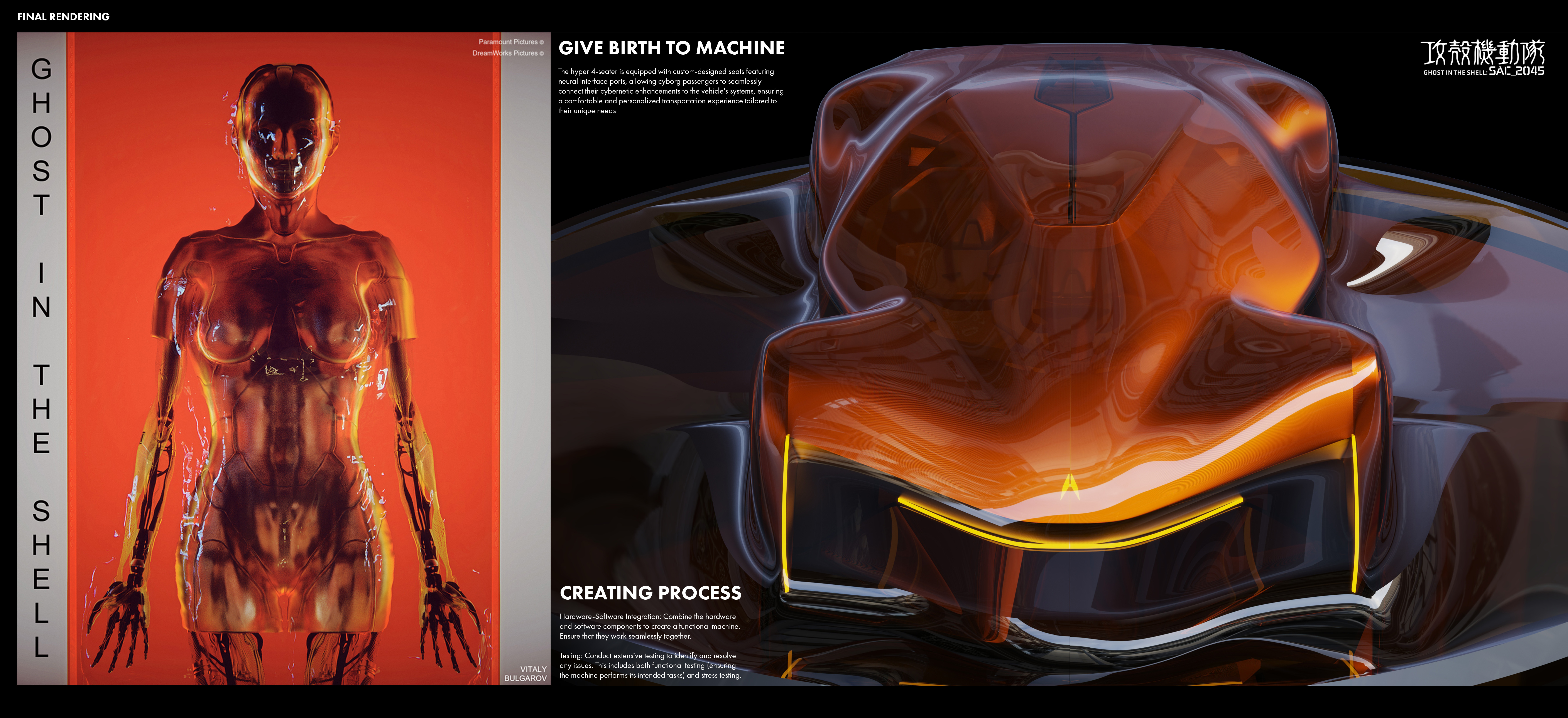 “The [SYNTHESIS] is an AI-Assist Hyper 4-Seater for future cyborgs and humans in the Ghost in the Shell universe, featuring sleek cyberpunk aesthetics, advanced materials, and neural interfaces.”