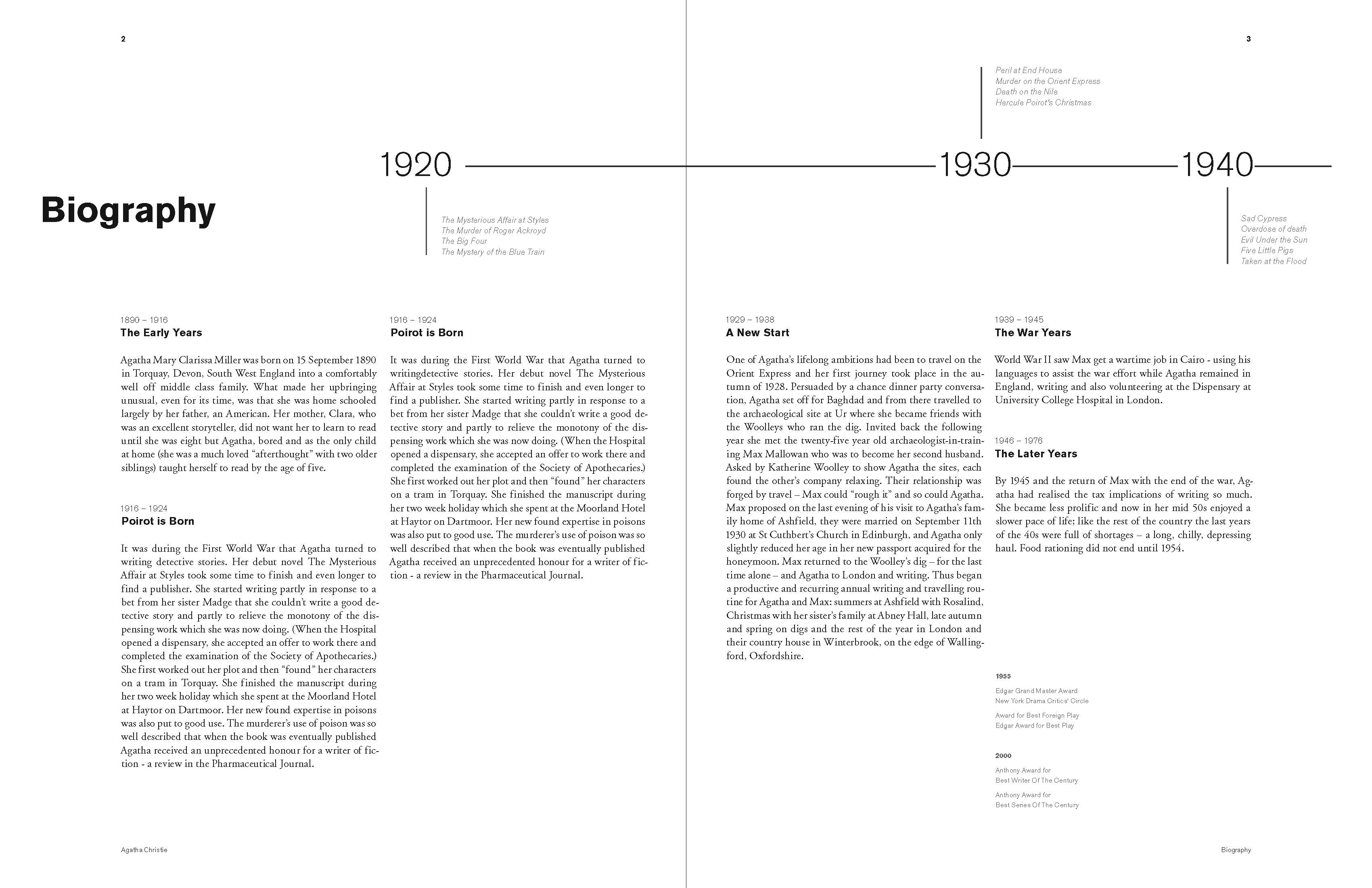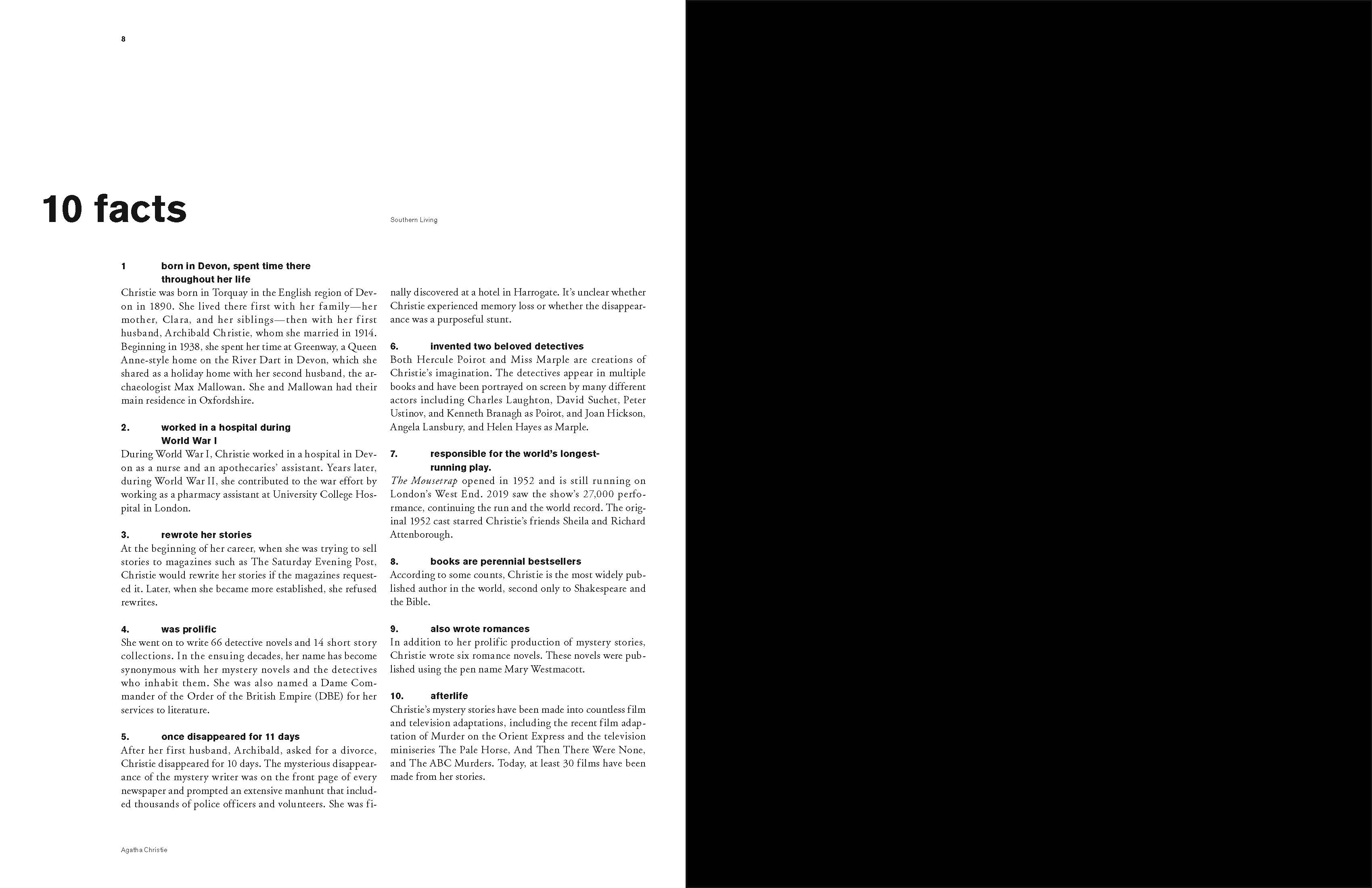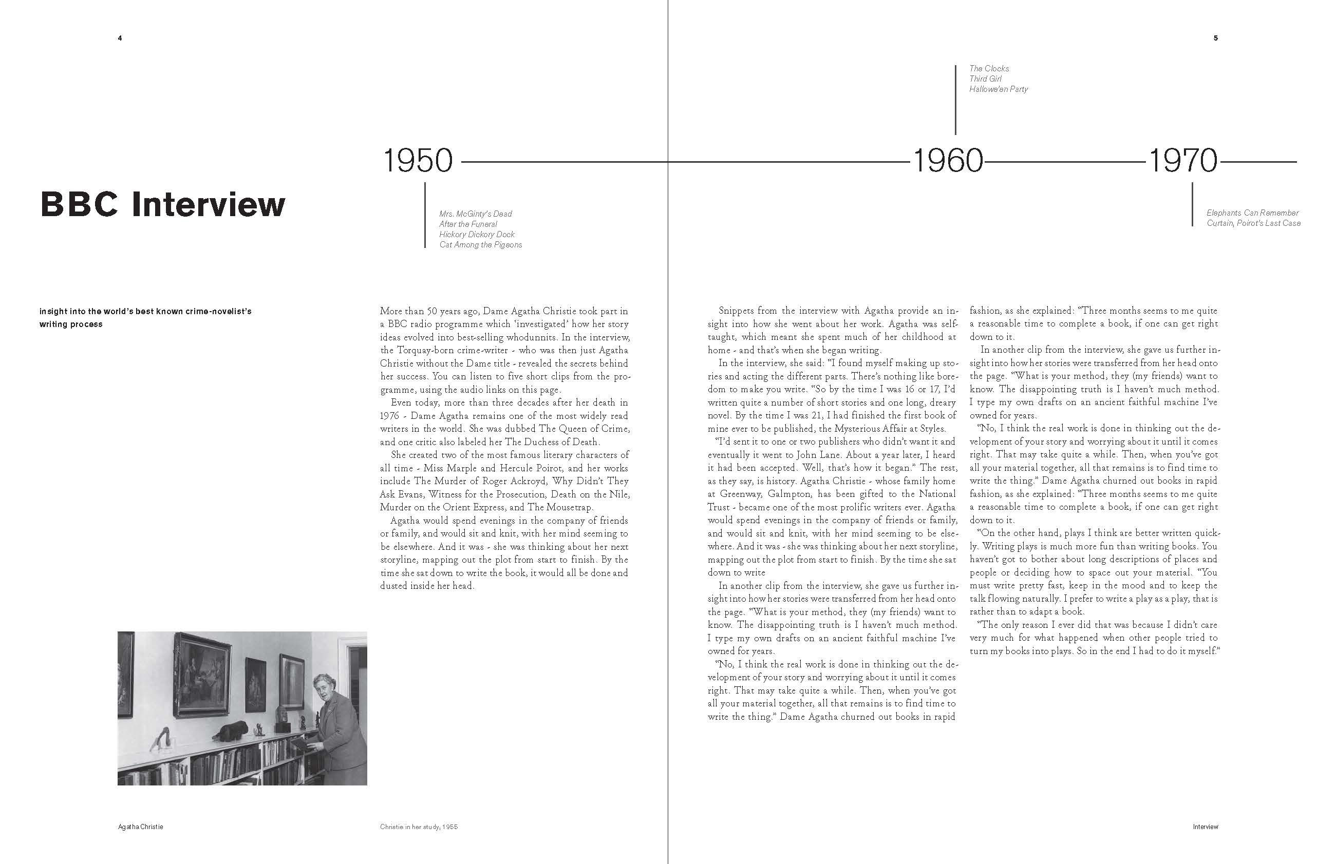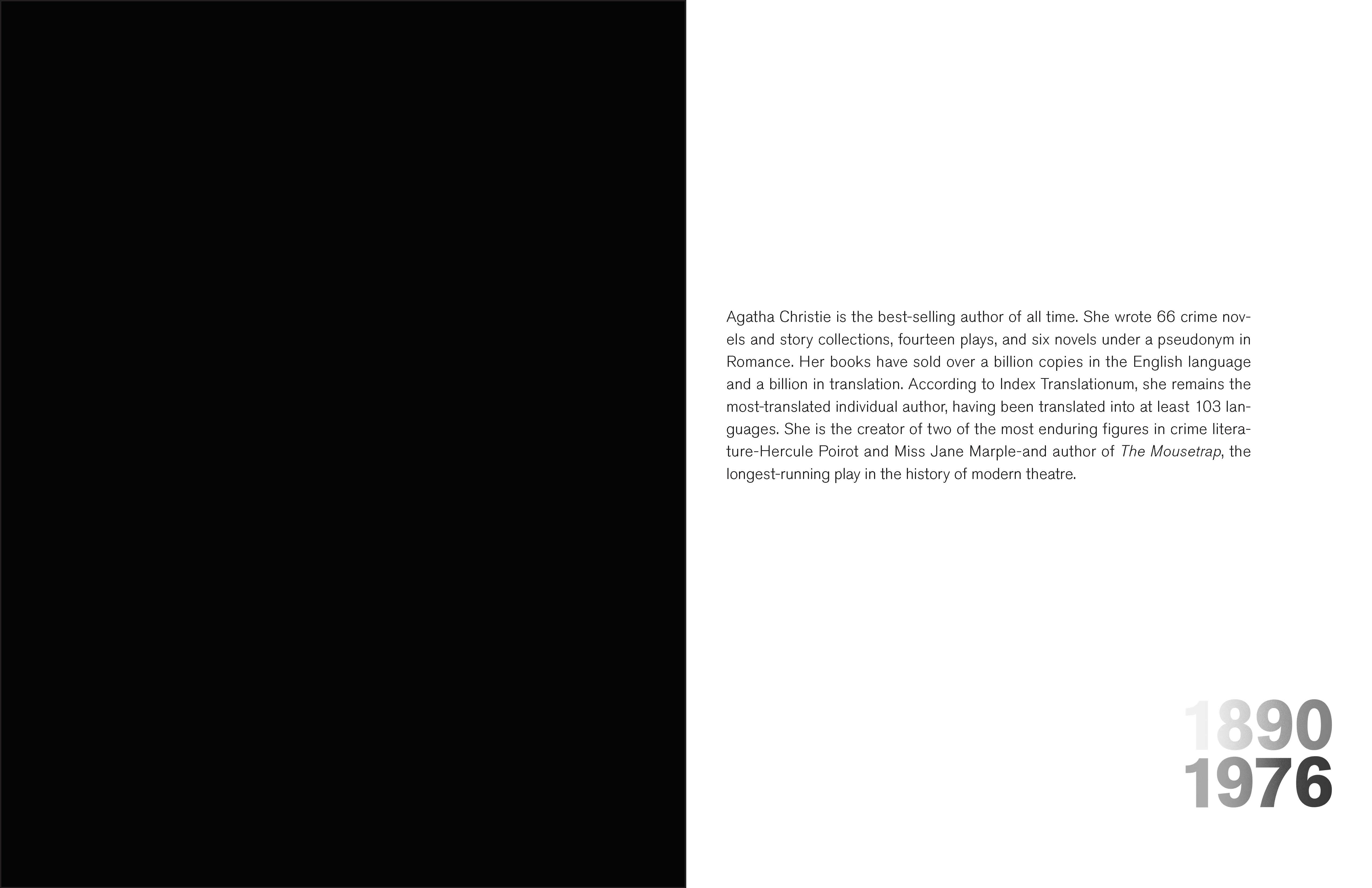 This project is to introduce the famous British mystery novelist Agatha Christie to the audience through the booklet. It includes a biography, interviews, excerpts from her novels, as well as facts about her.