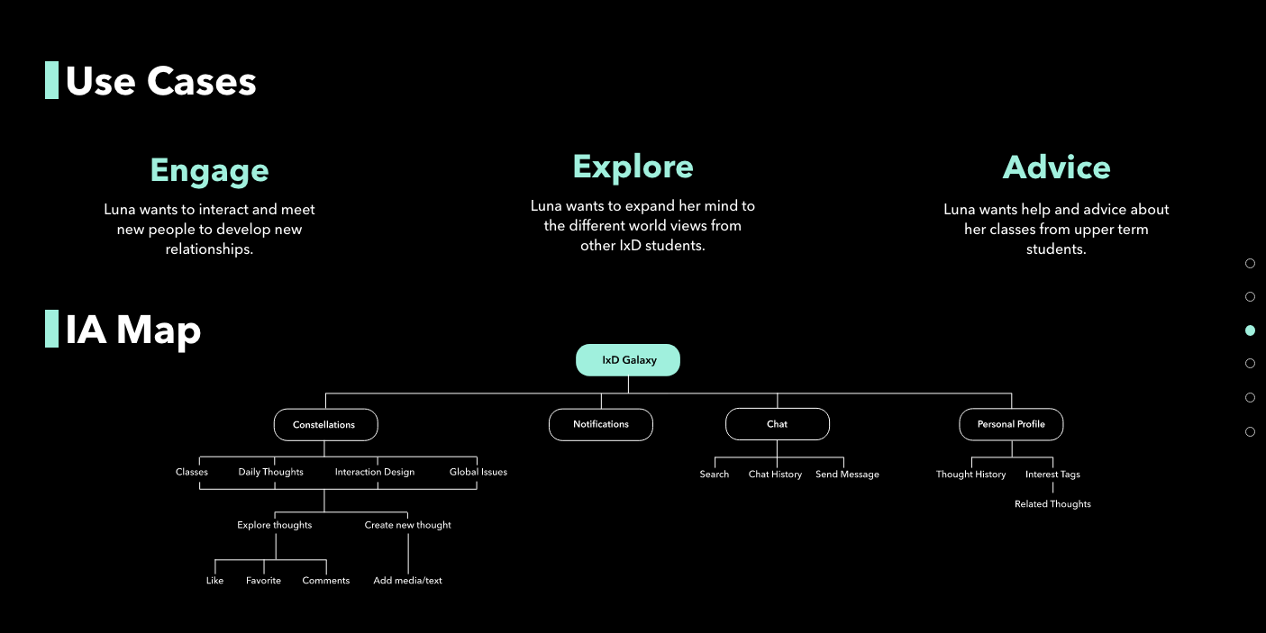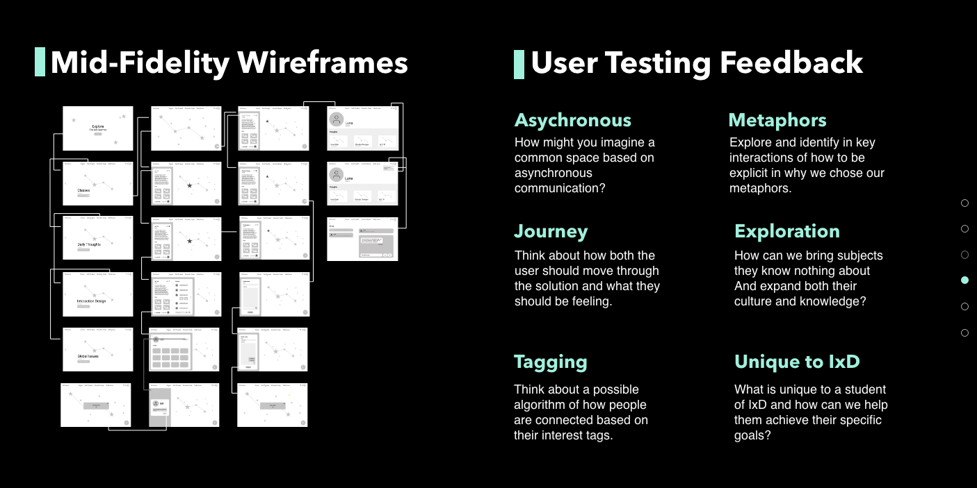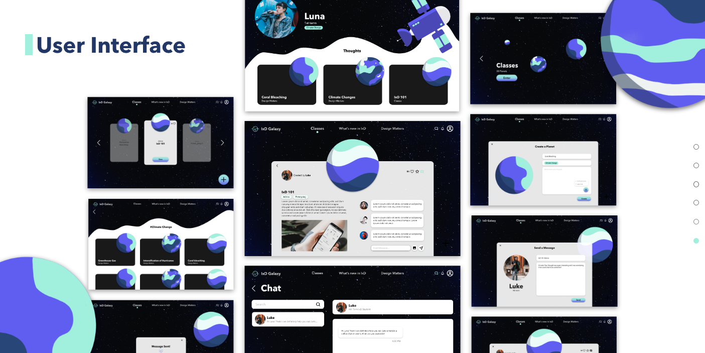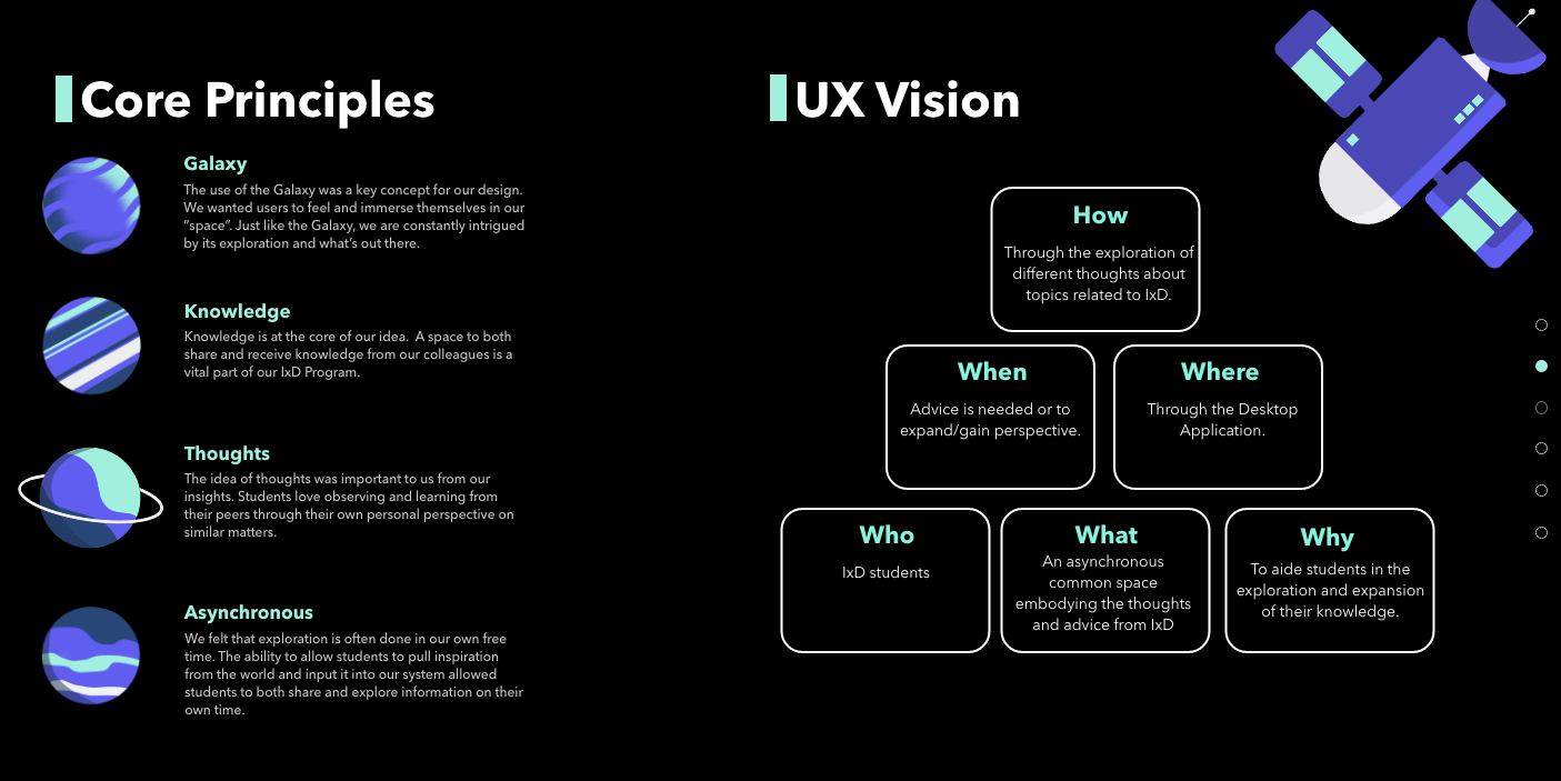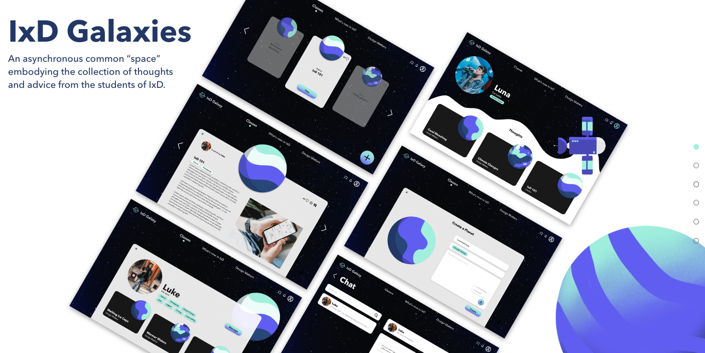 IxD Galaxies is a group project. During the COVID, IxD students no longer have the opportunity to work together on campus. This desktop application offers an asynchronous space for IxD students to share their thoughts and advice.